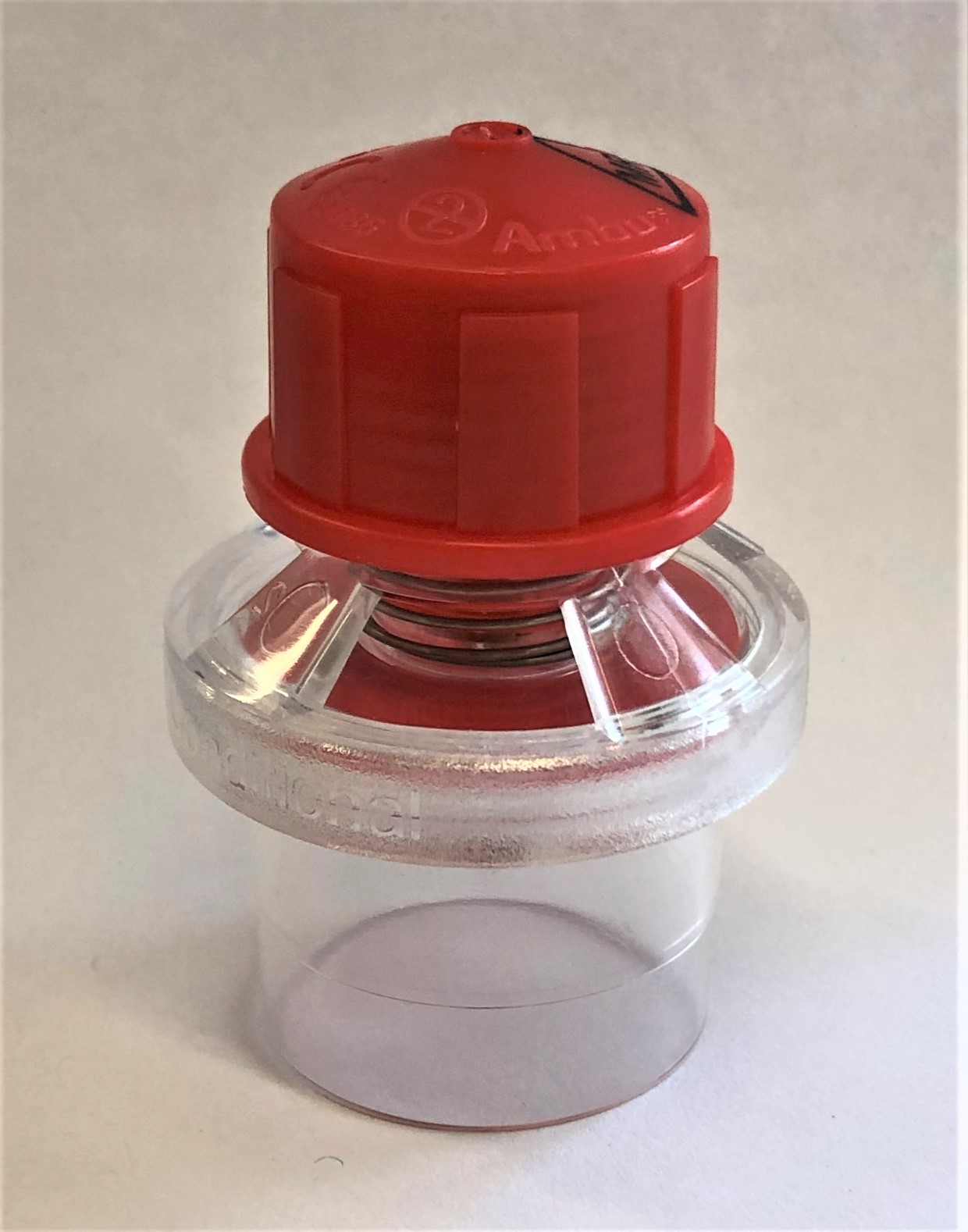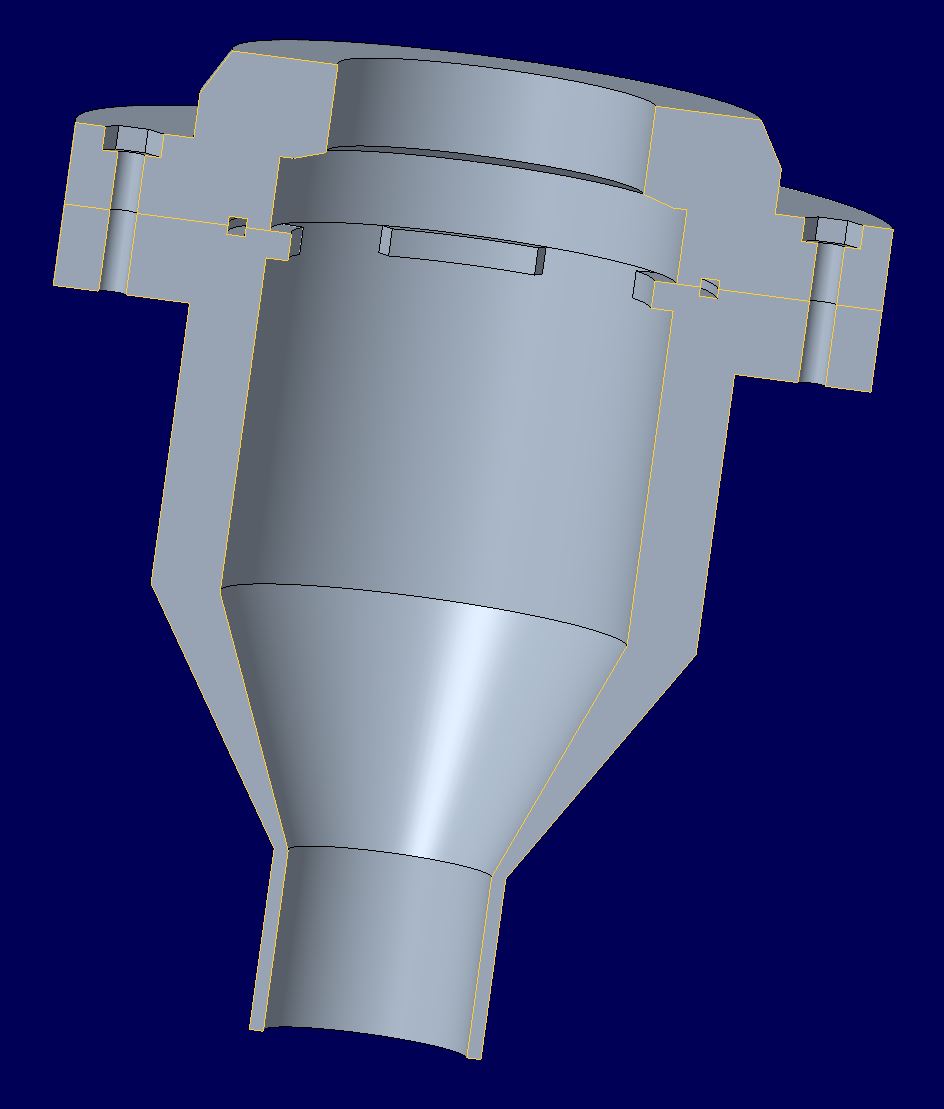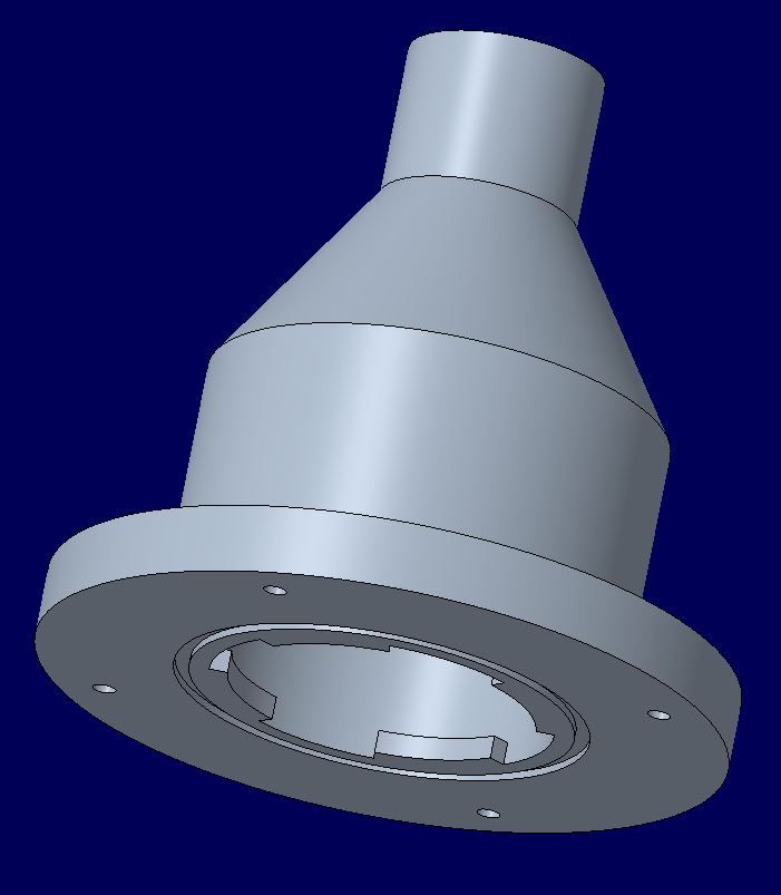 Umbau PEEP Valve Im Beatmungsgerät wird auch unter anderem ein Unterdruck-Sicherheitsventil von der Firma Ambu zum Einmalgebrauch verbaut. Es handelt sich hierbei um ein positiv endexpiratorisches Druckventil, das speziell für Beatmungsgeräte geeignet ist. Es soll verhindern, dass im Gesamtsystem ein Unterdruck herrscht. Diese Funktion jedoch soll umgekehrt werden, da der Druck vorab eingestellt wird. Aus diesem Grund wird ein 3D-Druck-Teil für den Umbau des Ventils benötigt. ![]() Abb.: Ambu Unterdruck-Sicherheitsventil Konstruktionsentwurf Aufgrund der gegeben Bauform des Unterdruck-Sicherheitsventils (PEEP Ventil), muss der Umbau aus zwei Teilen bestehen, die daraufhin miteinander verbunden werden müssen. Nach Einstellen des Druck mittels Drehen des roten Knopfs, wird Teil 1 der Konstruktion darüber gestülpt. Oben befindet sich eine Passung mit einem Außendurchmesser von 25,5 mm und einem Innendurchmesser von 22,4 mm mit der das Bauteil an einen HME-Filter angeschlossen werden kann. Teil 1 besitzt außerdem nach innenliegende Laschen, die sich den Zwischenräumen des PEEP Ventils anpassen, um ein Verschieben des gesamten Umbaus zu vermeiden. Das Gegenstück zu Teil 1 passt sich der Form des Ventils an und liegt an der dessen leicht schrägen Kante auf. Beide Teile besitzen eine Nut für einen O-Ring mit dem Durchmesser 50 mm und der Dicke 2 mm, um eine dichte Verbindung zu schaffen. Die Verbindung beider Bauteile wird mittels vier M3-Schrauben geschaffen. Hierfür werden in Teil 1 vier Durchgangslöcher mit einem Durchmesser von 3 mm vorgesehen und im Gegenstück vier Vertiefungen für 5,6 mm Sechskantmuttern. Die Gesamthöhe der Konstruktion liegt bei 106 mm wobei der äußerste Durchmesser 90 mm beträgt.