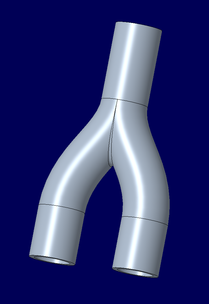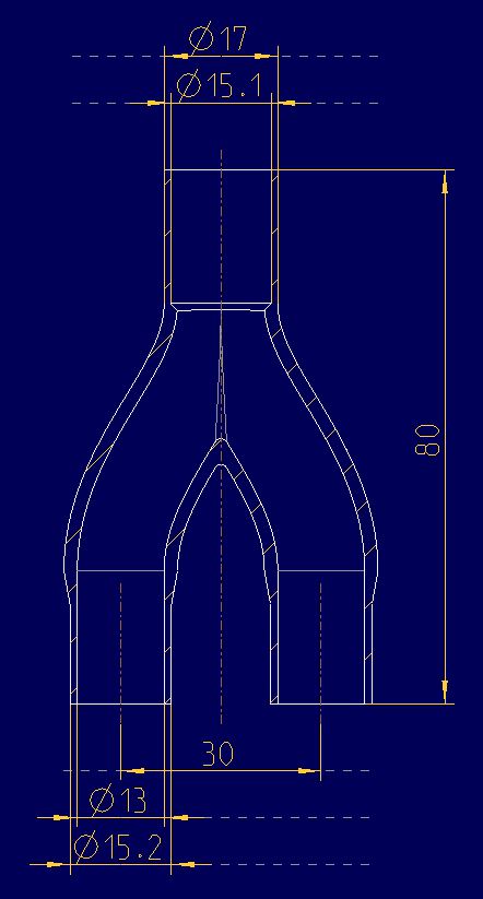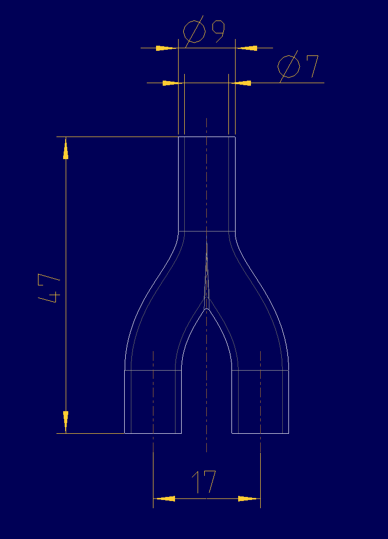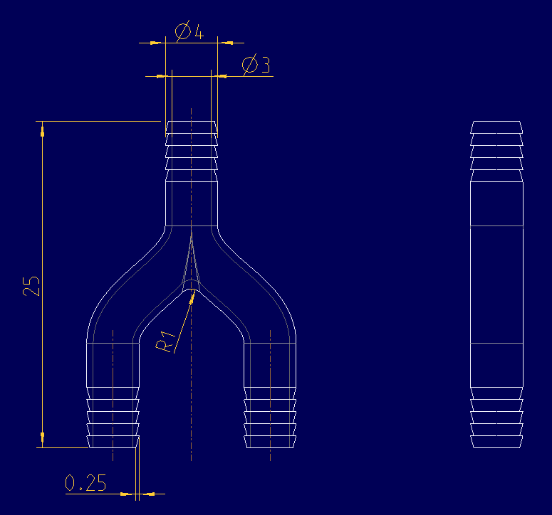Der Außendruchmesser wurde gleich dem Innendurchmesser des Schlauchs gewählt, um eine dichte Verbindung gewährleisten zu können. Die Gesamthöhe beträgt 25 mm. Durch ein Tannenbaumprofil an den Enden soll ein Verrutschen des Schlauchs verhindert werden. Eine ebene Flächen ermöglicht das vertikale Drucken des Bauteils. Die geringe Wandstärke ergibt sich aus der Größe des Innendurchmessers des Y-Stücks, der so groß wie möglich sein sollte. Dies stellt jedoch ein Risiko bezüglich der Dichtheit des Bauteils dar. Auch der halbkreisförmige Bogen könnte Schwierigkeiten beim drucken verursachen. Aus diesen Gründen wurde die Konstruktion verworfen. Zweiter Konstruktionsentwurf