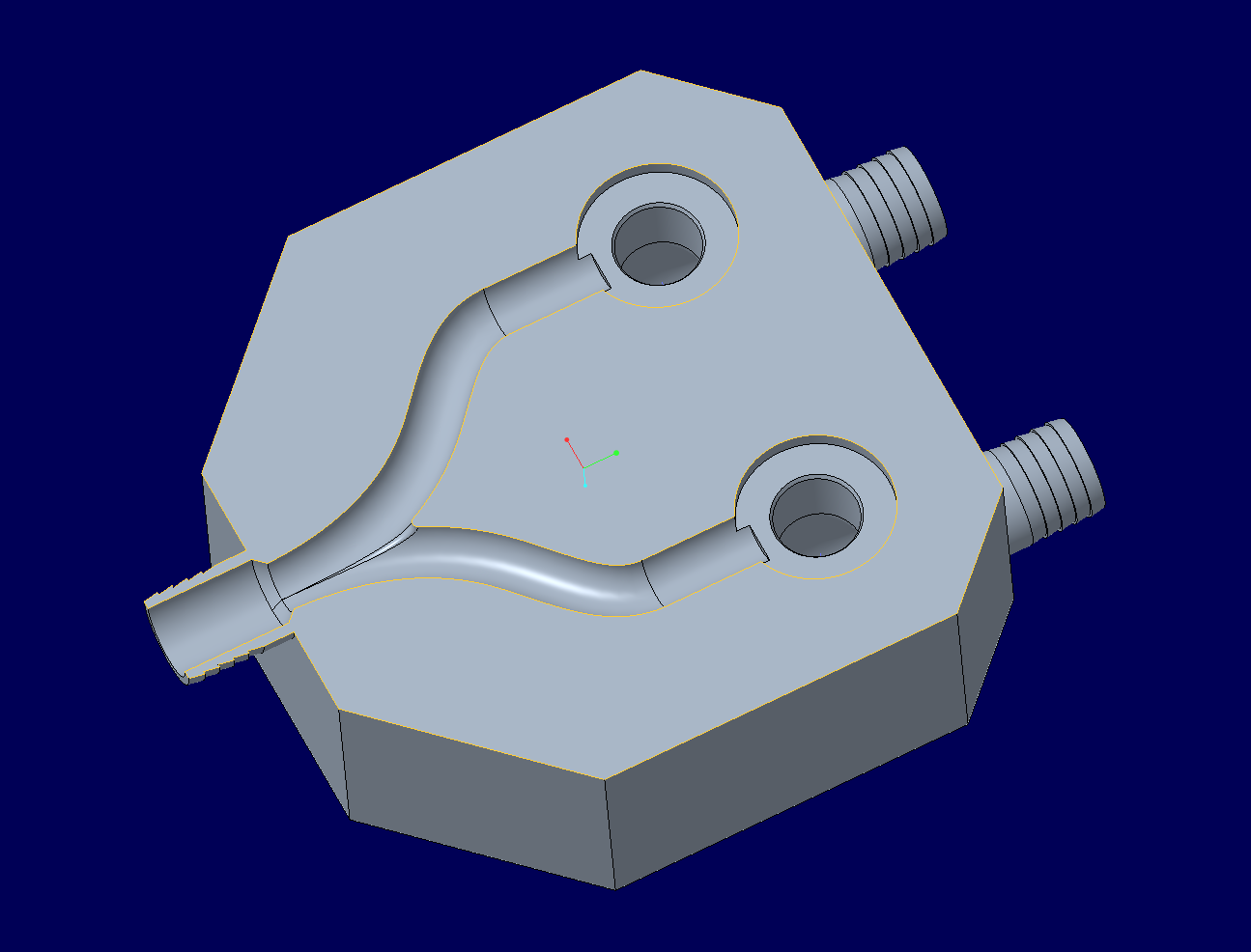 Mischgehäuse Ein weiteres Team des Beatmungsgeräts ist das Team Mixing Chamber Design, das für das Mischverhältnis des Sauerstoffgemischs für den Patienten verantwortlich ist. Für diese Komponente soll ein Bauteil konstruiert werden, das zwei Ventile vertikal aufnimmt. Für jedes Ventil gibt es einen Inlet, wobei es sich zum einen um die Zufuhr von Sauerstoff und zum anderen um die Zufuhr von Luft handelt. Die beiden Outlets der Ventile werden zu einem Outlet zusammengeführt und über einen Schlauch weitergeleitet. Da auch dieses Bauteil mit Sauerstoff in Berührung kommt, sollte das Material sauerstoffresistent sein und für den finalen Druck PA verwendet werden. Konstruktionsentwurf Die Maße zur Aufnahme der Ventile ist dem Datenblatt der dazugehörigen Ventile abzunehmen, wobei deren enge Toleranzen durch den 3D-Druck nicht eingehalten werden können und daher erst einmal vernachlässigt werden. Die Anschlüsse der Inlets und des Outlets werden den Maßen des Schlauchs angepasst und müssen eine dichte Verbindung vorweisen.