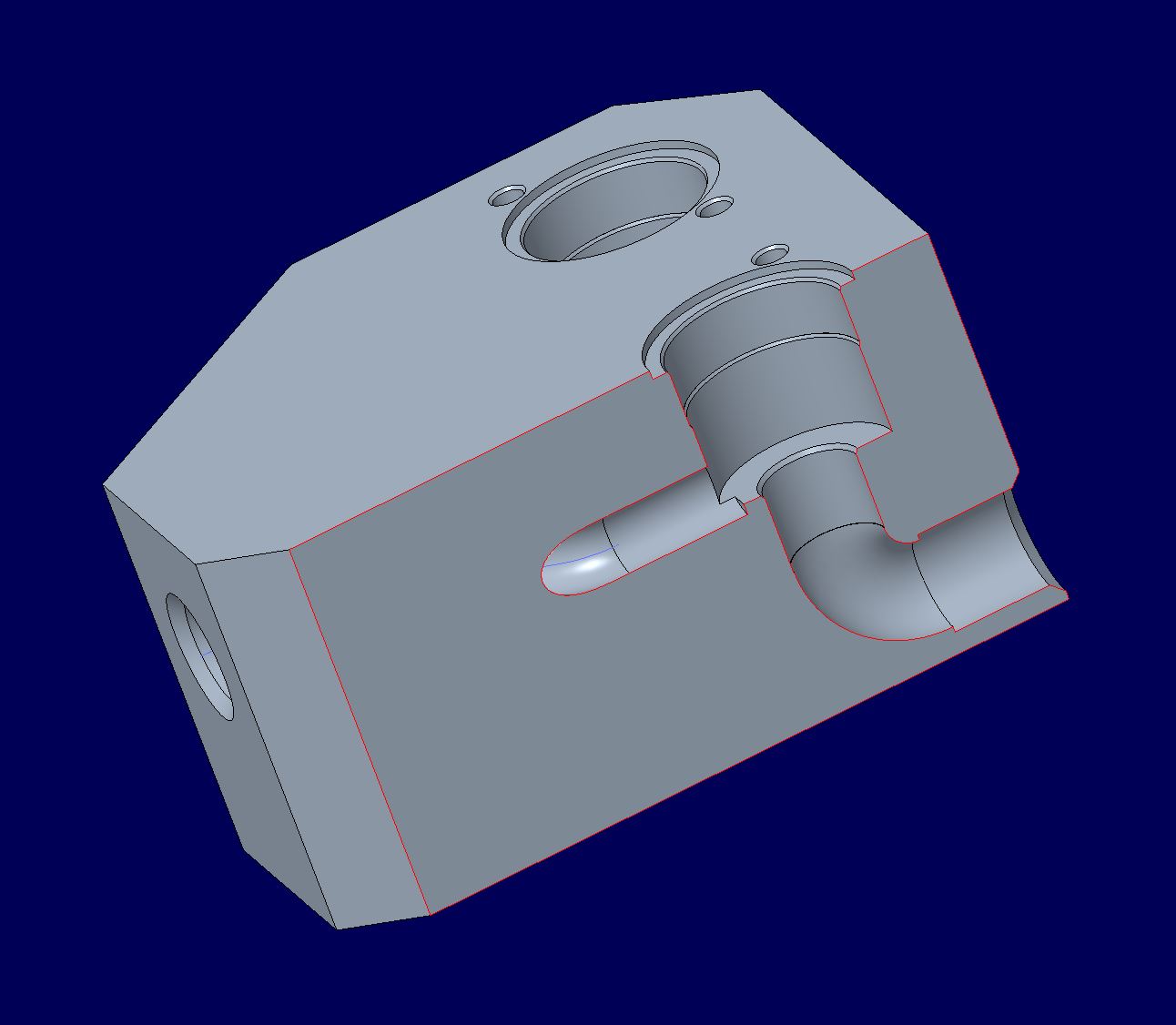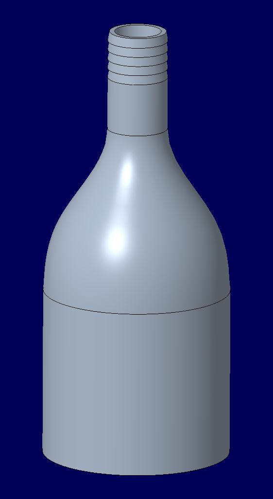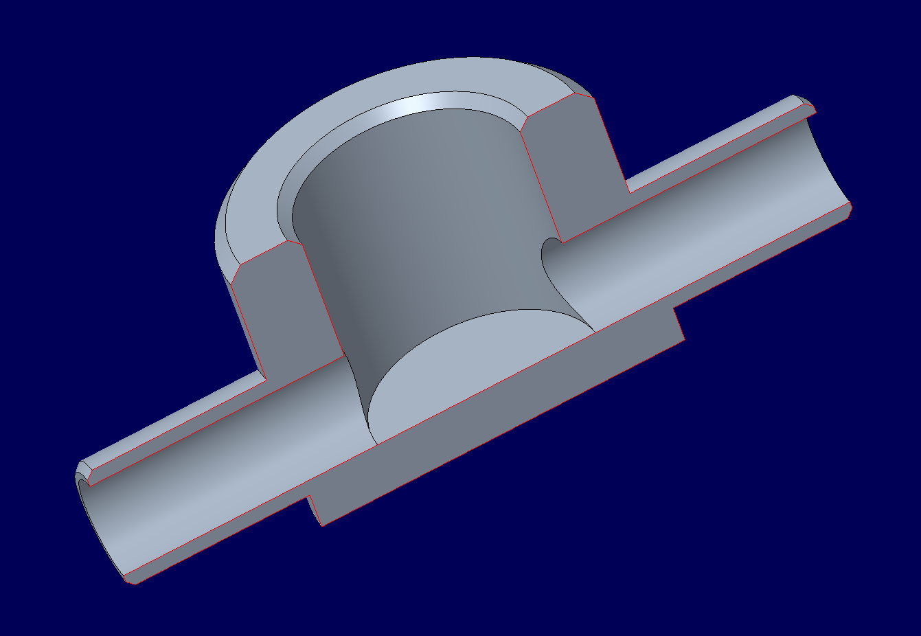 Dichtigkeitstest mit Y-Stück aus PA - 2 Bar Der Versuchsaufbau und die Versuchsdurchführung gleichen dem erstem Dichtigkeitstest. Damit der Schlauch nicht vom Y-Stück rutscht und eine dichte Verbindung entsteht, wurden zusätzlich Kabelbinder an den Verbindungsstellen eingesetzt. Da die Anforderungen an das Bauteil eine Druckbelastung von 2 Bar sind, wird das Bauteil zuerst mit einem Druck von 2 Bar getestet. Video: Dichtigkeitstest Y-Stück aus PA mit 2 Bar Dieser Versuch zeigt, dass das Bauteil an sich dicht ist und keine Luft zwischen den Druckschichten ausweicht. Lediglich an den Verbindungsstellen zwischen Y-Stück und Schlauch treten kleine Luftbläschen aus. Daher muss noch für eine dichte Verbindung gesorgt werden. Dichtigkeitstest mit Y-Stück aus PA - 3 Bar Der Versuchsaufbau und die Versuchsdurchführung gleichen dem erstem Dichtigkeitstest. Damit der Schlauch nicht vom Y-Stück rutscht und eine dichte Verbindung entsteht, wurden zusätzlich Kabelbinder an den Verbindungsstellen eingesetzt. Um die Belastung des Bauteil weiter zu testen, wurde ein Dichtigkeitstest mit einem Druck von 3 Bar durchgeführt. Mit einer Toleranz von einem Bar soll sichergestellt werden, dass das Bauteil bei falschen Einstellungen des Drucks den Belastungen trotzdem stand hält. Video: Dichtigkeitstest Y-Stück aus PA mit 3 Bar Auch hier ist zu sehen, das die Luft nur den Verbindungsstellen austritt. Bei einem Druck von 3 Bar ist jedoch die Anzahl an Luftbläschen, die entweichen, deutlich höher. Das Bauteil an sich hält jedoch auch hier dicht. Verbindungsstück 1 In der pneumatischen Komponente des Beatmungsgeräts werden drei Verbindungsstücke zwischen dem Anschluss der Maske und dem weiterführenden Schlauch im Beatmungsgerät benötigt. Die Anforderungen an den Adapter waren 22 mm Innendurchmesser auf der einen Seite und, da der Strömungsdurchmesser bei 1/2" liegt, 19 mm Kernloch für das Gewinde, auf der gegenüberliegenden Seite. Das Gewinde wird nach dem Druck mit einem 1/2" Gewindeschneider geschnitten. Konstruktionsentwurf Die Konstruktion vom Verbindungsstück 1 stützt sich auf der obigen Beschreibung.