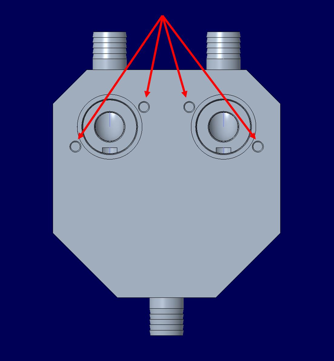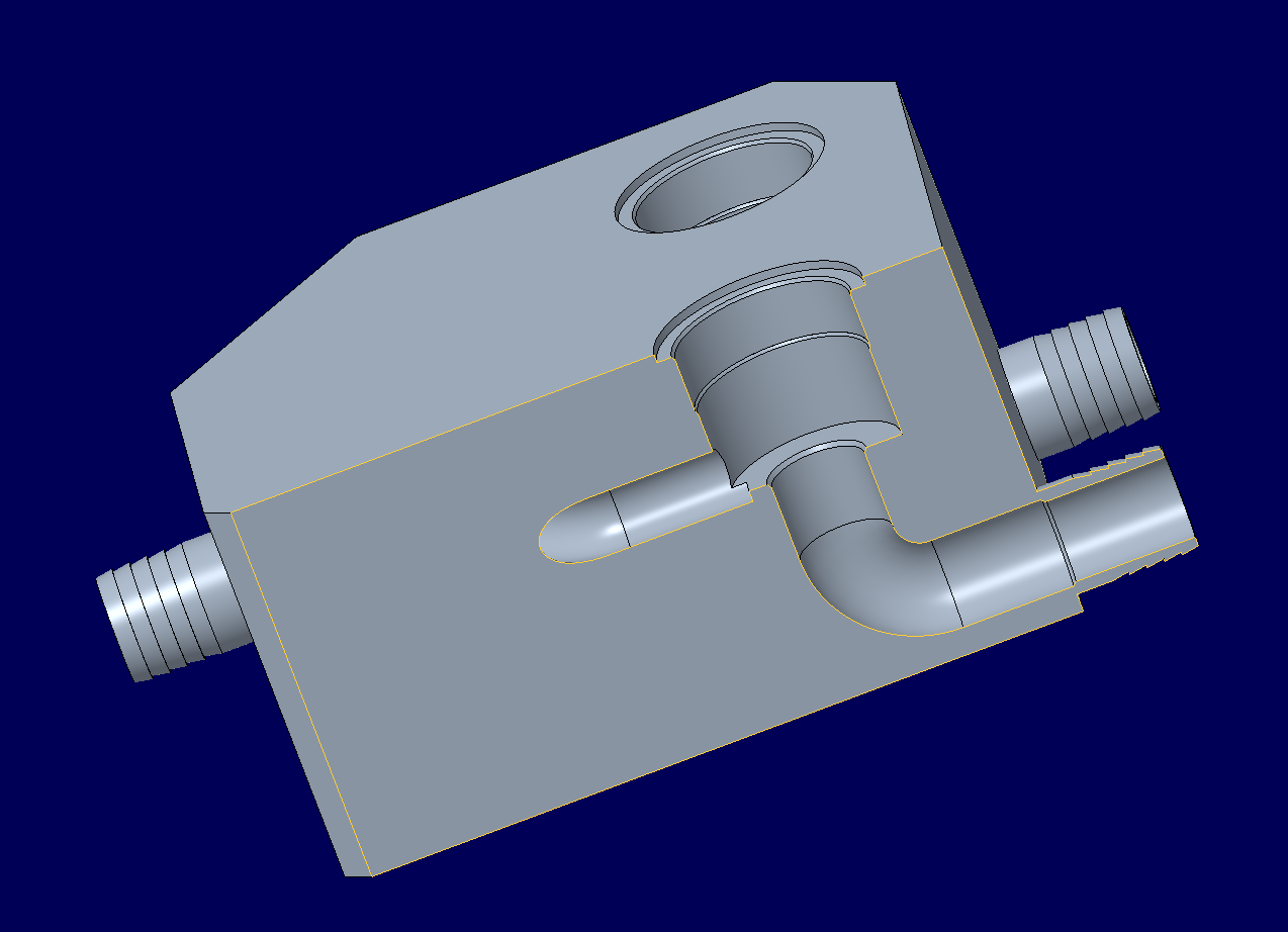 Alternativer Konstruktionsentwurf Mischgehäuse Da bei dem Mischgehäuse das Drucken der Schlauchanschlüsse das größte Problem darstellt, gäbe es die Möglichkeit, die Schlauchanschlüsse durch ein Innengewinde zu ersetzen und Schlauchtüllen aus Edelstahl zu verwenden. Schlauchtüllen besitzen auf der einen Seite einen Schlauchanschluss und auf der gegenüberliegenden Seite einen Anschluss mit Außengewinde. Sie sind in verschiedenen Größen erhältlich, wobei drauf zu achten ist, das ein Schlauchanschluss mit Außendurchmesser 9 mm verwendet werden muss. Bei der gegenüberliegenden Seite handelt es sich um ein M10 Außengewinde. ![]() Abb.: Schlauchtülle Anpassung Konstruktionsentwurf Mischgehäuse Um die Alternativlösung für das Mischgehäuse umzusetzen, muss die Konstruktion angepasst werden: Die Schlauchanschlüsse werden entfernt und durch 8,5 mm Kerlöcher für die M10 Gewinde ersetzt. Die Kernlöcher erhalten noch jeweils eine Fase von 1 mm. Desweiteren wird zur Materialeinsparung die Fase vorne größer und mit einem spitzeren Winkel angepasst. Die Gesamtgröße des Bauteils ohne die Fasen beträgt 60 x 60 x 32 mm.