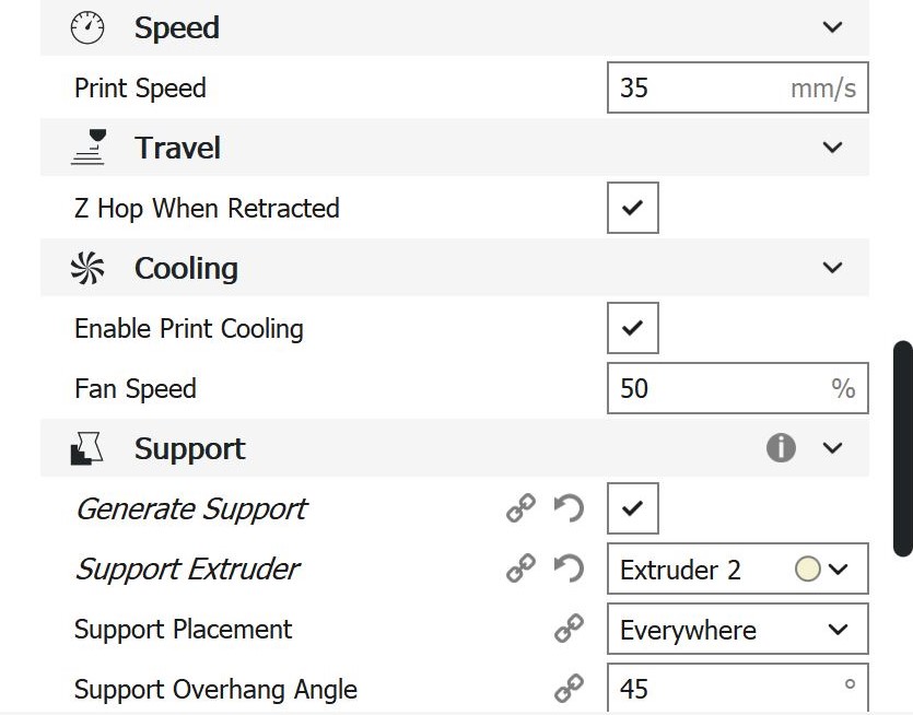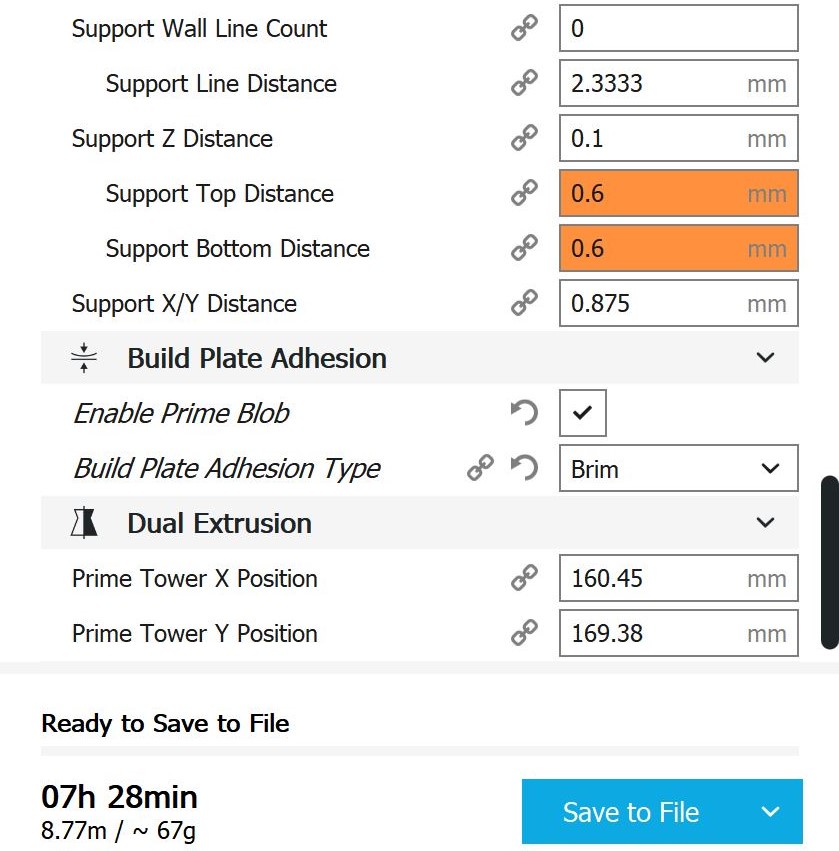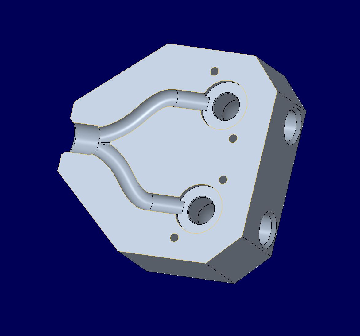 Cura-Einstellungen alternatives Mischgehäuse Da bei dieser Konstruktion die Schlauchanschlüsse wegfallen, kann auf Support außen verzichtet werden. Da die Kernlöcher und die Innenkanäle einen eher kleinen Durchmesser haben, wird auch versucht Innen kein Support zu verwenden. Damit könnte mit PA und nur mit einem Extruder gedruckt werden, wodurch nicht nur das Problem mit dem PVA als Stützmaterial entfällt, sondern auch viel Zeit eingespart wird.