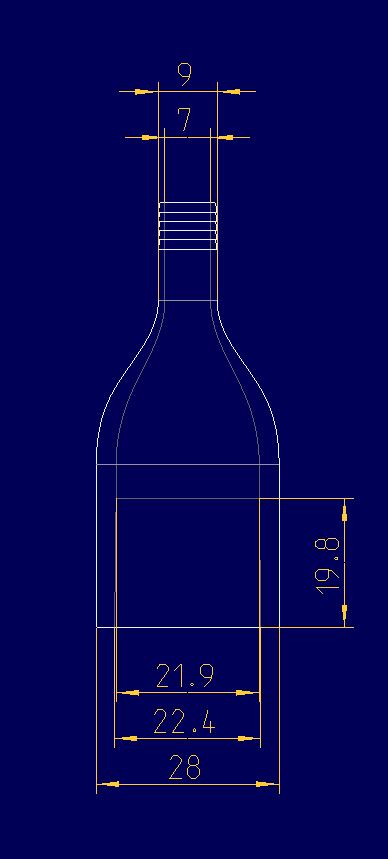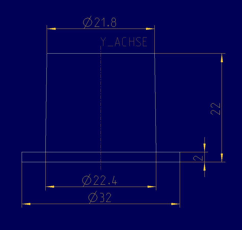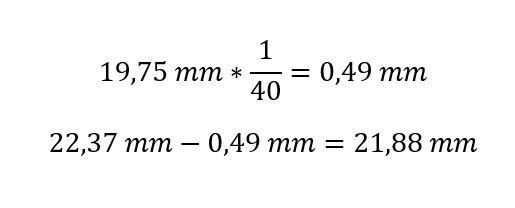 3D-Druck mit PA Aufgrund von Lieferverzögerungen des Filaments PA kann der 3D-Druck des Verbindungsstücks 1 aus PA nicht in die Ausarbeitung aufgenommen werden. Verbindungsstück 2 Für die pneutmatische Komponente des Beatmungsgeräts werden erneut zwei Adapter für die Verbindung zwischen den zwei Anschlüssen des Volumenstromsensor und der entsprechenden Schläuche benötigt. Bei den Anschlüssen des Sensors handelt es sich um 22 mm Anschlüsse, die in der Norm ISO 5356 beschrieben werden. Konstruktionsentwurf Die Konstruktion für die Seite des Schlauchanschlusses hat einen Außendurchmesser von 9 mm und einen Innendurchmesser von 7 mm. Sie gleicht den Anschlüssen des Y-Stücks. Durch den konischen Verlauf nach der ISO 5356 verändert sich der Innendurchmesser von Außen 22,37 ± 0,04 mm, gerundet 22,4 mm, nach Innen mit einem Verjüngungsverhältnis von 1:40. Die Länge des konischen Verlaufs ist dem Sensordatenblatt zu entnehmen und beträgt 19,75 mm, gerundet auf 19,8 mm. Dadurch erhält man den kleinsten Innendurchmesser des konischen Verlaufs von 21,88 mm, gerundet 21,9 mm. Der dazugehörige Außendurchmesser kann beliebig gewählt werden. In diesem Fall beträgt er 28 mm. Abb.: Nebenrechnung konischer Verlauf