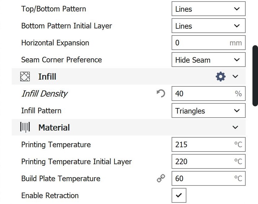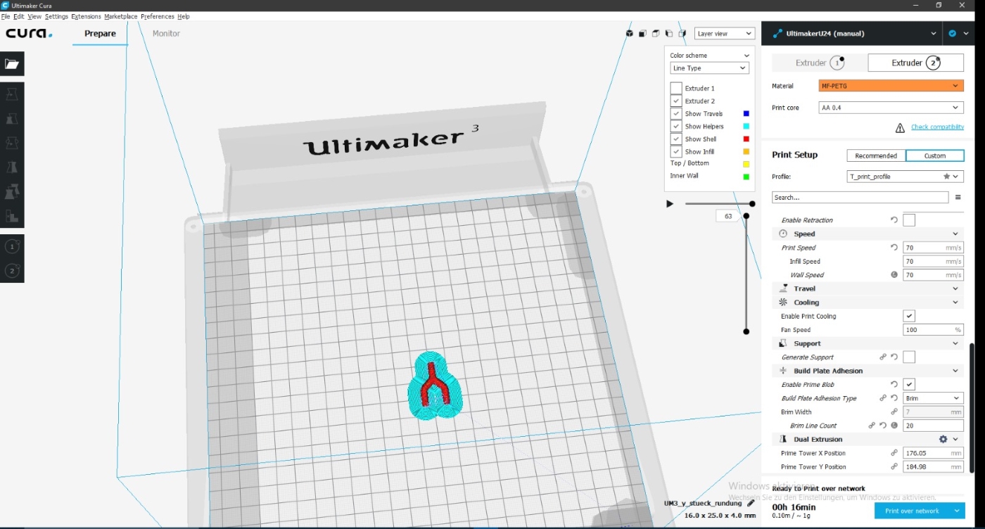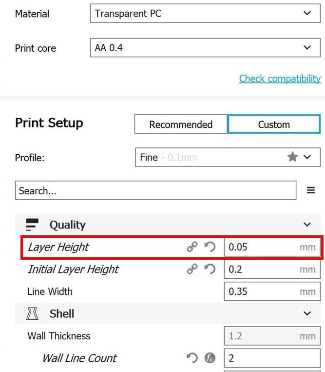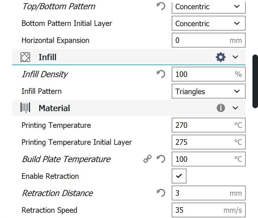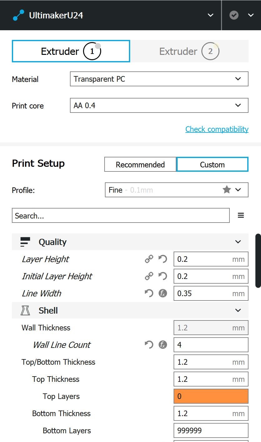 Cura-Einstellungen PC Bei den Einstellungen, die hierfür in Cura verwendet wurden, handelt es sich um Werte, die im empfohlenen Rahmen von Ultimaker selbst liegen.