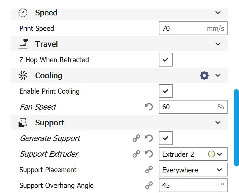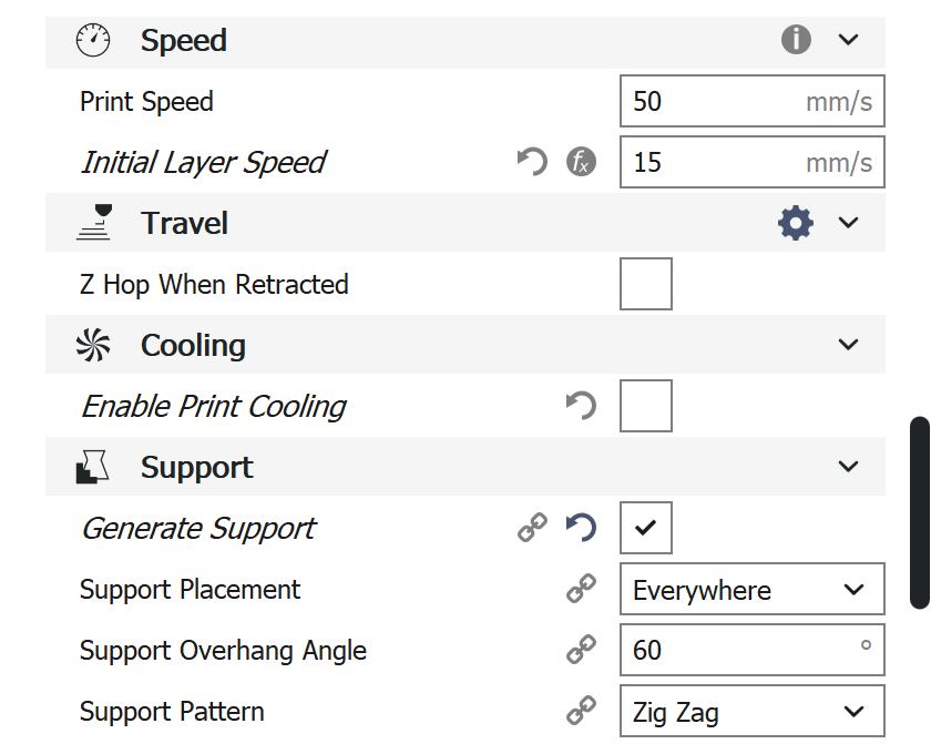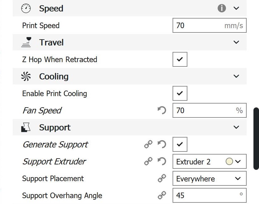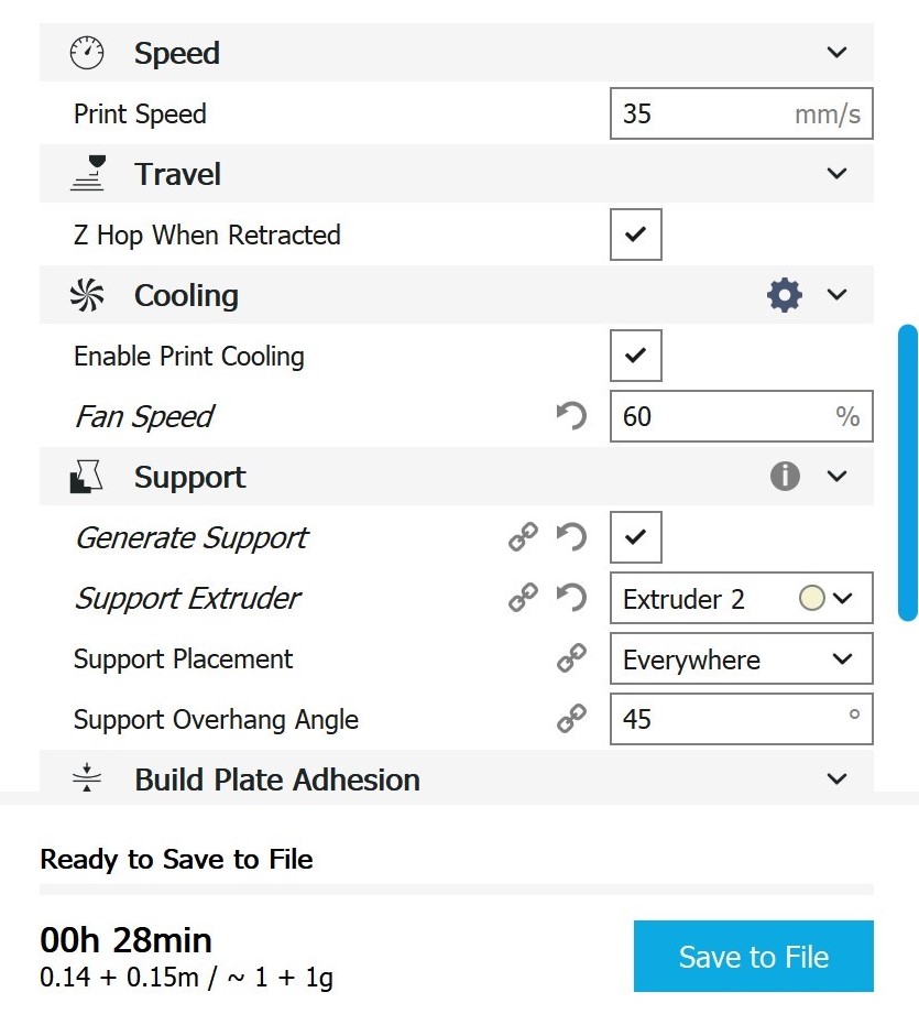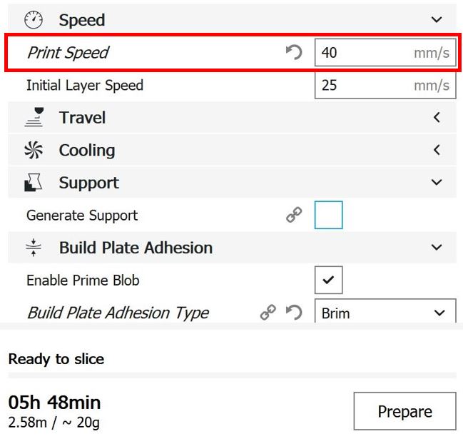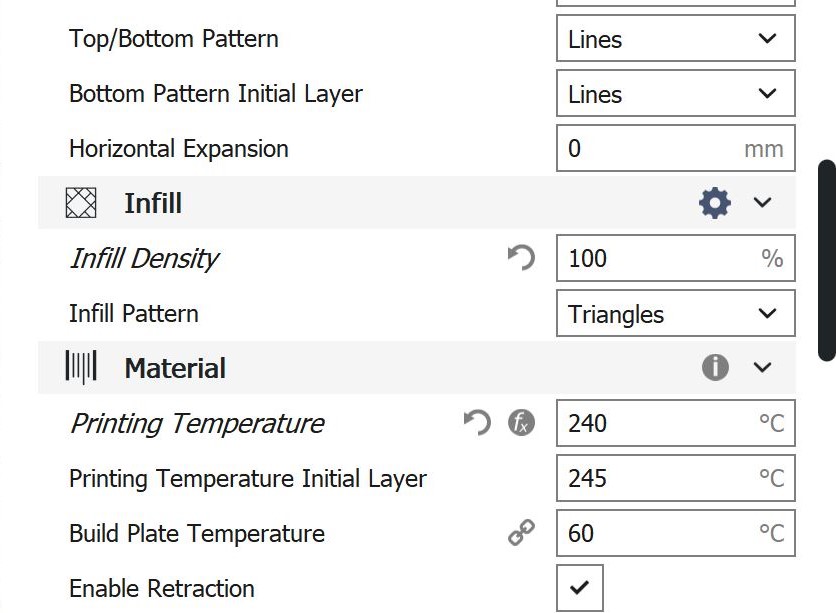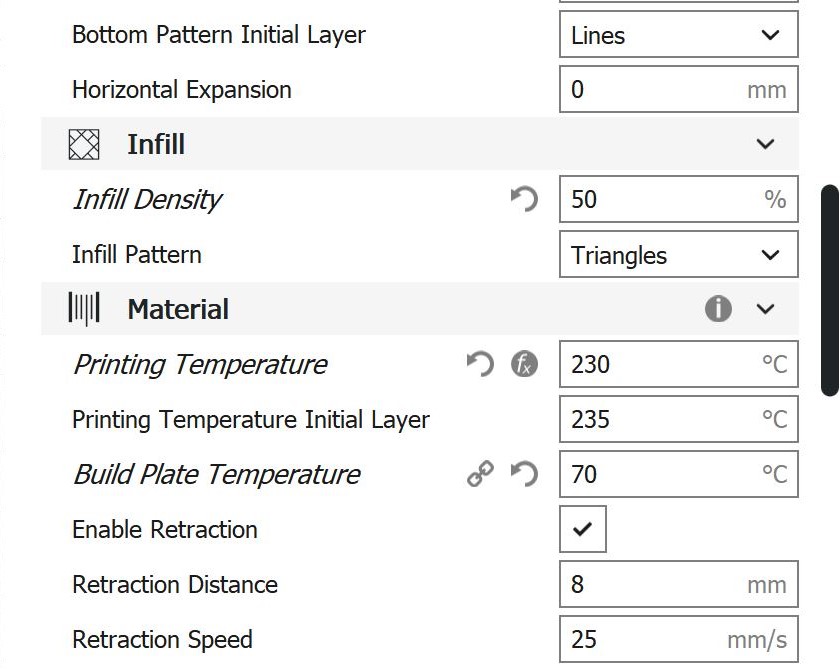 Cura-Einstellungen PC Bei den Einstellungen, die hierfür in Cura verwendet wurden, handelt es sich um Werte, die im empfohlenen Rahmen von Ultimaker selbst liegen.