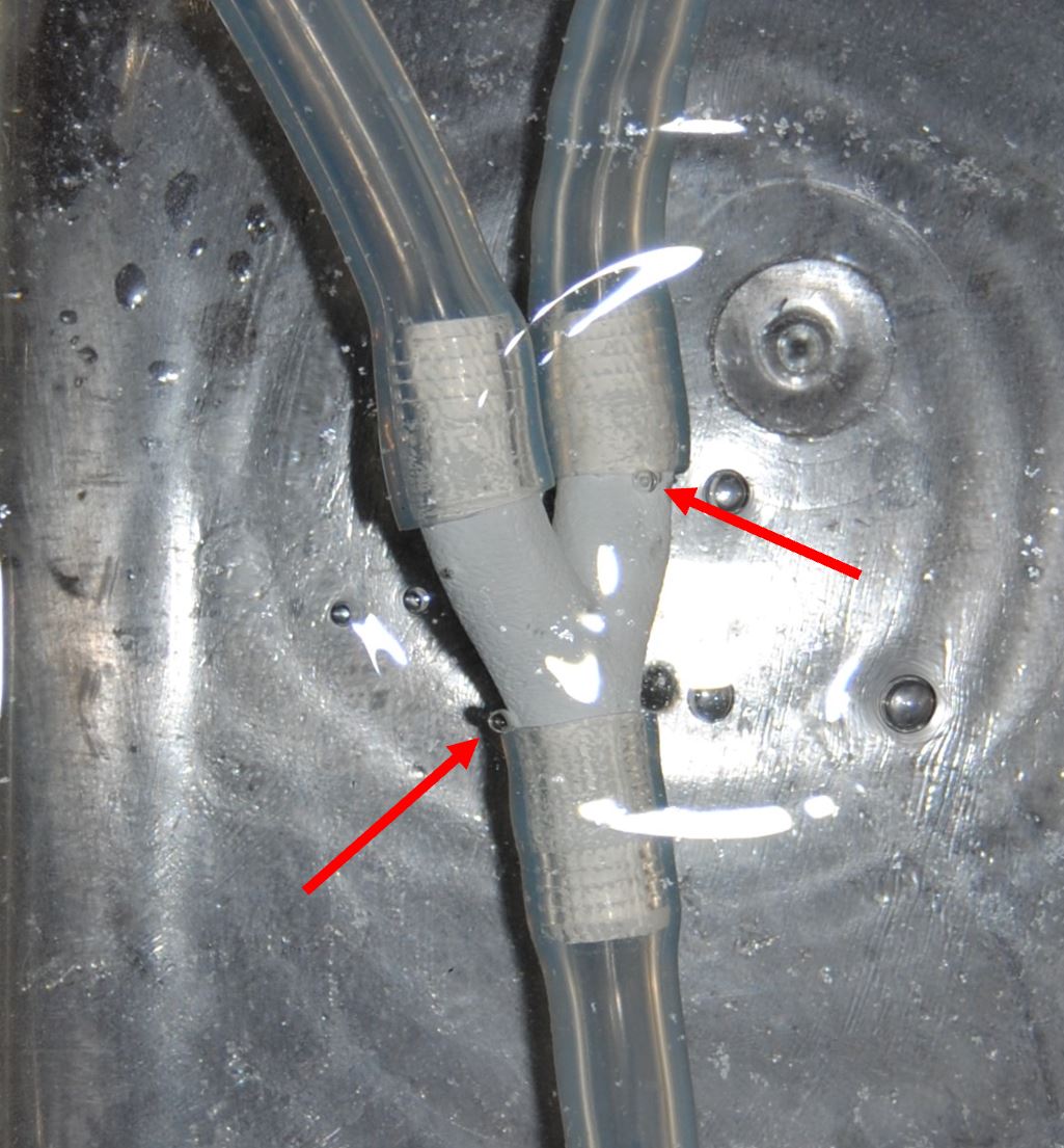 Ein weiterer Dichtigkeitstest soll zeigen, ob die undichten Stellen durch das Lackieren geschlossen wurden. Dieser Lack dient nur zum Testen, für die spätere Anwendung soll ein besser geeigneter Lack verwendet werden. Dichtigkeitstest nach Lackieren Nach dem Lackieren wurde das Bauteil erneut auf Dichtigkeit geprüft, wobei der Versuchsaufbau und die Versuchsdurchführung der des vorherigen Versuchs gleichen. ![]() Abb.: Bläschenbildung an den Verbindungsstellen Durch das Auftragen des Lacks wurde die Dichtigkeit des Y-Stücks deutlich verbessert. Lediglich an einer kleinen Stelle, an der der Lack nicht richtig haftet, sind Luftbläschen ausgetreten. Zu sehen ist aber, das weitere Bläschen an den Verbindungsstellen zwischen Bauteil und Schlauch auftreten. Zweiter Probedruck