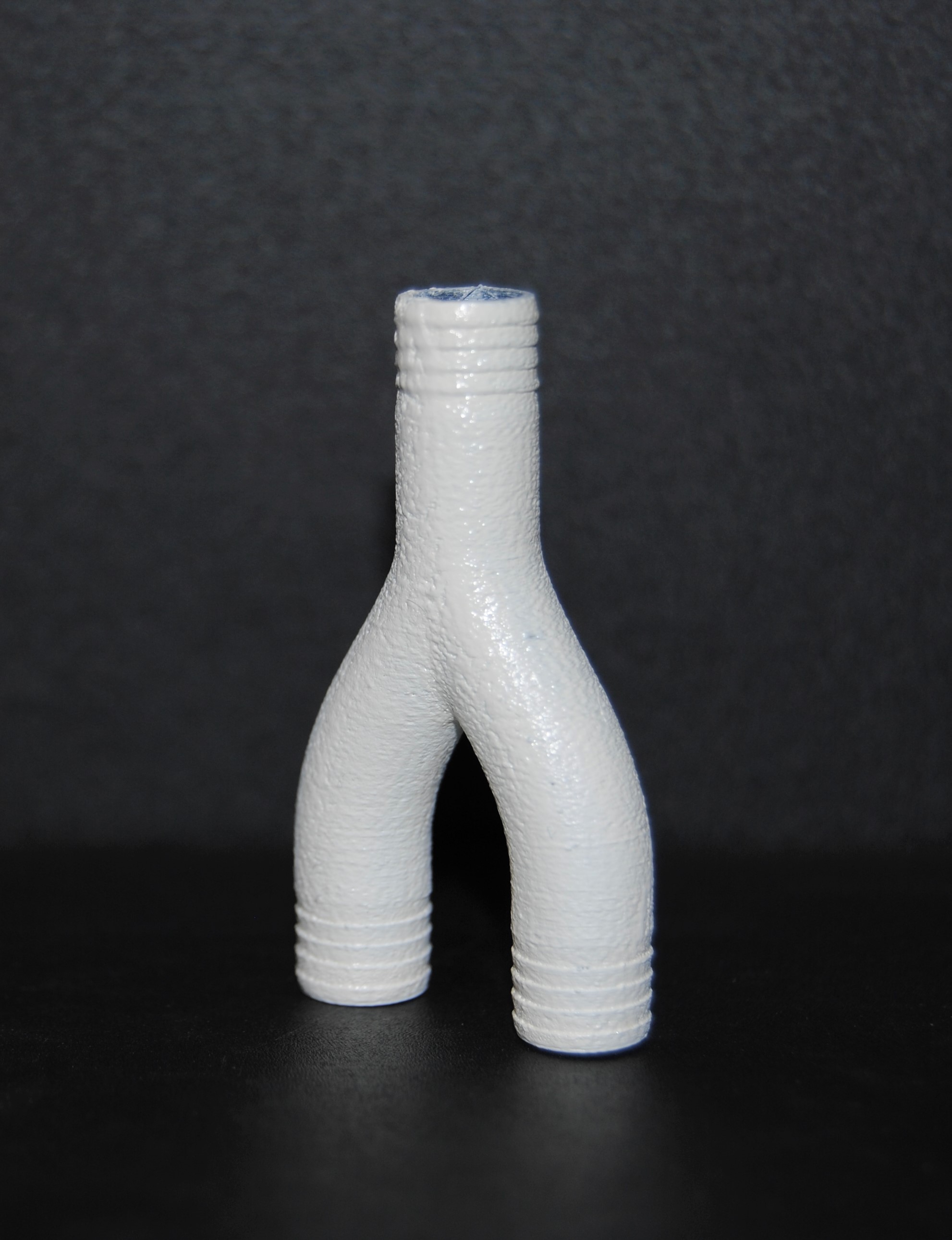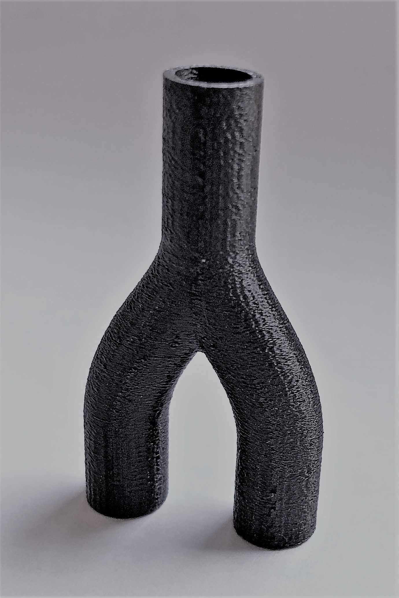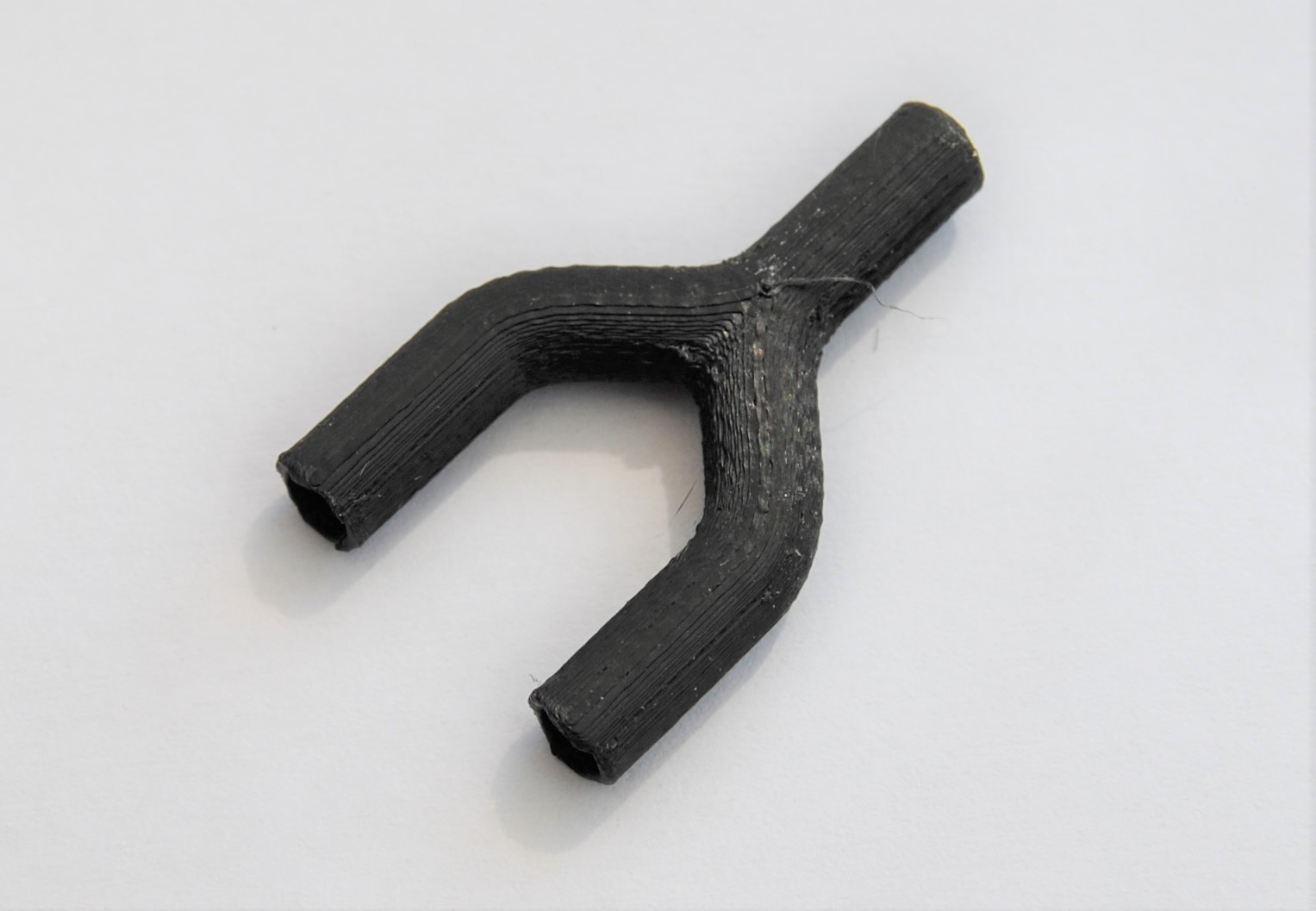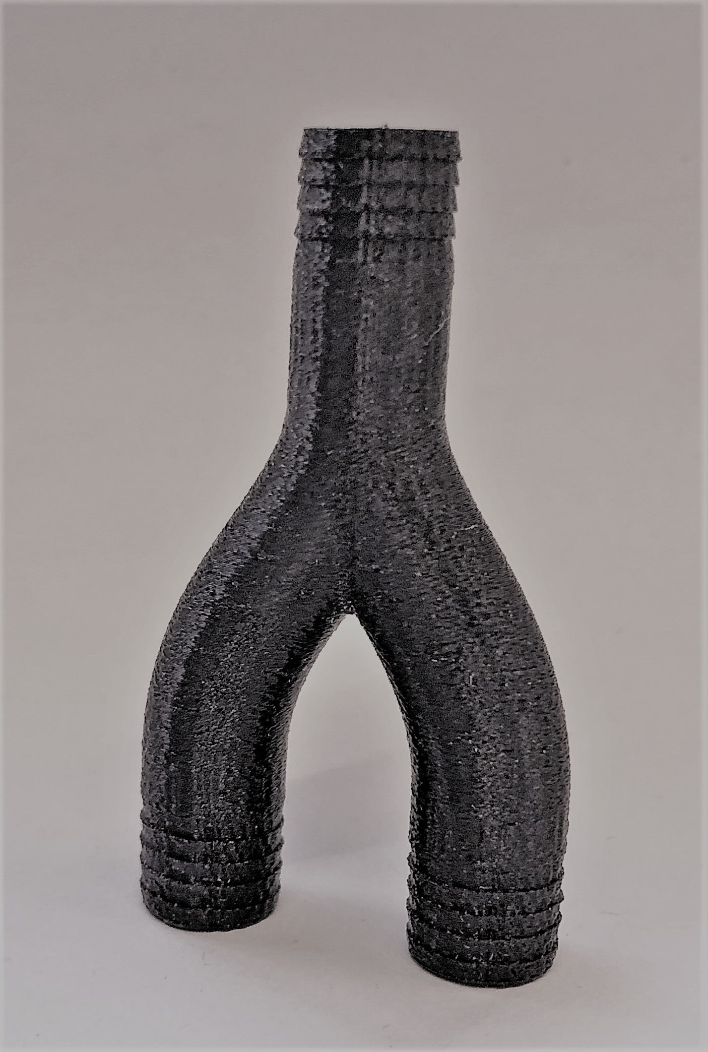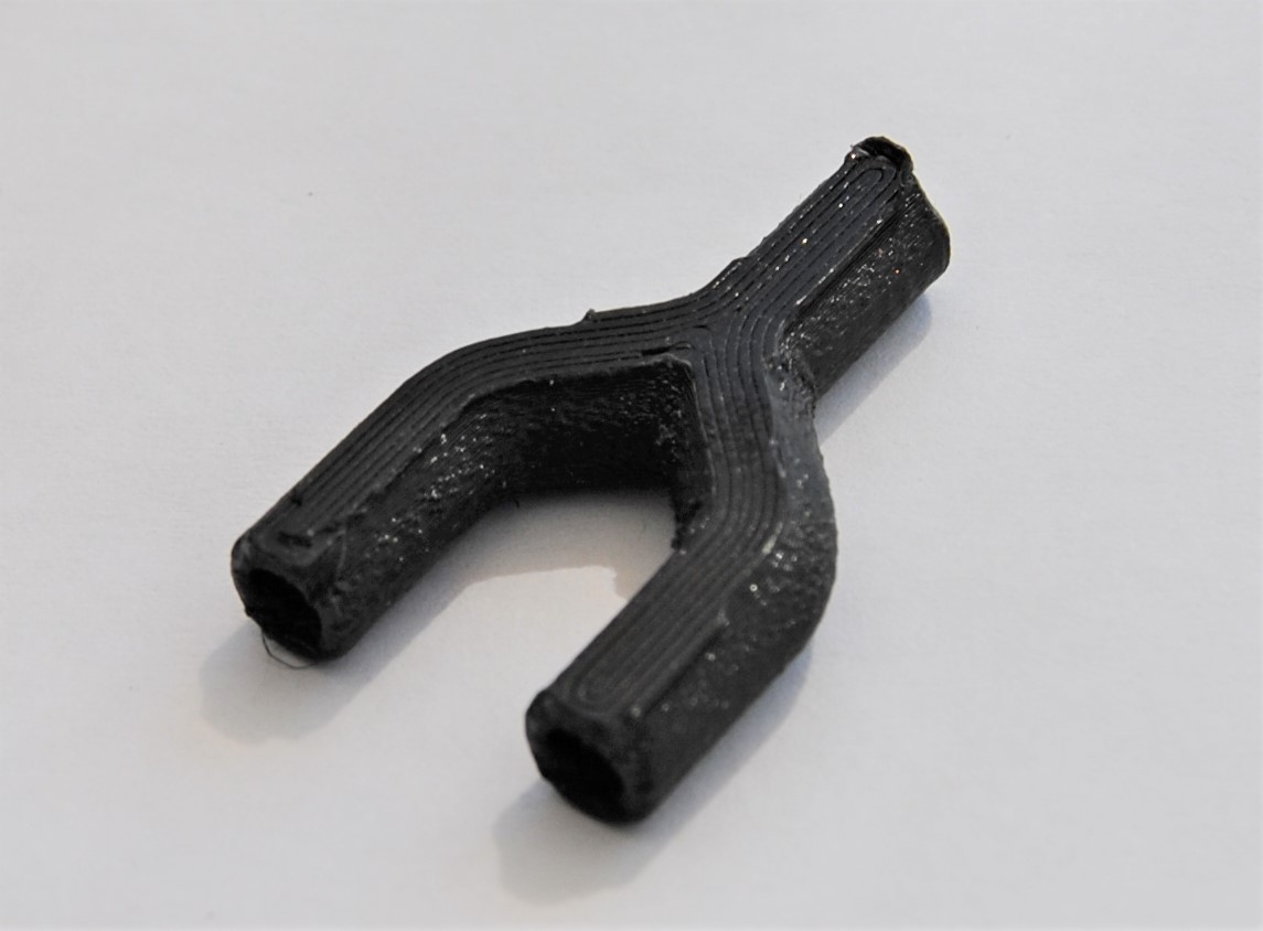 Beim zweiten Probedruck stellte sich heraus, dass die Wandstärke von 0,5 mm nicht realisierbar ist, da durch das Einbringen des Tannenbaumprofils Löcher im Bauteil zu sehen sind, wodurch es nicht dicht ist. Auch die schwer zu entfernenden Filamentreste des Brim können ein Problem bezüglich der Dichtheit zwischen Y-Stück und Schlauch verursachen. Dritter Probedruck Um die Löcher in den Wänden des Bauteils zu vermeiden, wurde der Innendurchmesser auf 2 mm verkleinert. Dadurch entsteht eine Wandstärke von einem Millimeter, die dem Y-Stück zusätzliche Stabilität verleiht. Auf der Abbildung rechts ist jedoch zu sehen, dass noch Brim am Bauteil ist, welcher schwer zu entfernen ist, da das Risiko, das Bauteil zu beschädigen sehr groß ist.