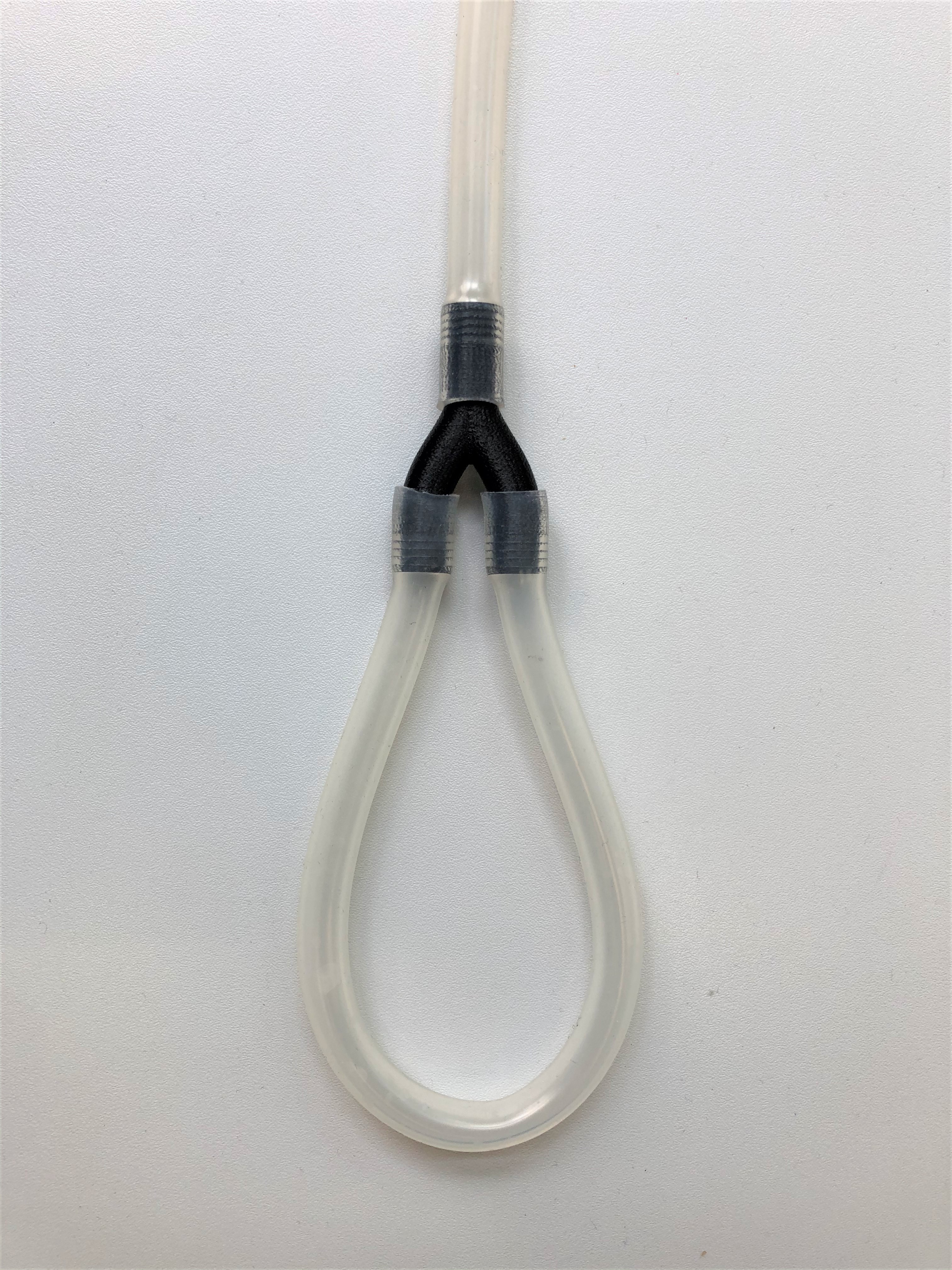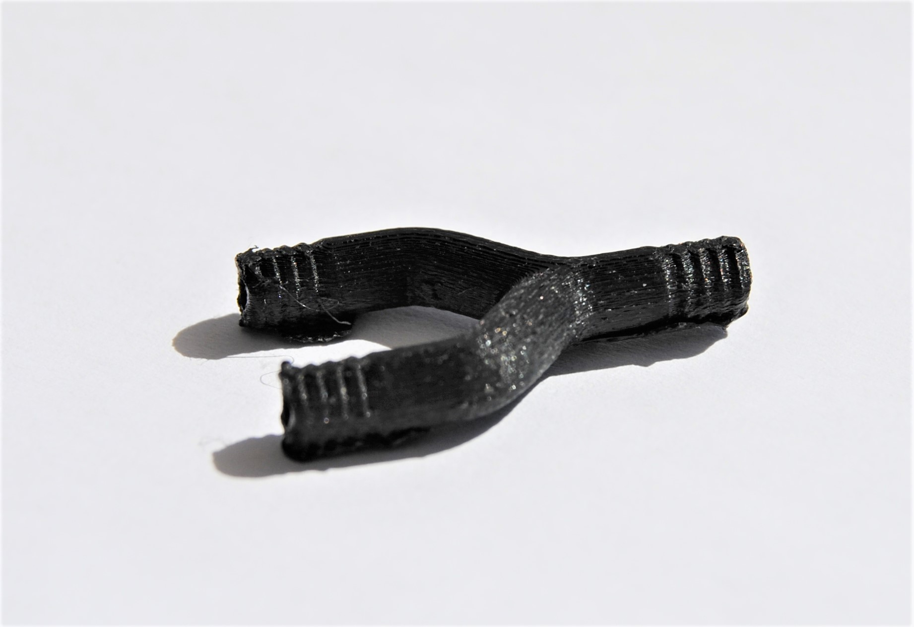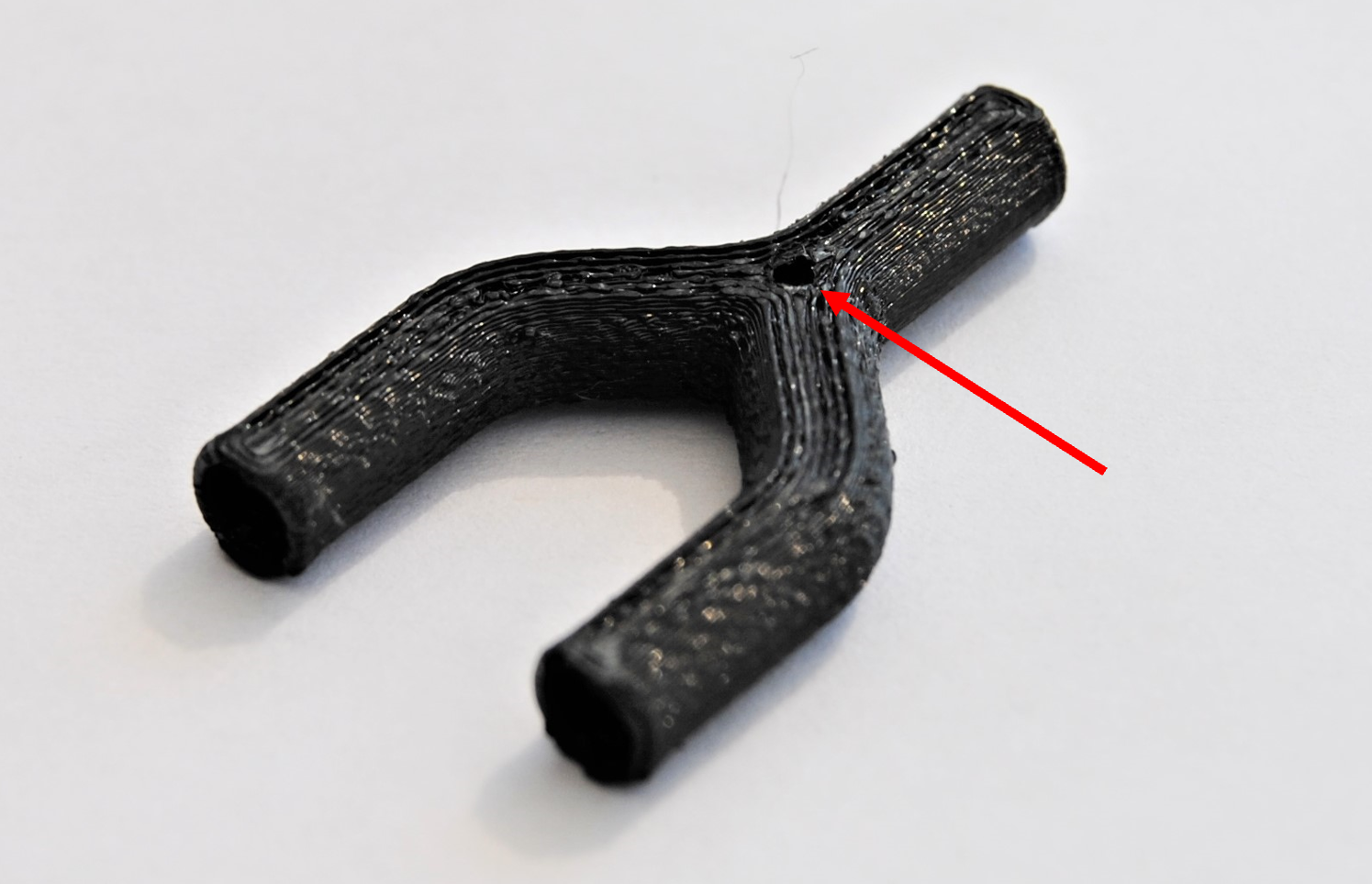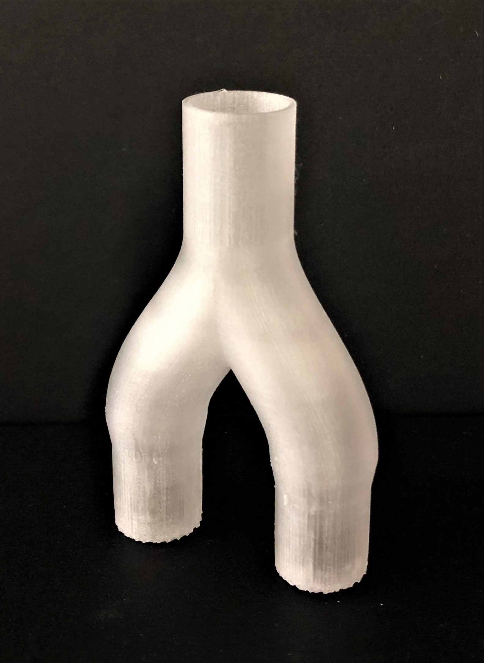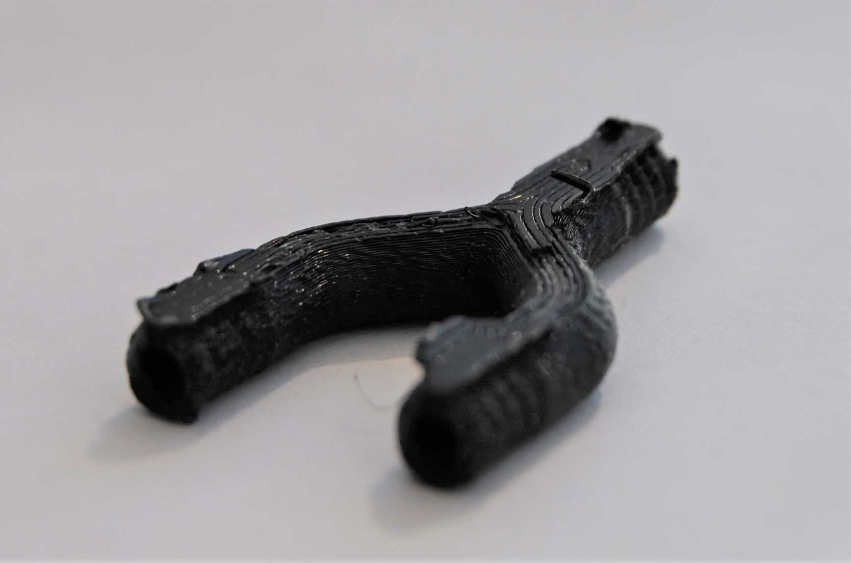 Beim zweiten Probedruck stellte sich heraus, dass die Wandstärke von 0,5 mm nicht realisierbar ist, da durch das Einbringen des Tannenbaumprofils Löcher im Bauteil zu sehen sind, wodurch es nicht dicht ist. Auch die schwer zu entfernenden Filamentreste des Brim können ein Problem bezüglich der Dichtheit zwischen Y-Stück und Schlauch verursachen. Dritter Probedruck Um die Löcher in den Wänden des Bauteils zu vermeiden, wurde der Innendurchmesser auf 2 mm verkleinert. Dadurch entsteht eine Wandstärke von einem Millimeter, die dem Y-Stück zusätzliche Stabilität verleiht. Auf der Abbildung rechts ist jedoch zu sehen, dass noch Brim am Bauteil ist, welcher schwer zu entfernen ist, da das Risiko, das Bauteil zu beschädigen sehr groß ist.