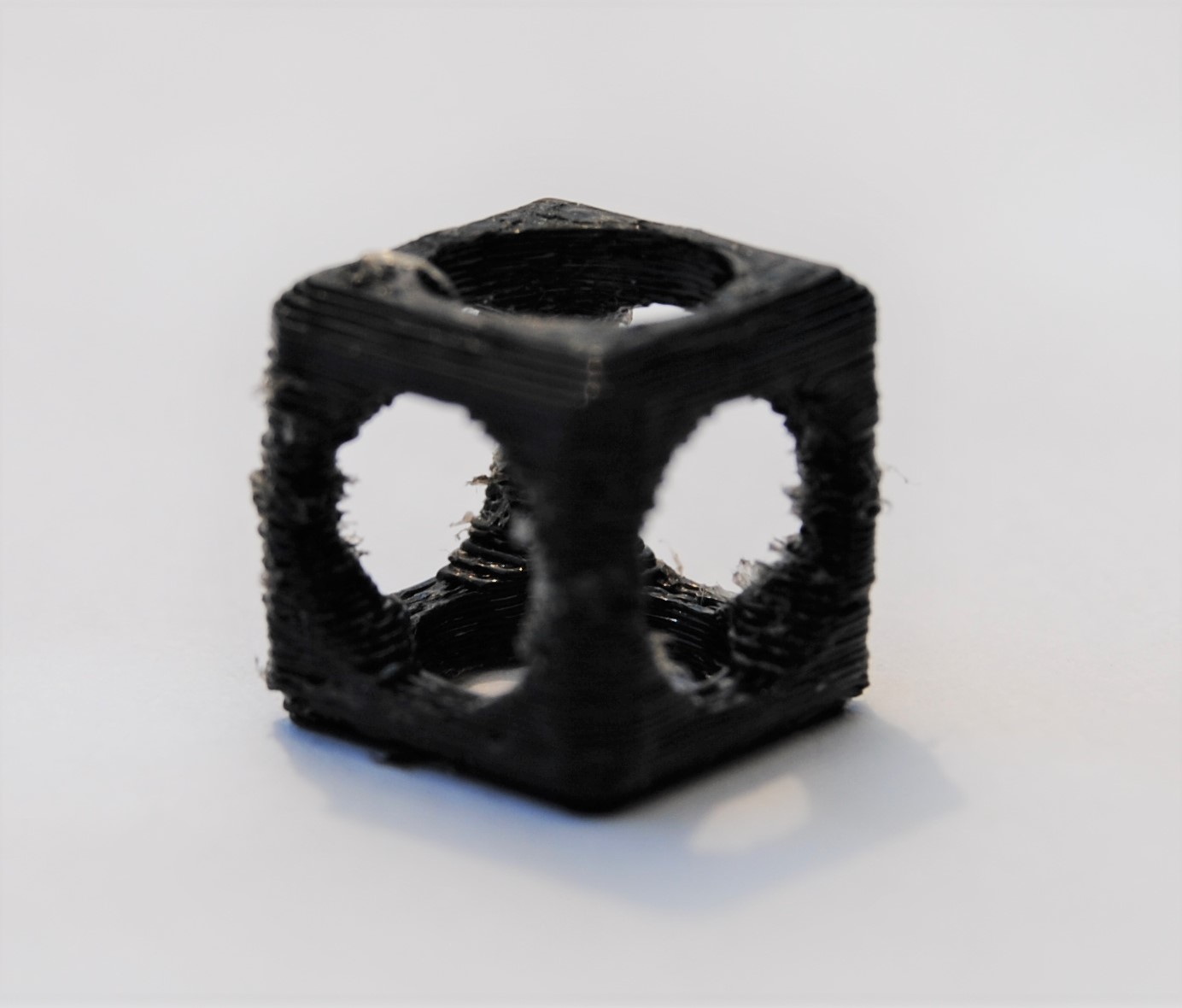 Drucken mit PA und PVA Das größte Problem beim Drucken des Mischgehäuses ergibt sich zurzeit durch den Support. Durch das Drucken mit nur einem Extruder und damit nur einem Material, kann der Support nur schwer oder gar nicht vom Bauteil entfernt werden. Um dieses Problem zu umgehen, wird beim dritten Probedruck mit zwei Extrudern und zwei verschiedenen Materialen gedruckt. Ziel ist es, ein dichtes Mischgehäuse aus PA zu haben, ohne jegliche Supportreste. Hierbei soll das Material PVA, die Abkürzung für Polyvinylalkohol, Abhilfe leisten. Dieses Material eignet sich hervorragend als Stützmaterial, da es sich, nach einiger Zeit in einem Wasserbad, vollkommen auflöst. Sicherheitsdatenblätter Das Sicherheitsdatenblatt von PA ist hier zu finden. Das Sicherheitsdatenblatt von PVA ist hier zu finden. Konstruktion Test-Bauteil Um zu sehen, wie sich das Material beim Drucken verhält und um schnell die richtigen Druckeigenschaften herauszufinden, wird ein Bauteil für Testzwecke konstruiert. Es handelt sich hierbei um einen Würfel mit den Maßen 10 x 10 x 10 mm. Alle sechs Seiten des Würfels haben ein durchgehendes kreisförmiges Loch mit einem Durchmesser von 7 mm und alle Kanten werden mit einer Fase von 1 mm versehen. Aufgrund der kompakten Größe soll ein schneller Druck garaniert werden, der das Zusammenspiel der Materialien darstellt.