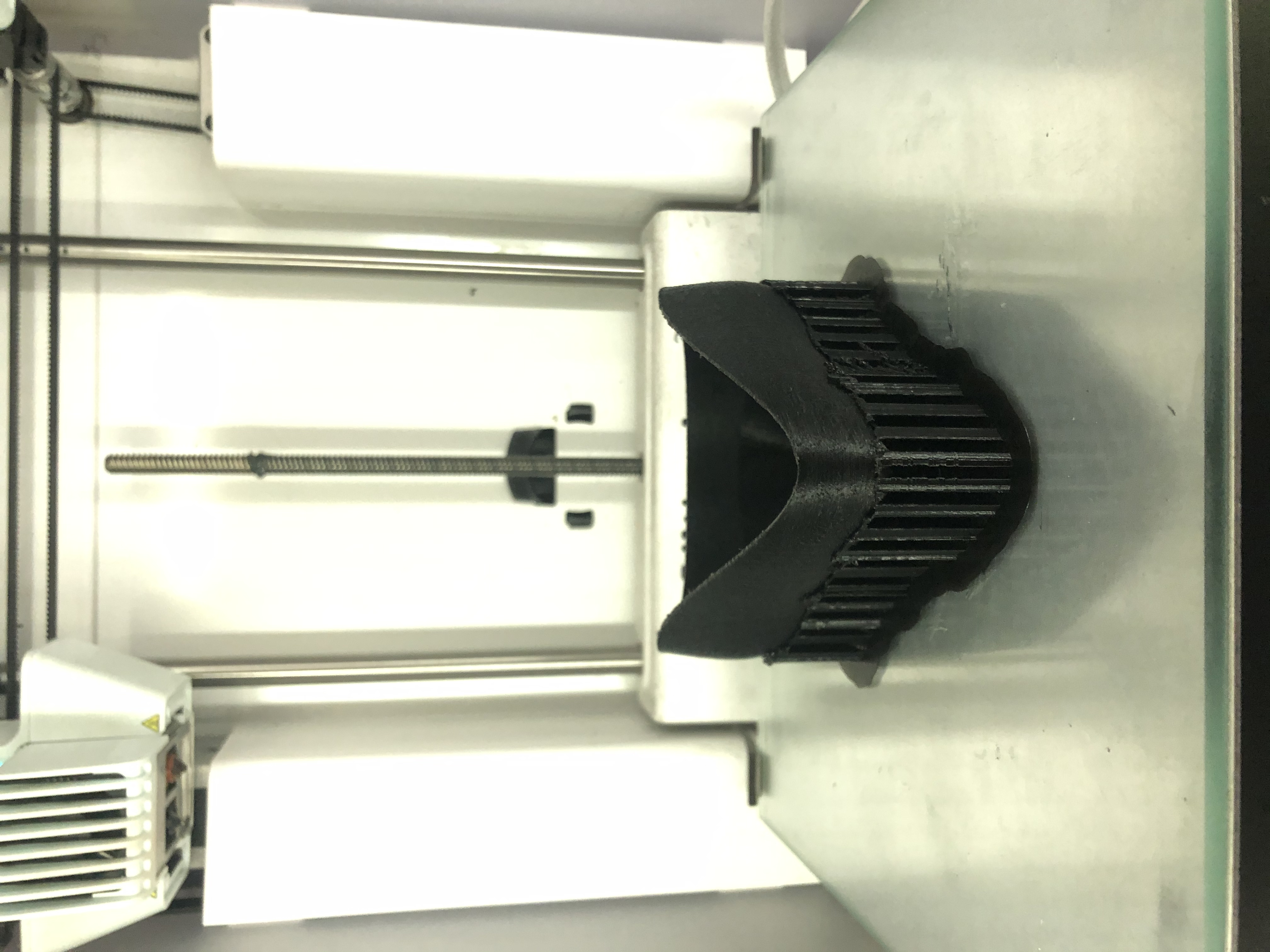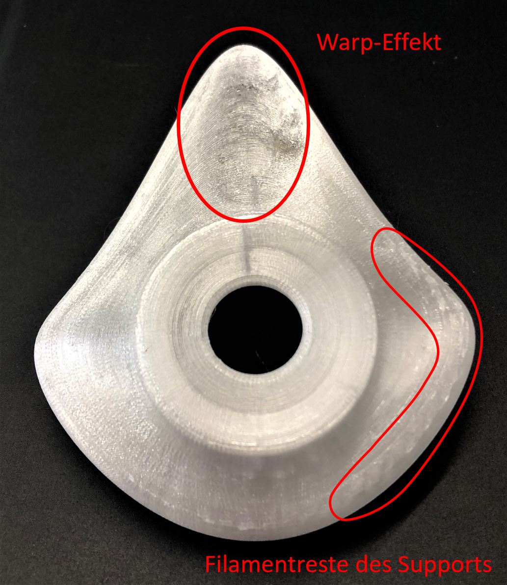 Ergebnis Sterilisationstest Bei dem Sterilisationstest wurde die Halbkugel 20 Minuten lang 120 Grad ausgesetzt. Es hat sich gezeigt, dass keinerlei Verformungen am Bauteil zu erkennen sind. Damit ist der Versuch gelungen und die Maske kann nach Belieben wiedererwendet werden. 3D-Druck Maske Vor dem Druck wurde das Modell der Maske angepasst, indem die Wandstärke auf 3,5 mm erhöht wurde. Dies soll für eine höhere Stabilität sorgen. Der 3D-Druck der Maske scheint anfänglich ganz gut, jedoch ist an einer Stelle der sogenannte Warp-Effekt aufgetreten, wie im rechten unteren Bild zu sehen ist. Dieser Effekt beschreibt das Aufwölben oder den Verzug des Bauteils während dem Druckprozess. Die Ursachen für Warping sind die unterschiedlichen Abkühlgeschwindigkeiten und -temperaturen der einzelnen Schichten, die zu ungleichmäßig verteilten Eigenspannungen im Filament führen. [14] Desweiteren lässt sich die Stützstruktur nicht richtig von Bauteil lösen und es bleiben Filamentreste an der Maske zurück. Um diese am besten weg zu bekommen, sollte das Bauteil geschliffen werden.