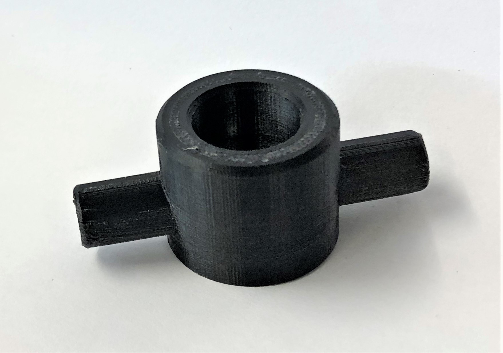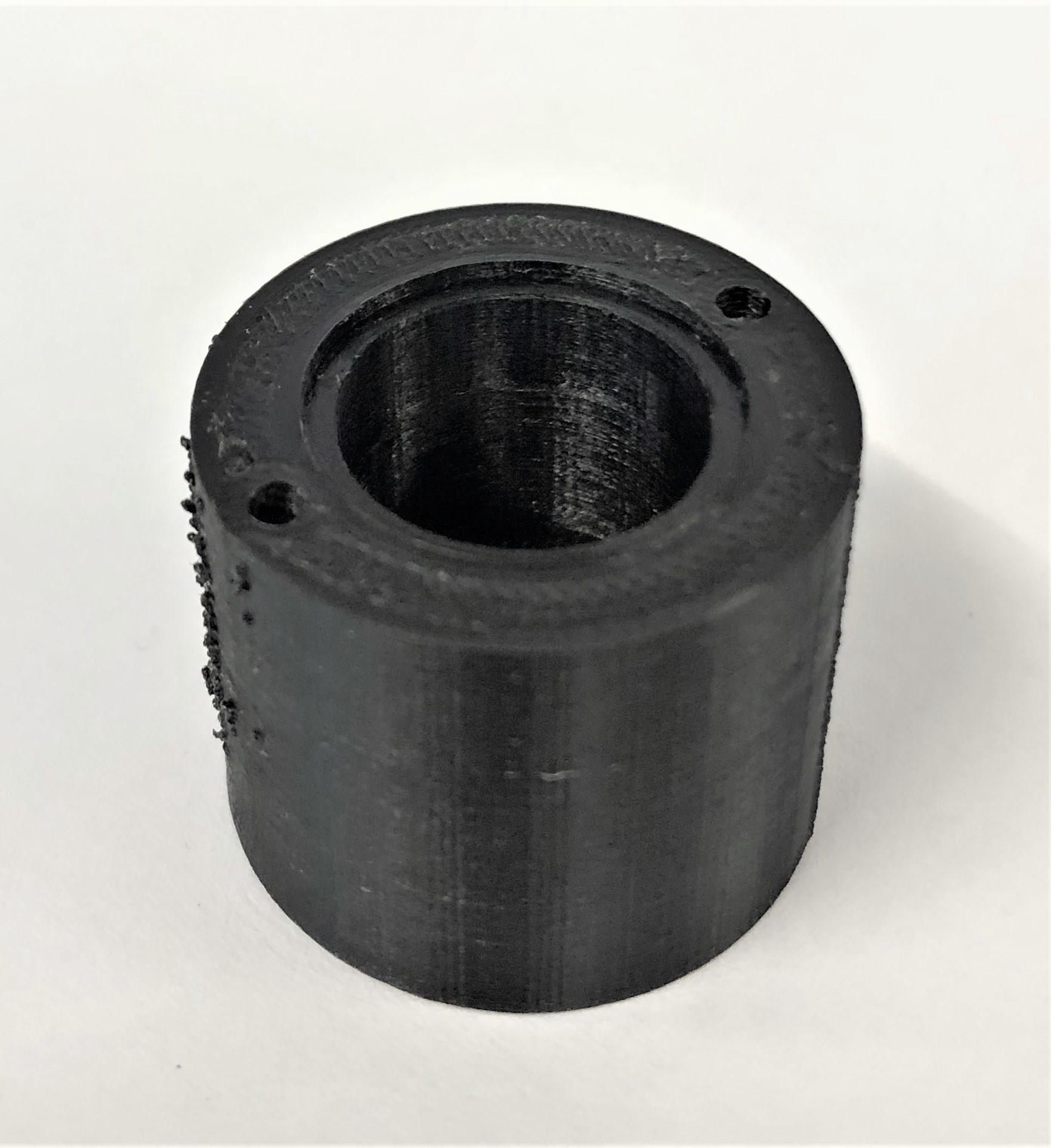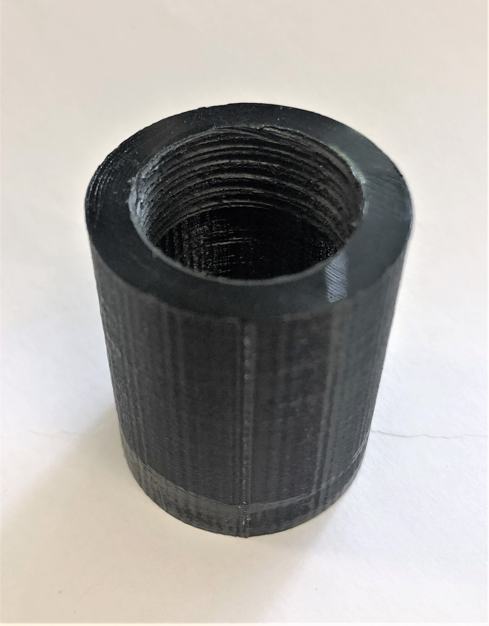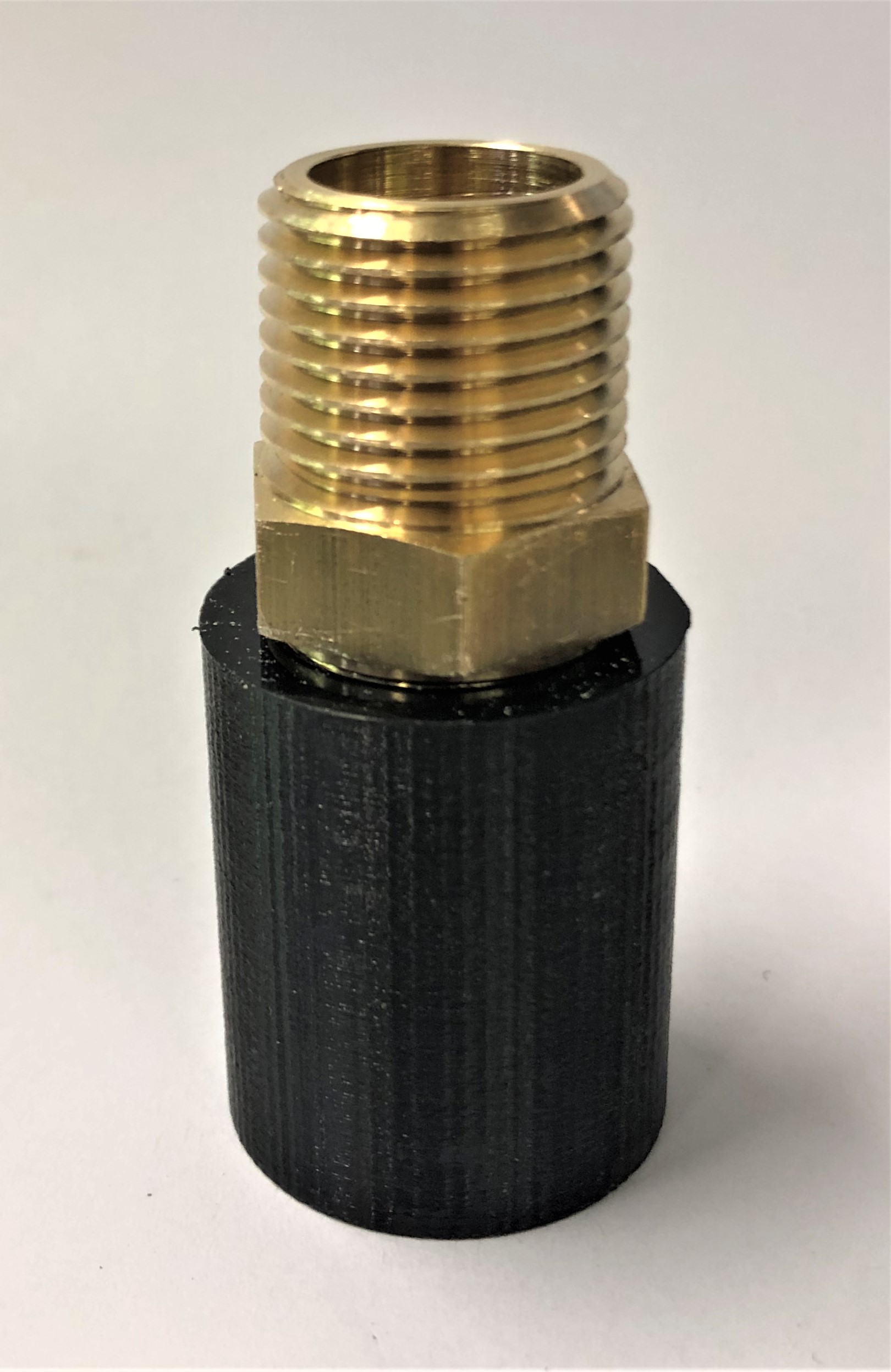 Probedruck Für den Probedruck dieses Adapters wird ebenfalls PETG verwendet. Durch die runde Form ohne Schrägen kann das Bauteil im Stehen und ohne Support gedruckt werden. Mittels dieses Adapters soll auch herausgefunden werden, ob ein zuverlässiges 1/2" Gewinde in das Bauteil geschnitten werden kann. Der Adapter mit Gewinde ist im Bild unten rechts zu sehen.