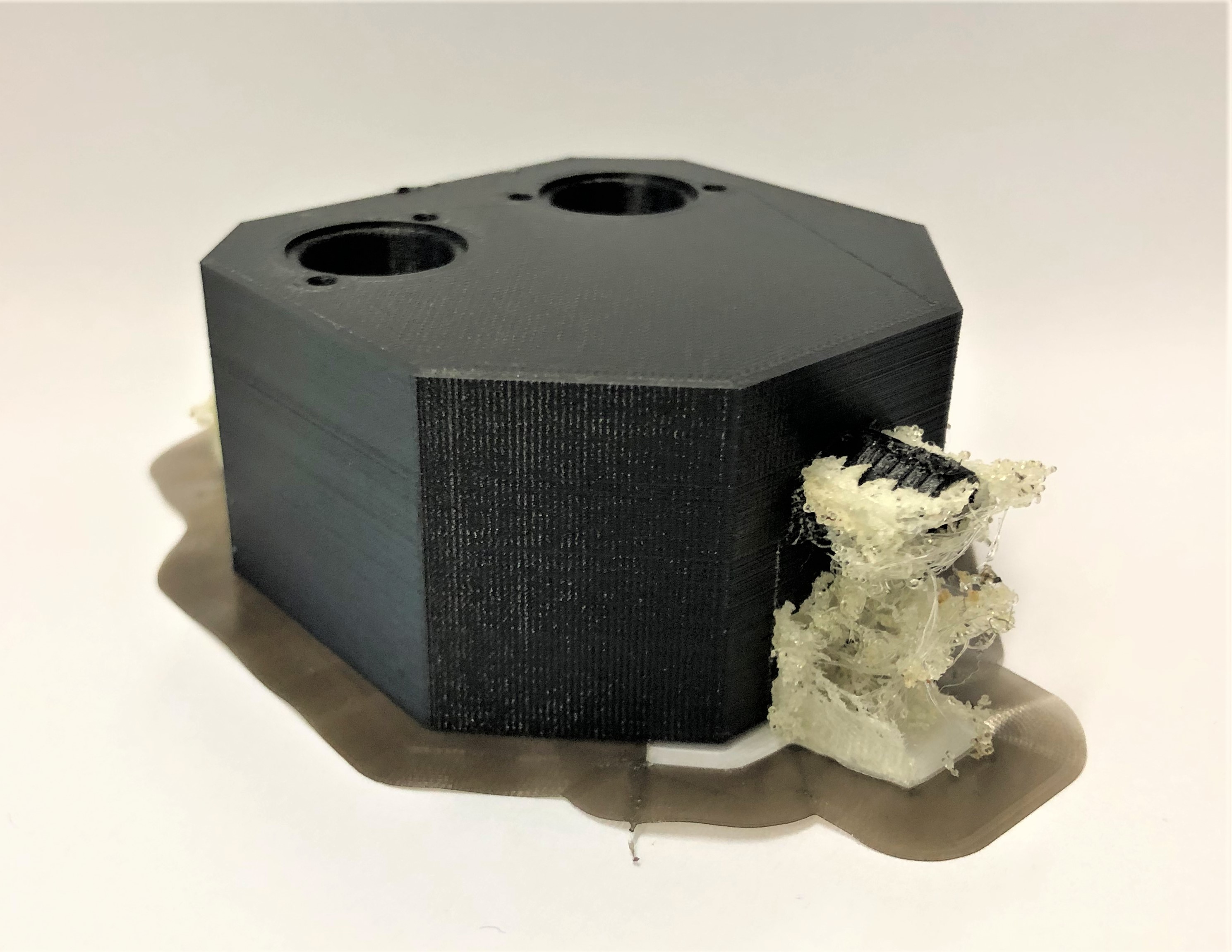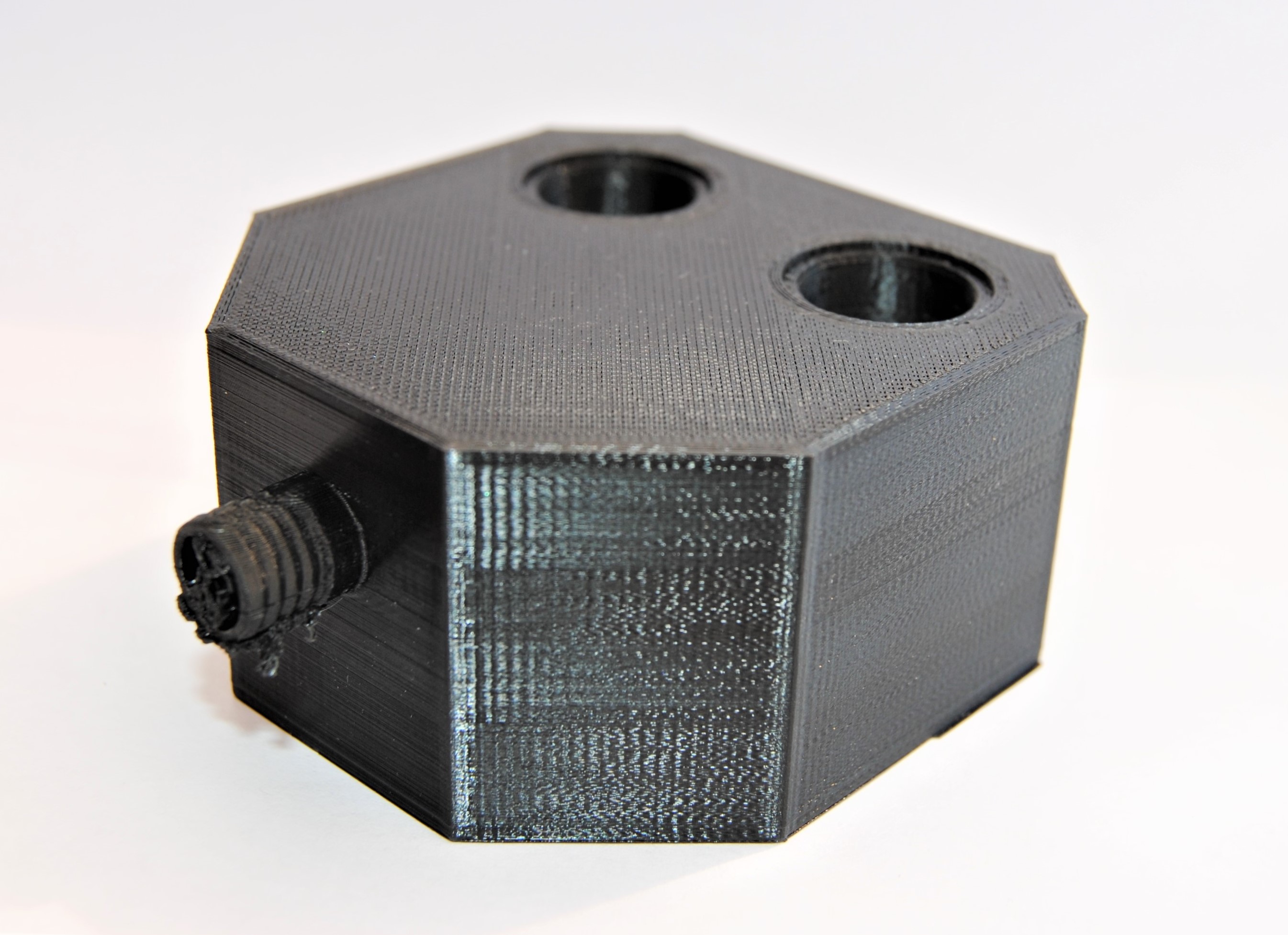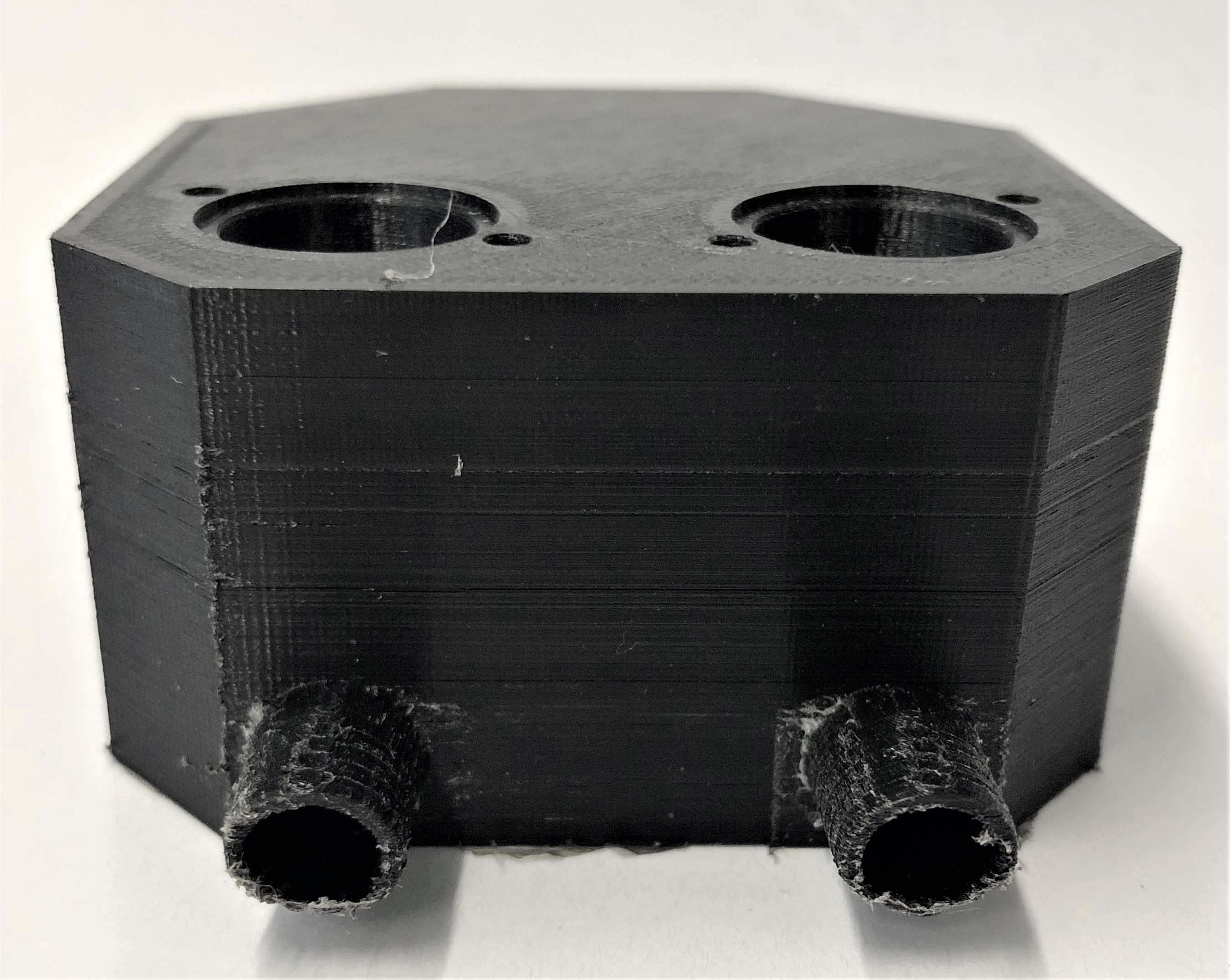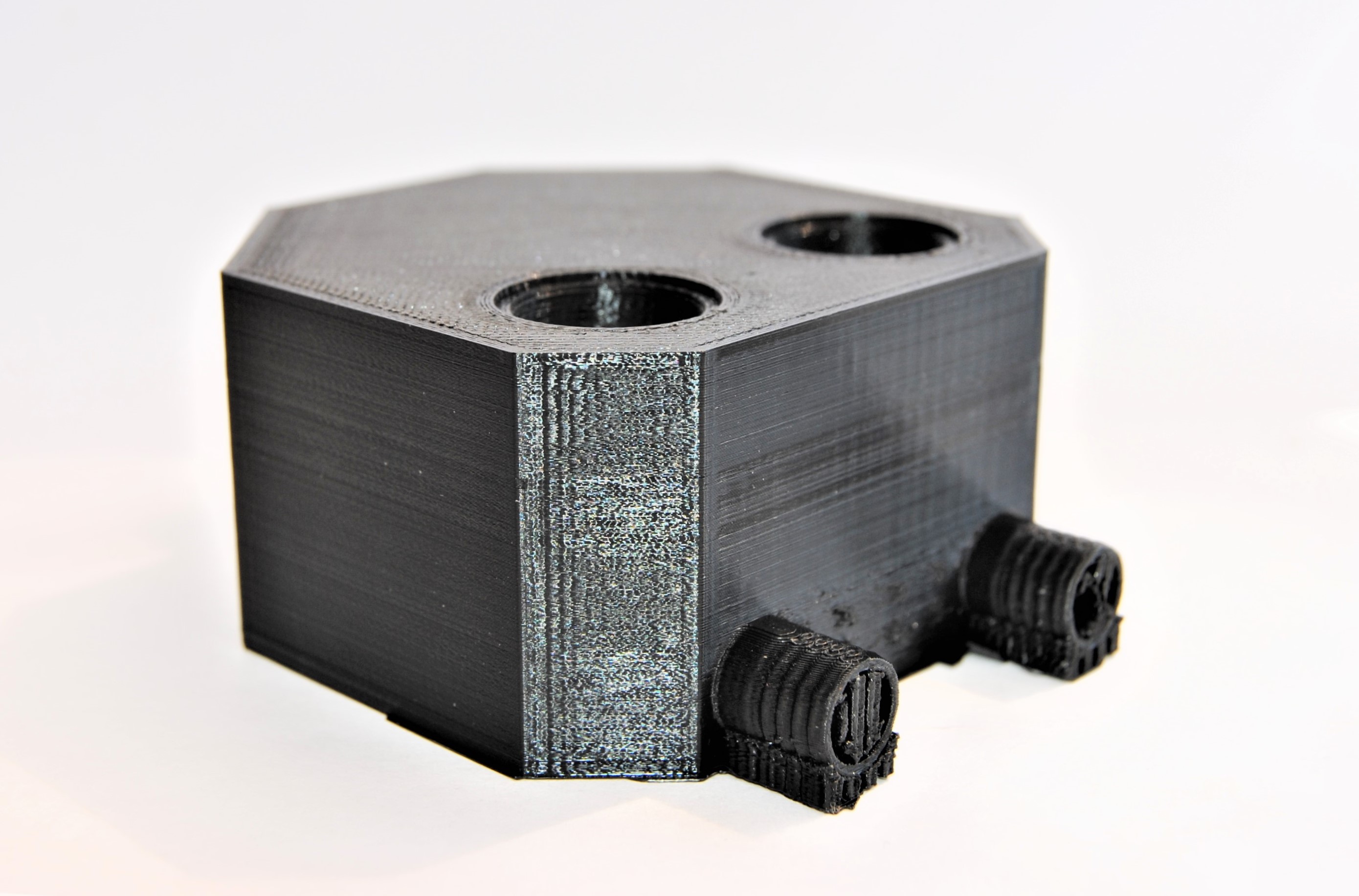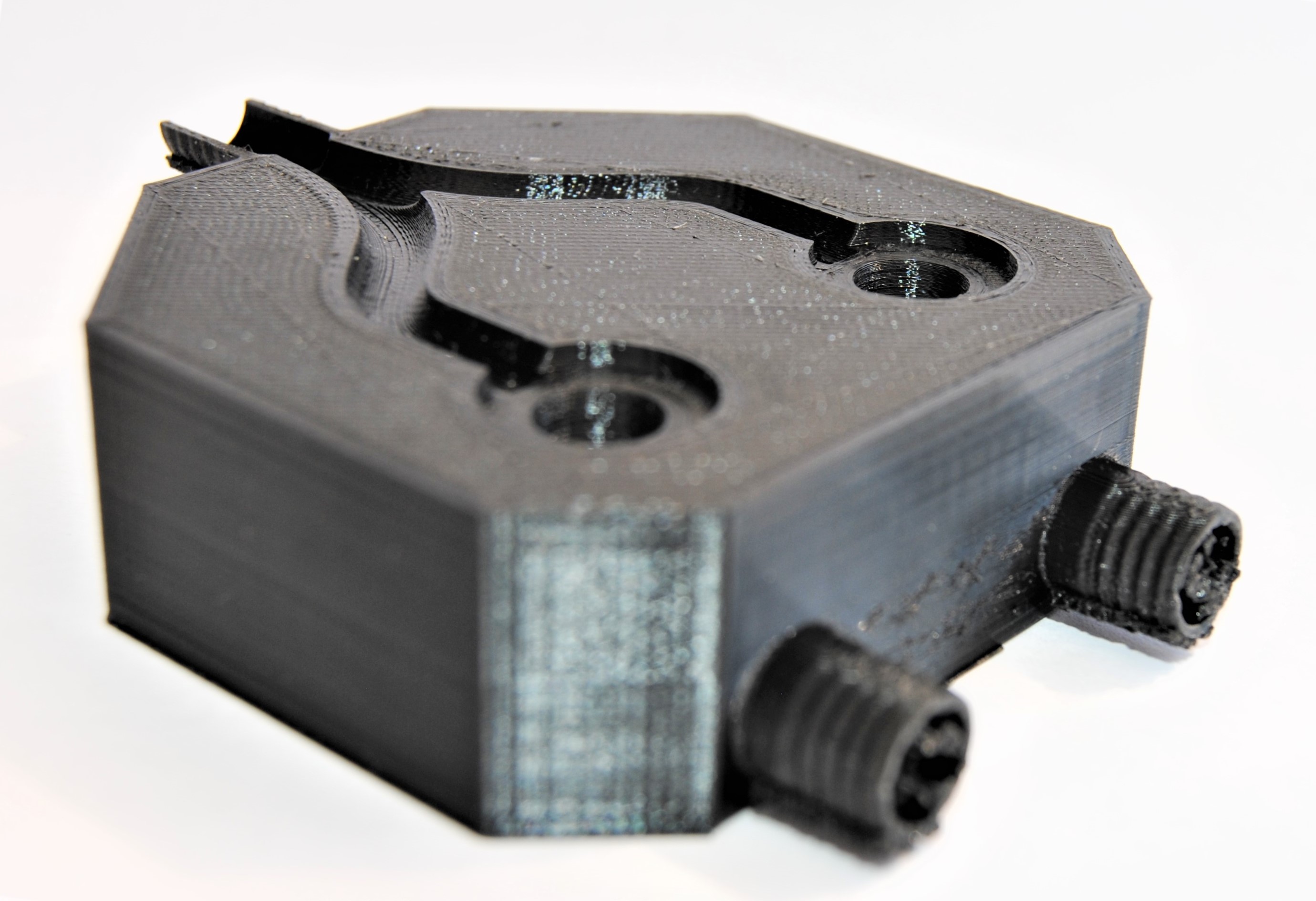 3D-Druck alternatives Mischgehäuse Auch dieser 3D-Druck zeichnet sich mit einer hohen Präzision aus, hat jedoch eine etwas schlechtere Qualität bei den hoch tolerierten Aufnahmen für die Proportionalventile. Da das Entfernen der Schlauchanschlüsse als Grund dieser Verschlechterung ausgeschlossen werden kann, muss es an der Änderung der Fülldichte liegen. Um dies zu Testen, sollten die Cura-Einstellung erneut geändert werden.