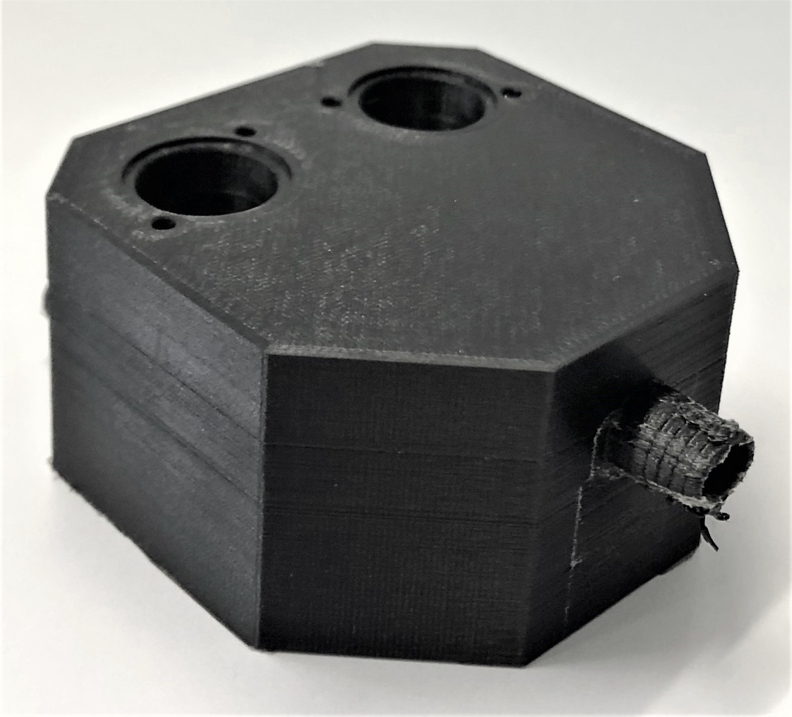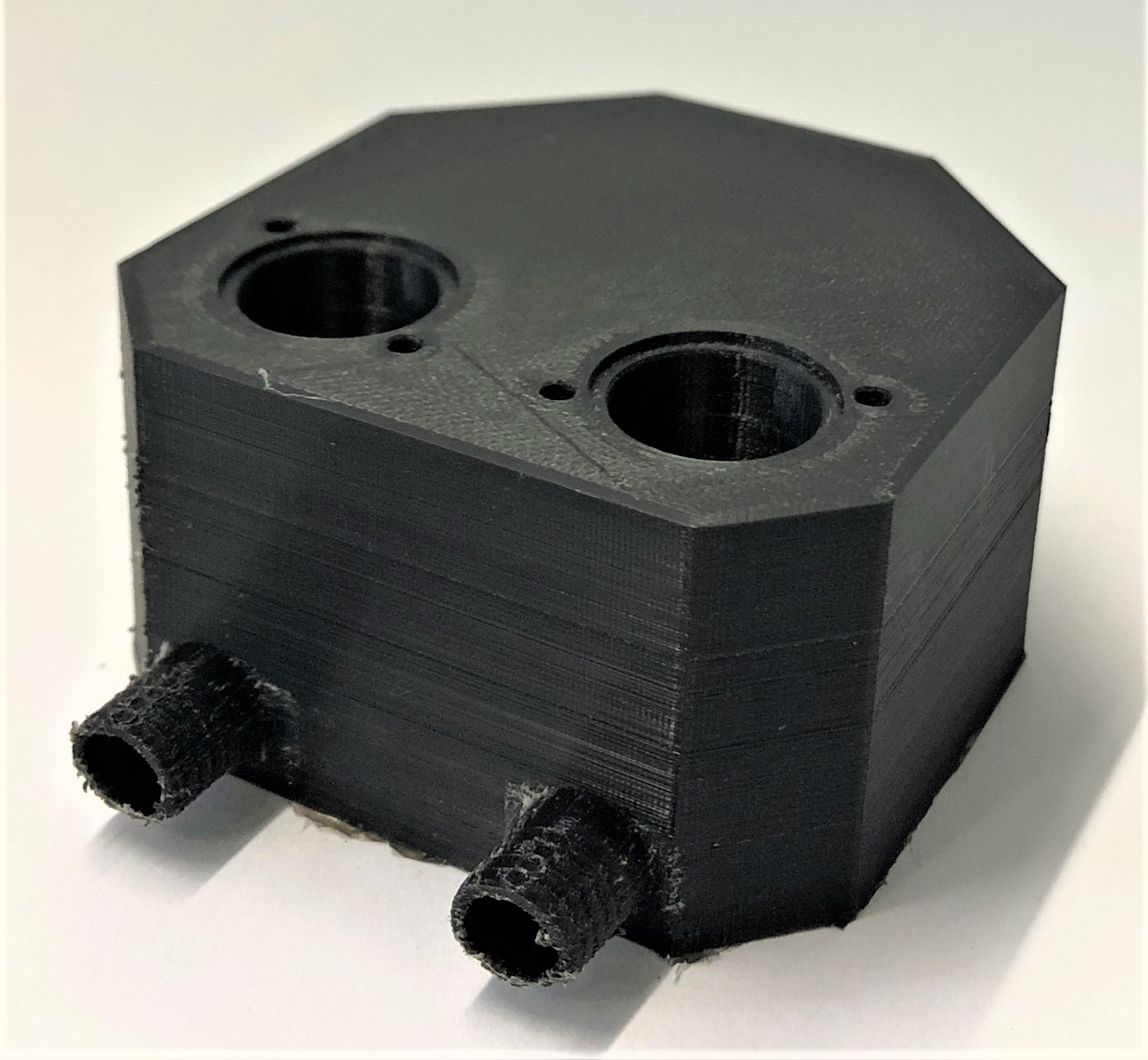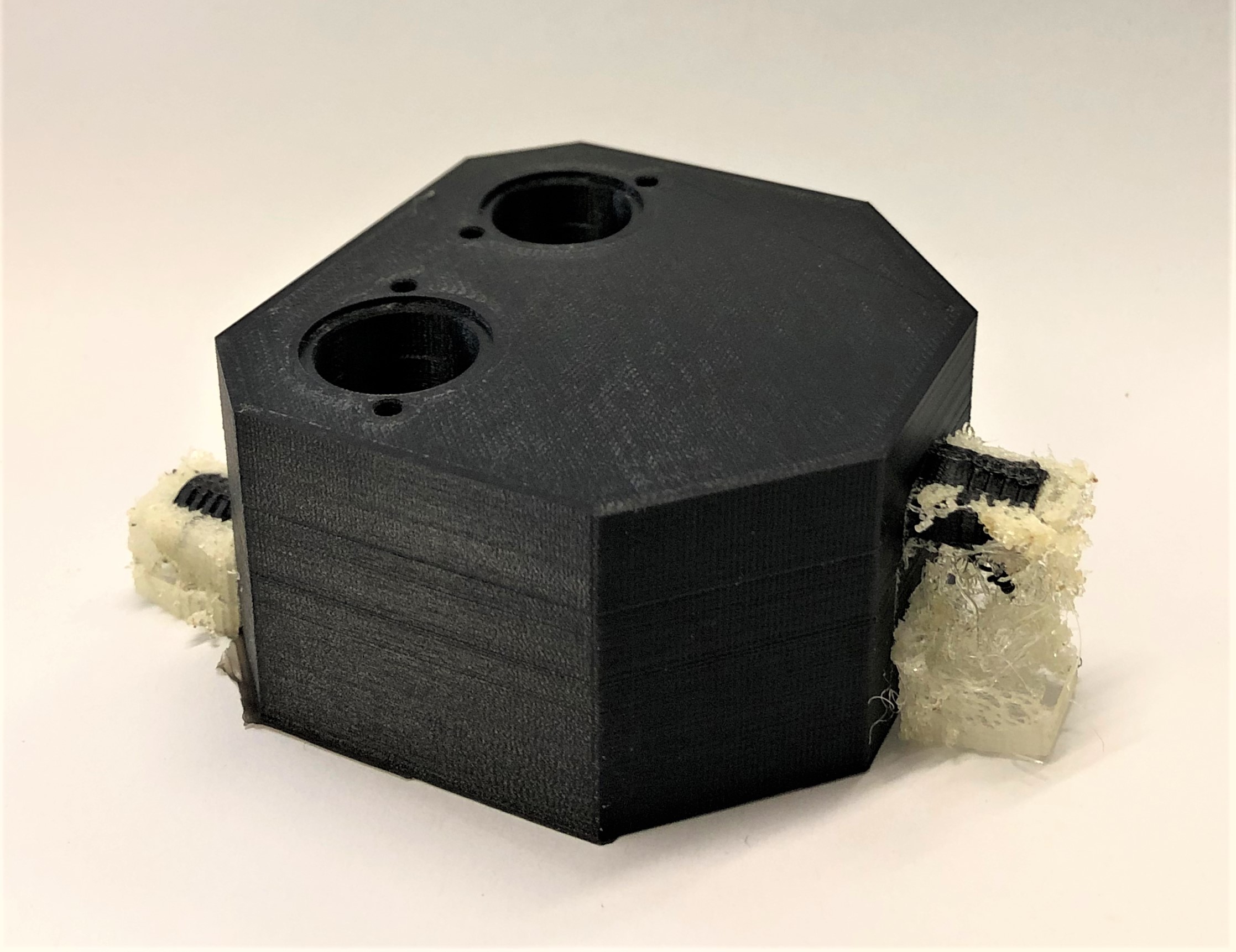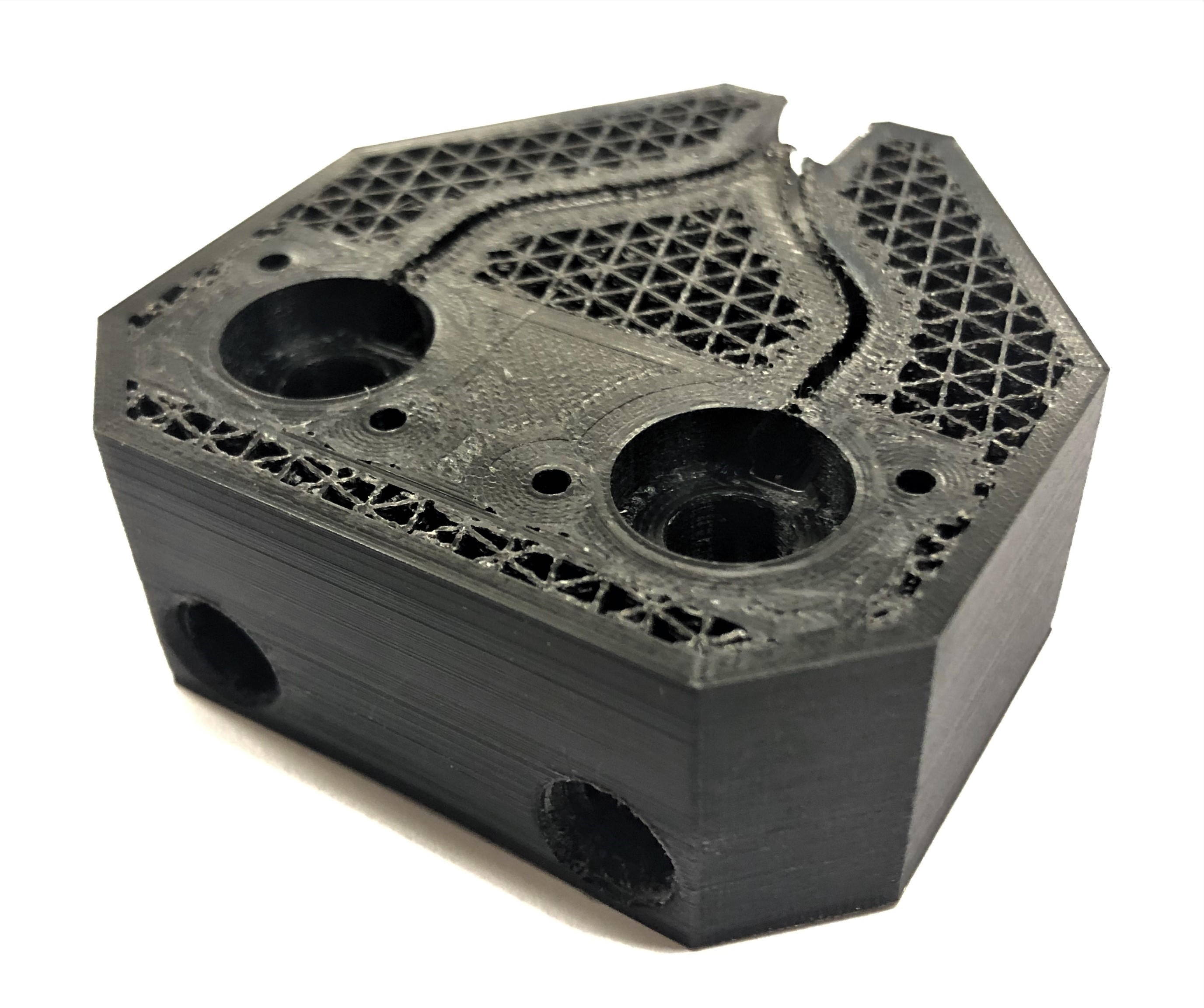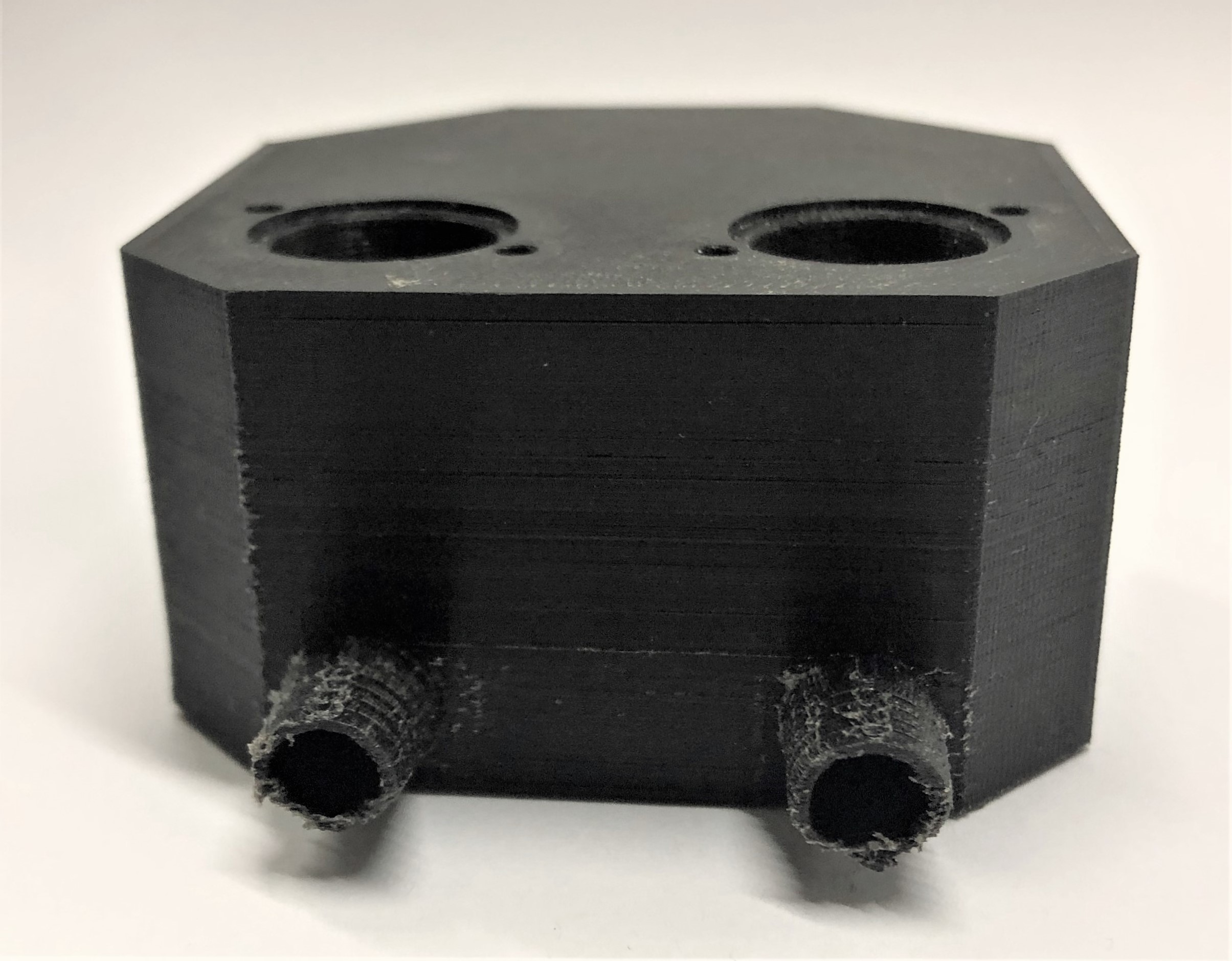3D-Druck alternatives Mischgehäuse Auch dieser 3D-Druck zeichnet sich mit einer hohen Präzision aus, hat jedoch eine etwas schlechtere Qualität bei den hoch tolerierten Aufnahmen für die Proportionalventile. Da das Entfernen der Schlauchanschlüsse als Grund dieser Verschlechterung ausgeschlossen werden kann, muss es an der Änderung der Fülldichte liegen. Um dies zu Testen, sollten die Cura-Einstellung erneut geändert werden.