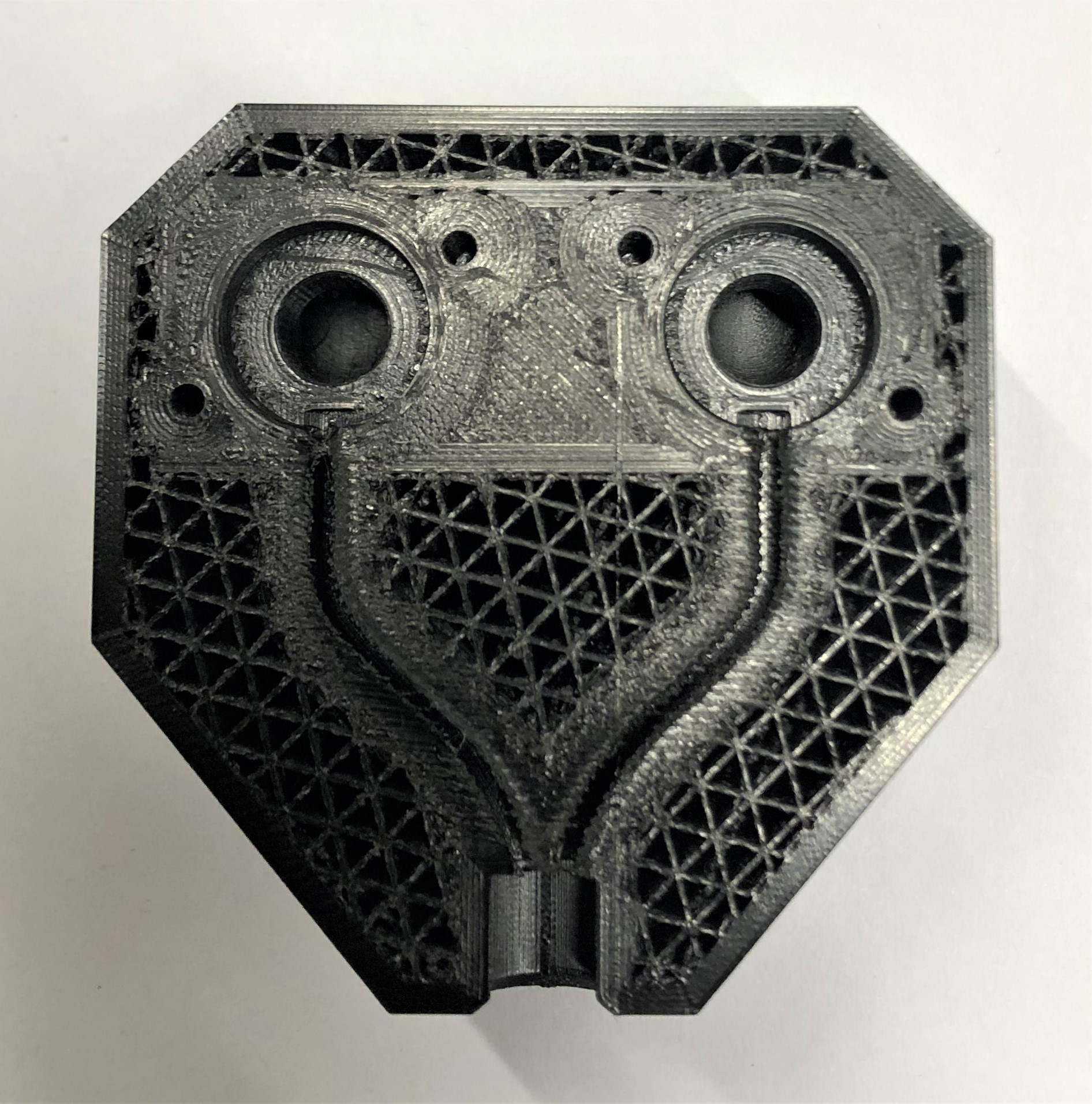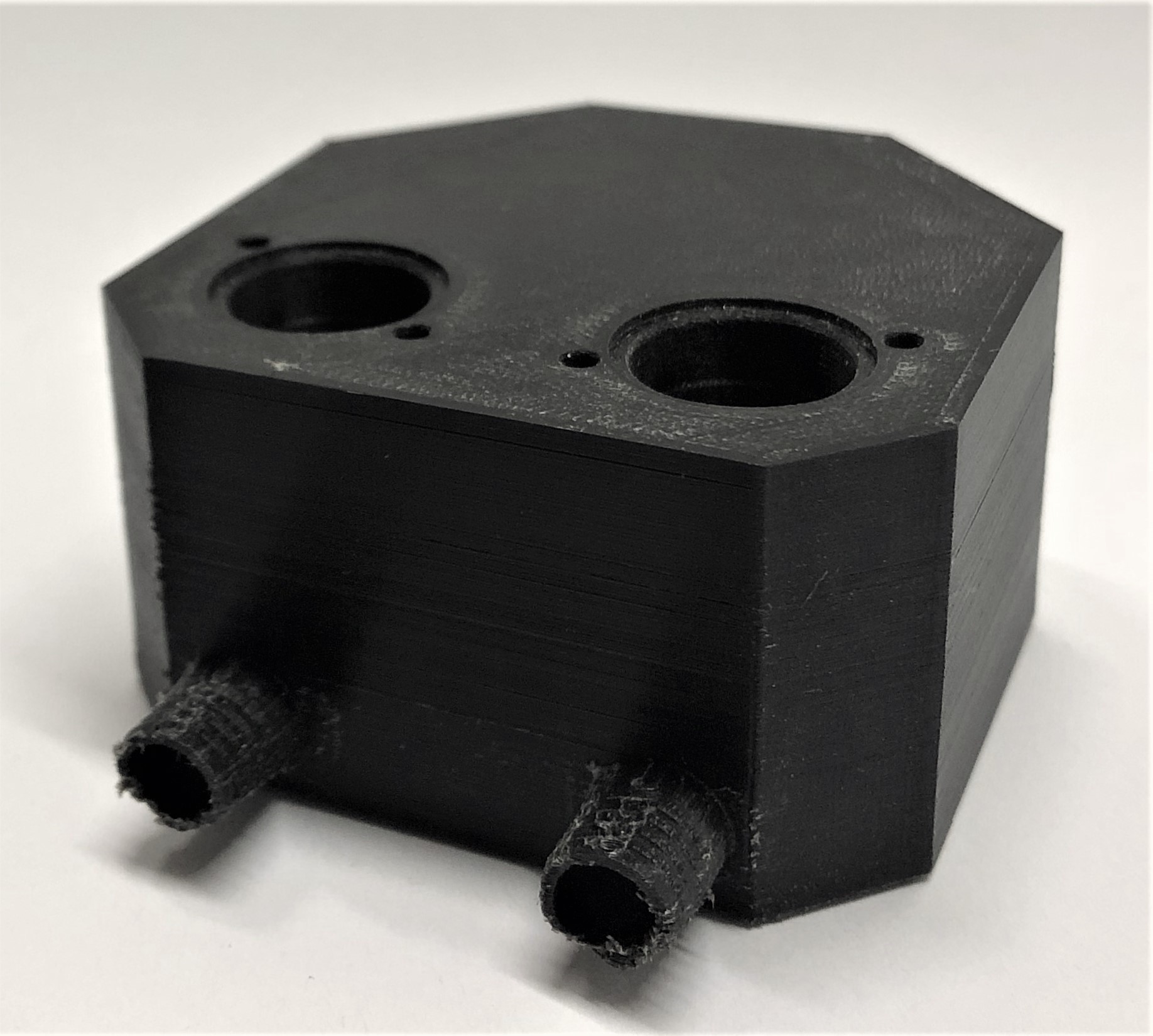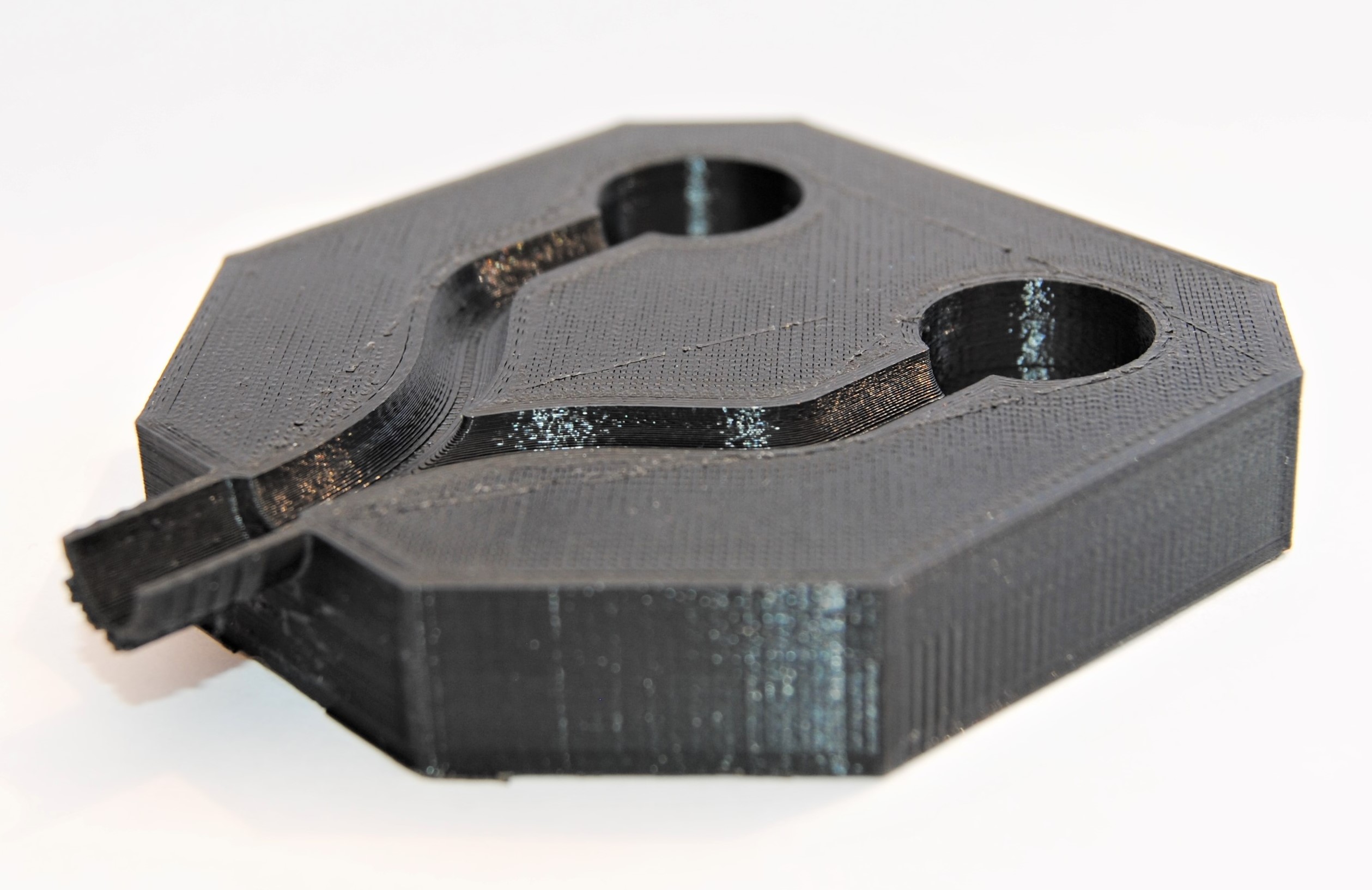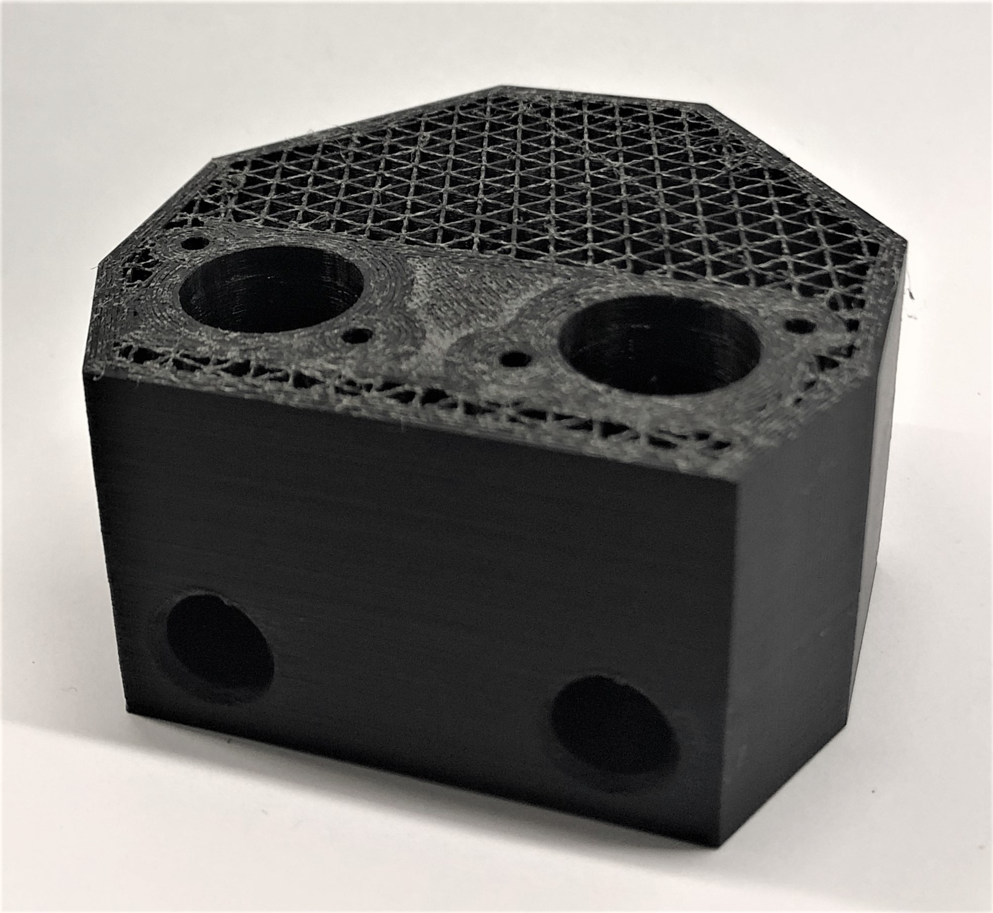 3D-Druck alternatives Mischgehäuse Auch dieser 3D-Druck zeichnet sich mit einer hohen Präzision aus, hat jedoch eine etwas schlechtere Qualität bei den hoch tolerierten Aufnahmen für die Proportionalventile. Da das Entfernen der Schlauchanschlüsse als Grund dieser Verschlechterung ausgeschlossen werden kann, muss es an der Änderung der Fülldichte liegen. Um dies zu Testen, sollten die Cura-Einstellung erneut geändert werden.
