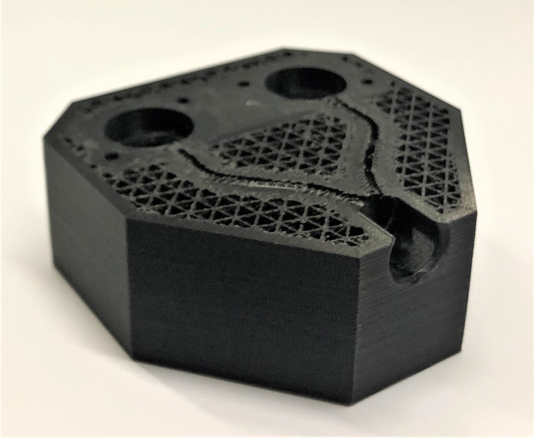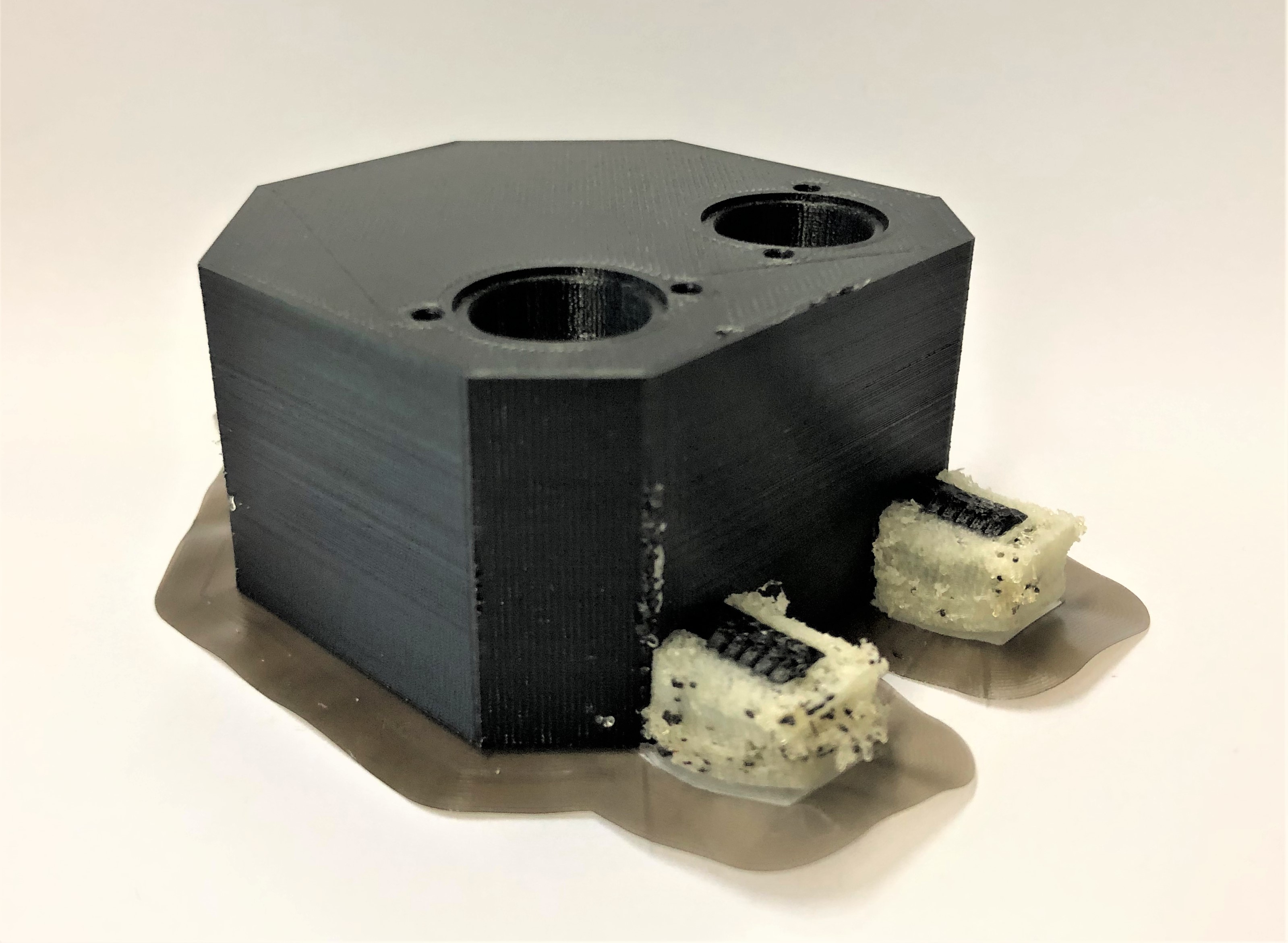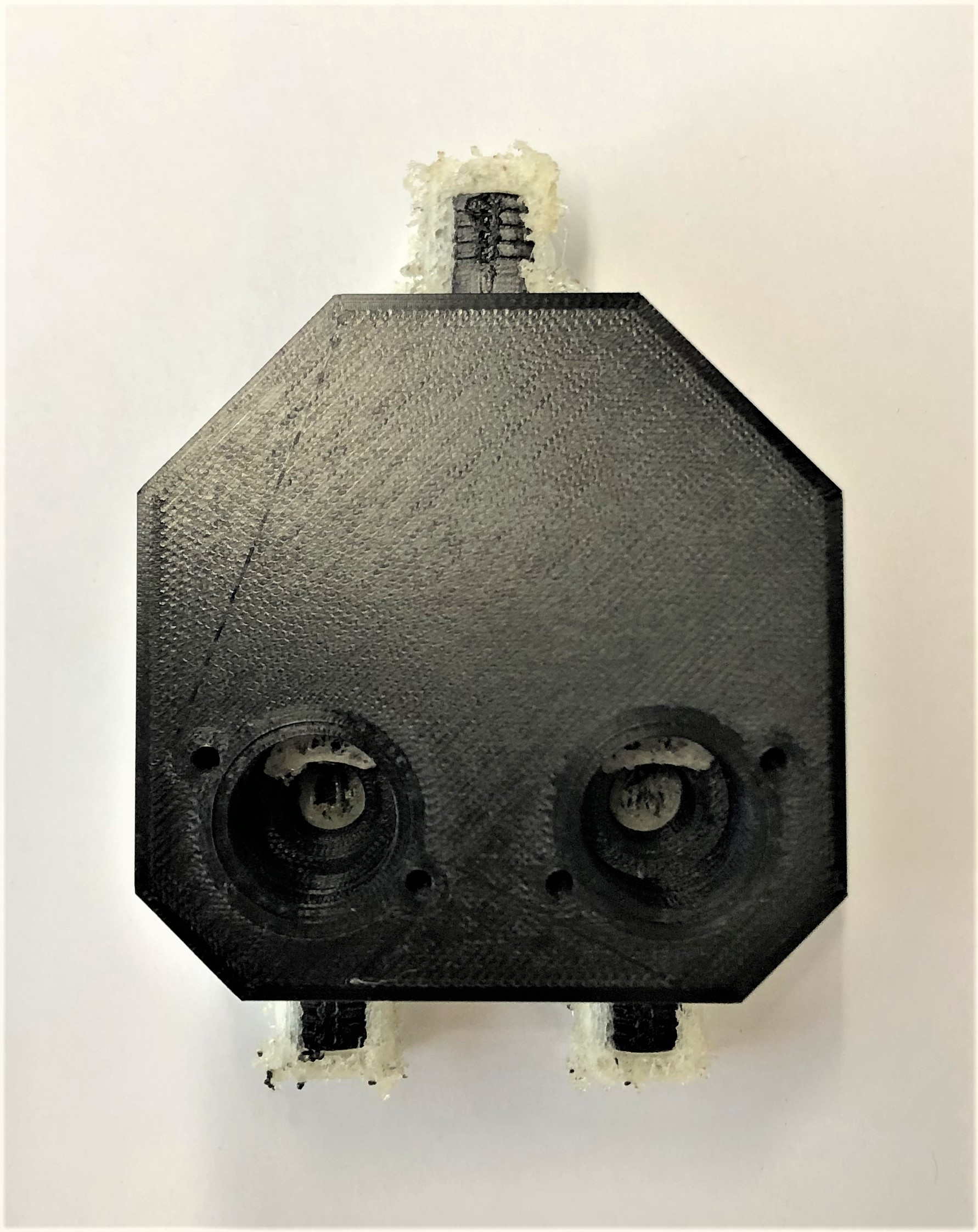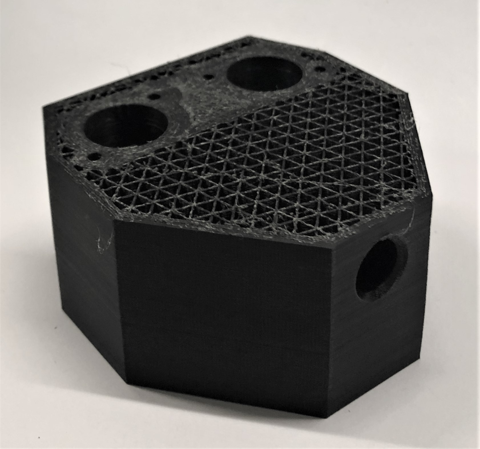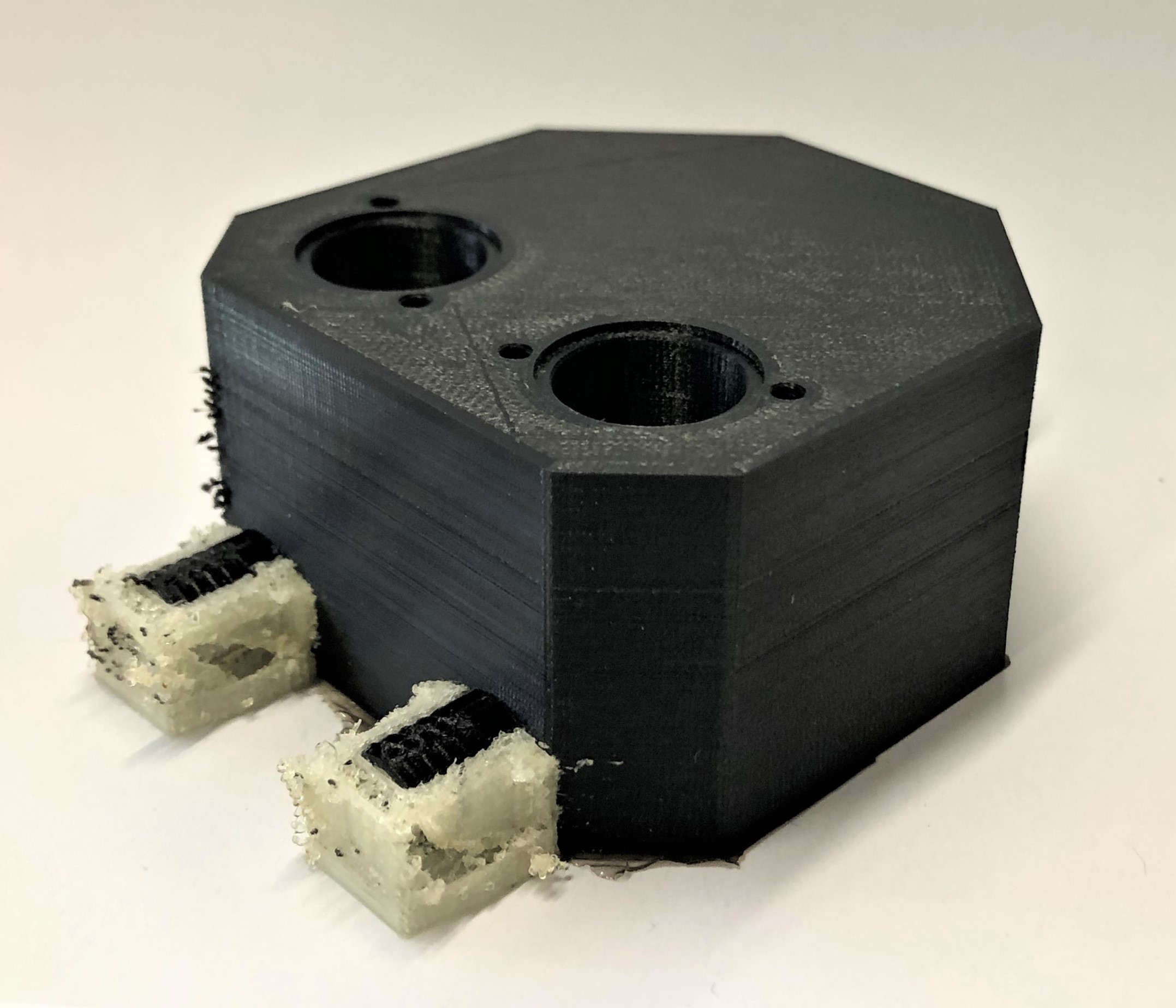 3D-Druck alternatives Mischgehäuse Auch dieser 3D-Druck zeichnet sich mit einer hohen Präzision aus, hat jedoch eine etwas schlechtere Qualität bei den hoch tolerierten Aufnahmen für die Proportionalventile. Da das Entfernen der Schlauchanschlüsse als Grund dieser Verschlechterung ausgeschlossen werden kann, muss es an der Änderung der Fülldichte liegen. Um dies zu Testen, sollten die Cura-Einstellung erneut geändert werden.