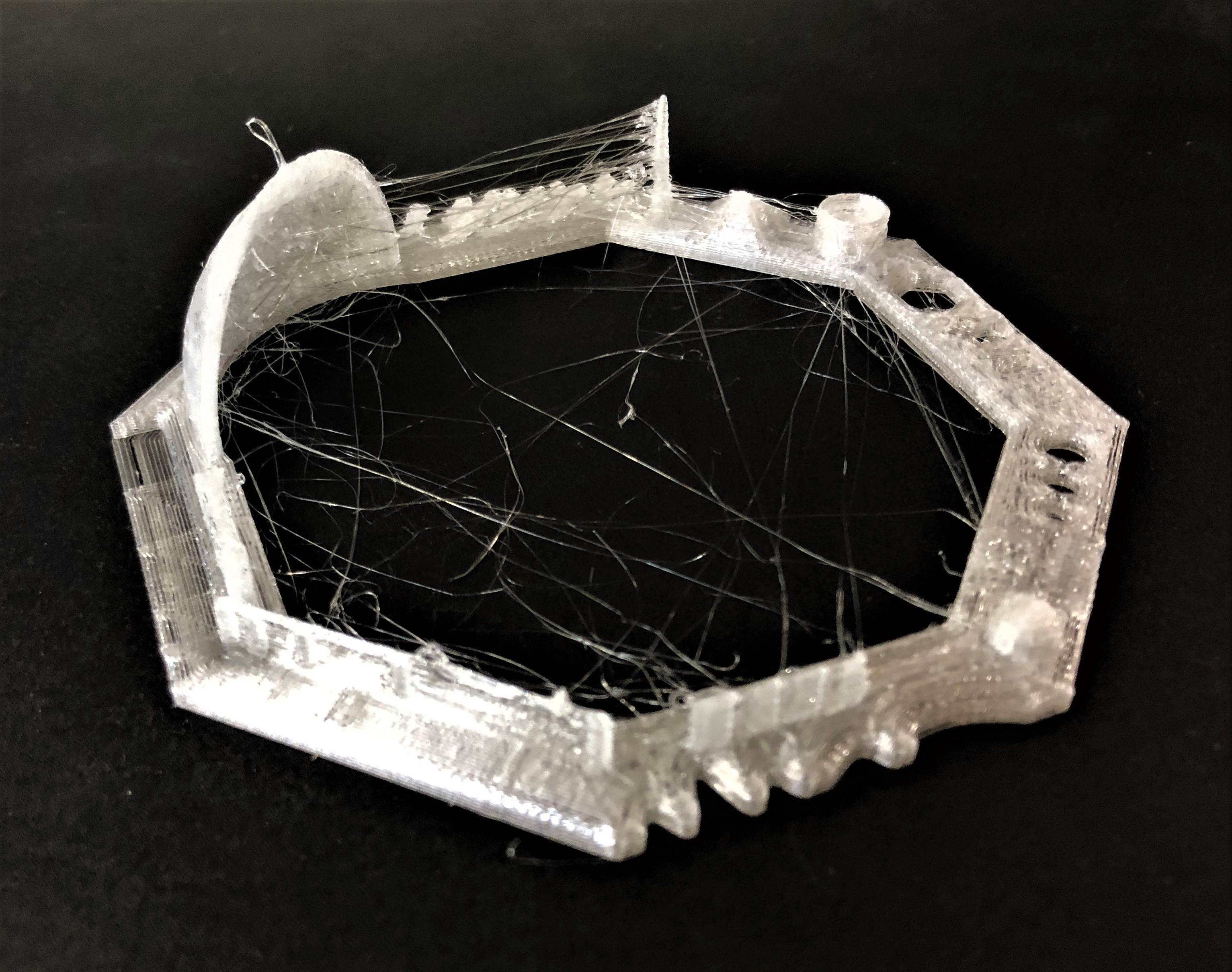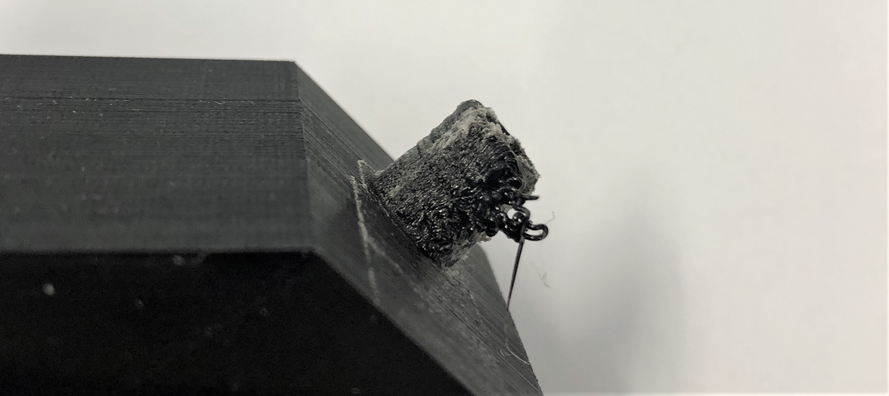 Zweiter 3D-Druck Mischgehäuse Beim zweiten Versuch das Mischgehäuse zu drucken, werden dieselben Cura-Einstellungen verwendet wie beim ersten Druck. Zu sehen ist jedoch, das dasselbe Problem auftritt wie bei dem Versuch zuvor, wobei die Luftfeuchtigkeit innerhalb der Toleranz von unter 50 % liegt. Das Problem mit dem PVA scheint im Vergleich zu vorher aber an den Schlauchanschlüssen hinten weniger gravierend zu sein, wie auch auf den Bildern unten zu sehen ist. Das Bild ganz links zeigt ebenfalls, dass sich auf dem Druckbett verteilt überall kleine Filamentreste des PVA befinden, weshalb vielleicht die zu hohe Umgebungstemperatur ein Grund dafür sein könnte, dass das Material so spröde ist.