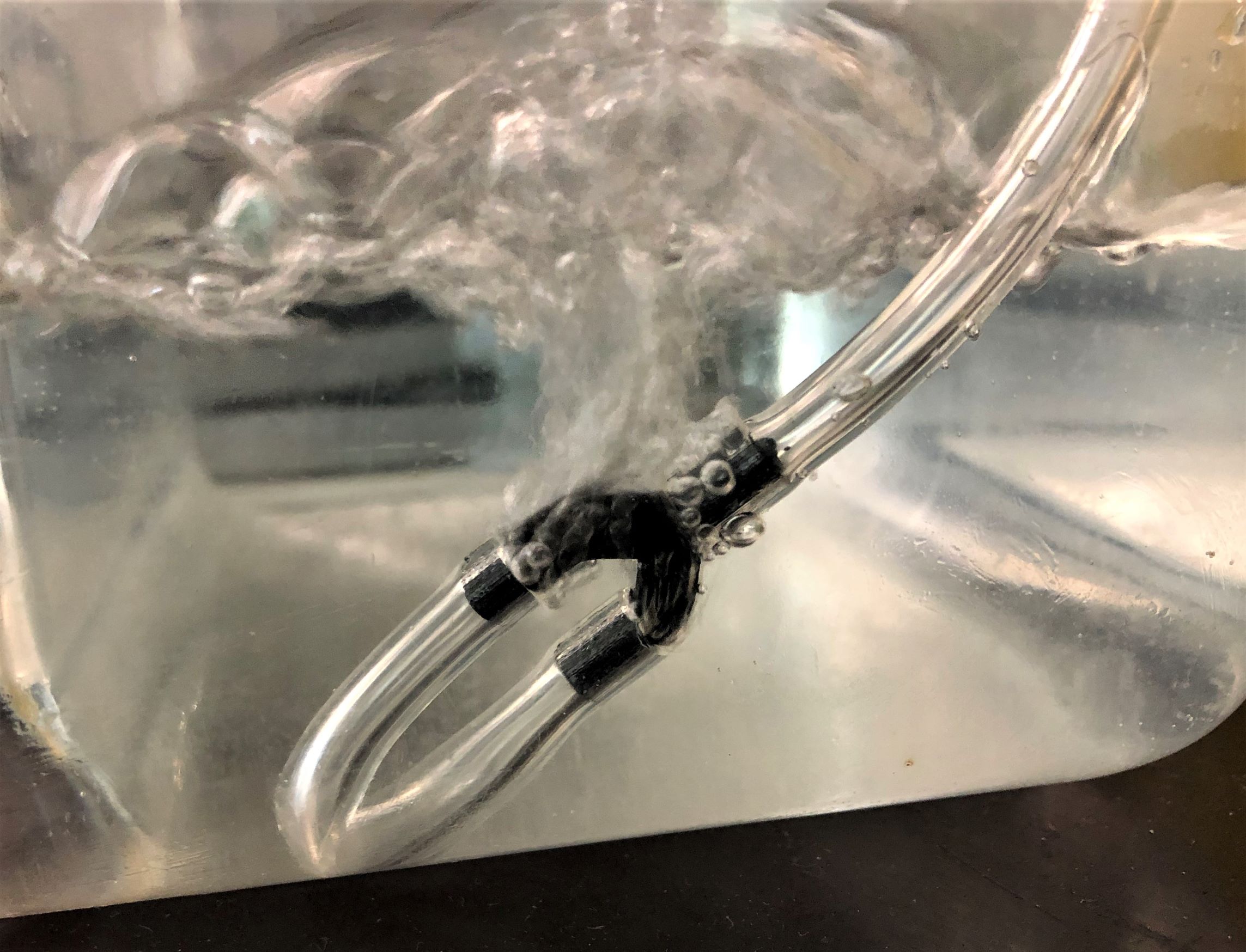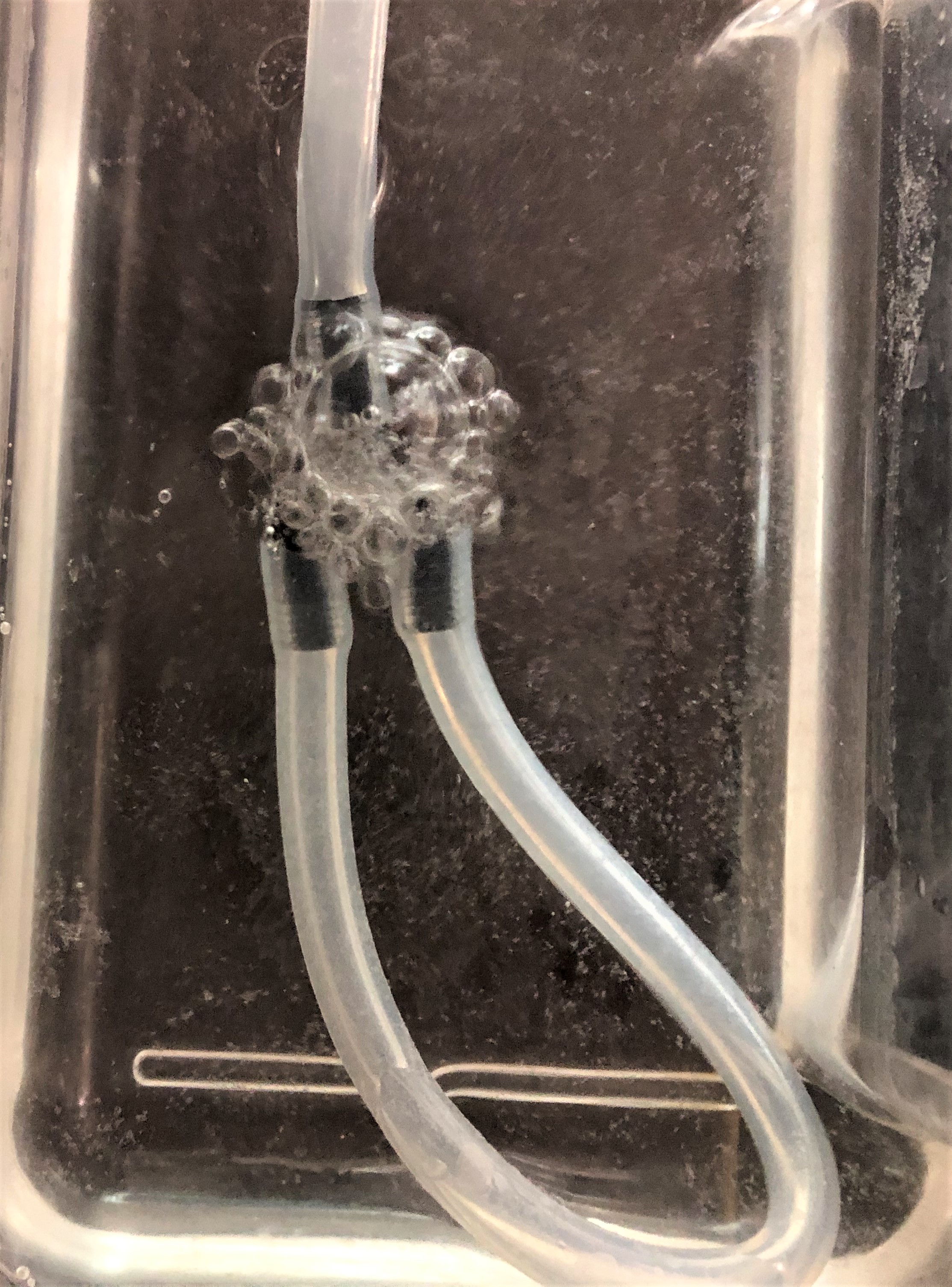 Der Test zeigte eine Bläschenbildung an den Verbindungsstellen zwischen dem Verbindungsstück 2 und dem Stopfen beziehungsweise dem Schlauch. Aus dem Bauteil tritt jedoch keine Luft aus und ist somit dicht. Verbindungstest mit dem Schlauch