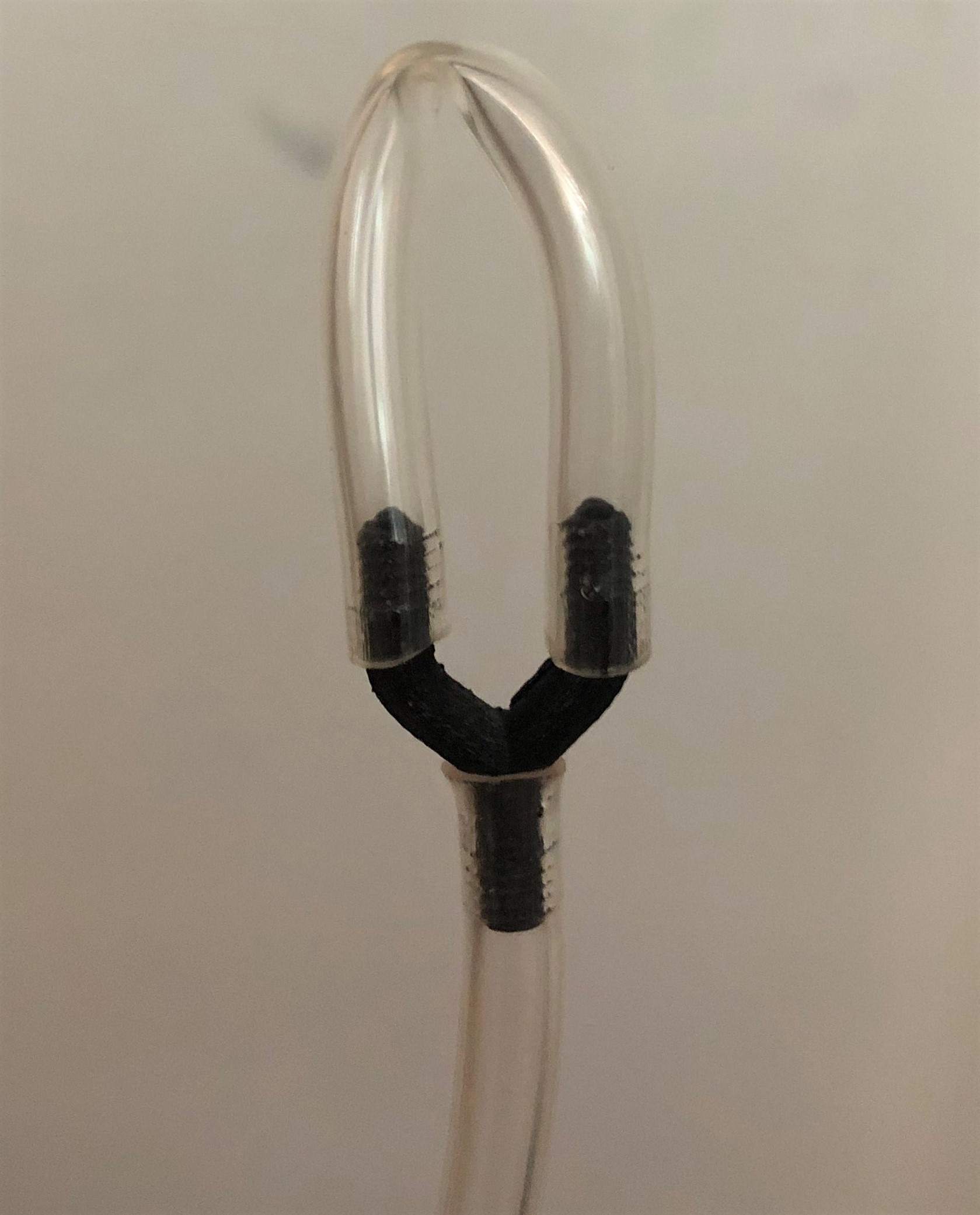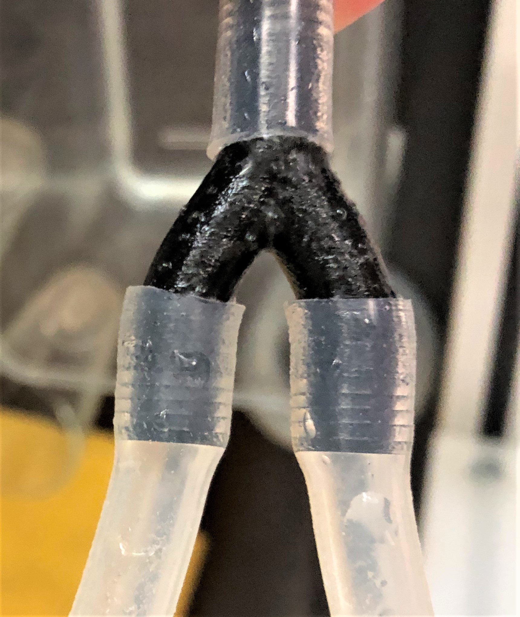 Dichtigkeitstest Für den Dichtigkeitstest zwischen Schlauch und Y-Stück wurden folgende Komponenten verwendet: - das gedruckte Bauteil - der PVC-Schlauch mit den Maßen 4,00 x 1,00 x 6,00 mm - 2 bar Druckluft - ein Gefäß mit Wasser. Bei diesem Versuch wurde auf die eine Seite des Y-Stücks die Druckluft von knapp zwei Bar angeschlossen, während die anderen beiden Abweigungen mit einem Stück des Schlauchs kurzgeschlossen wurden, wie in den Abbildungen unten zu sehen ist.