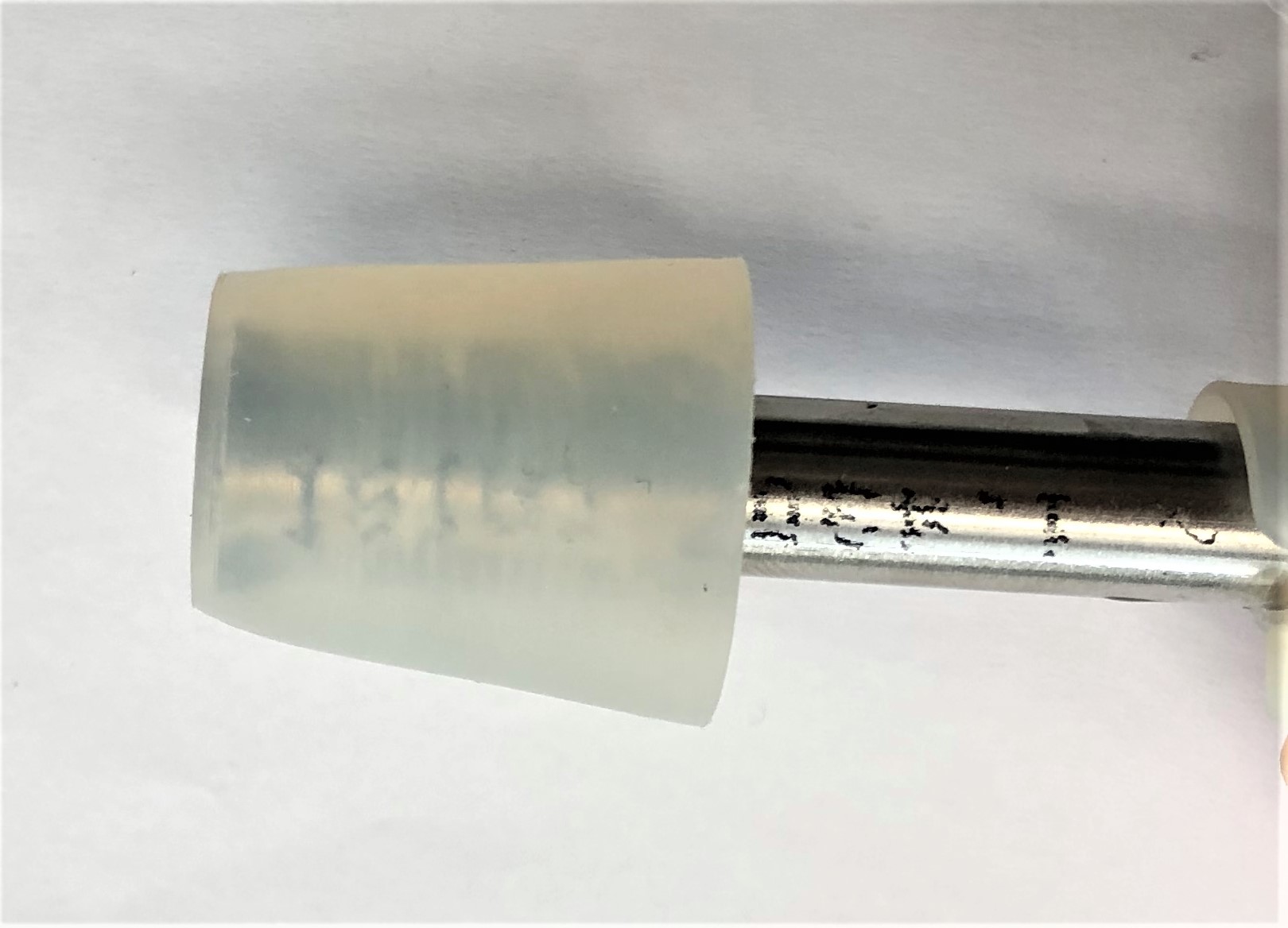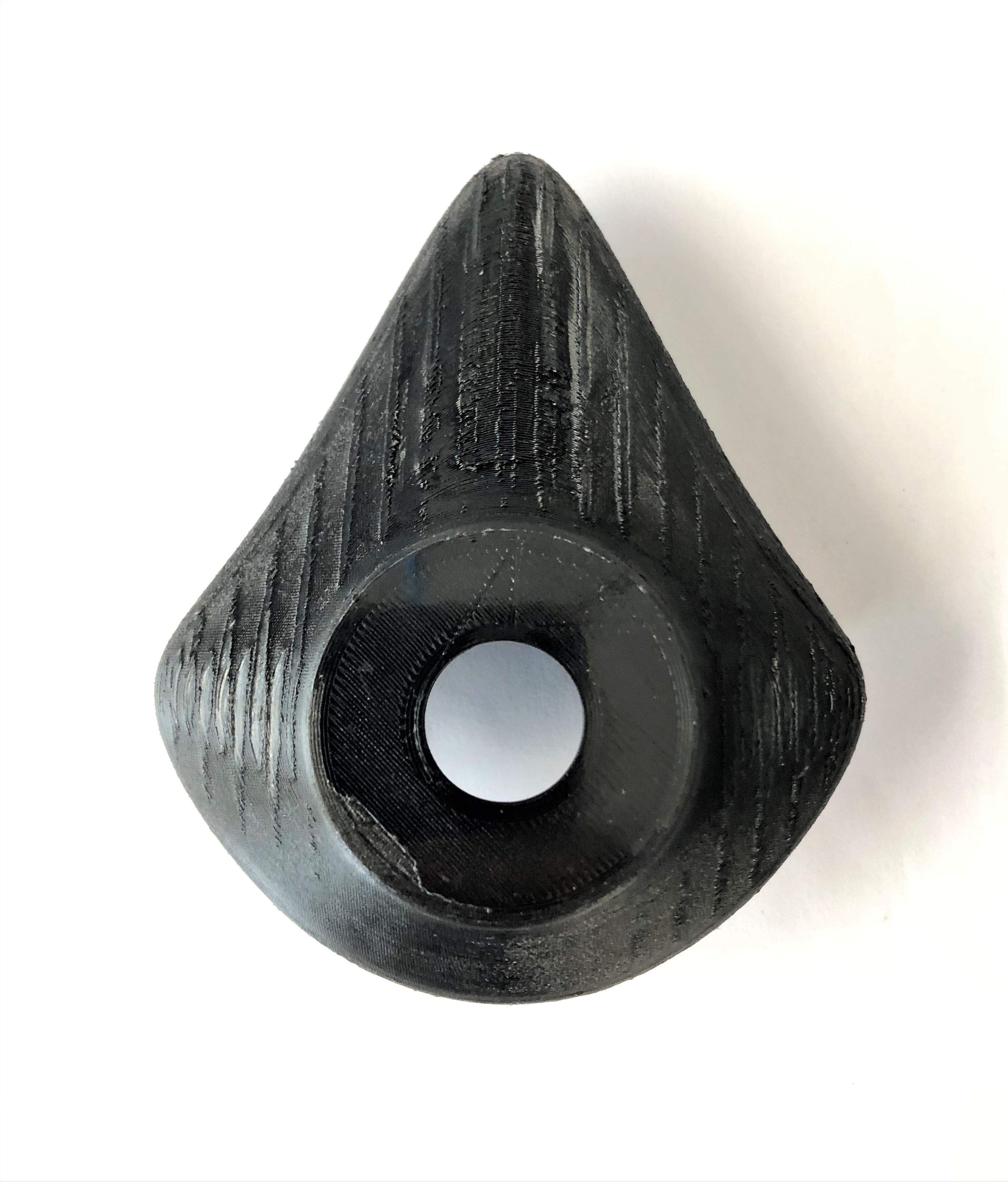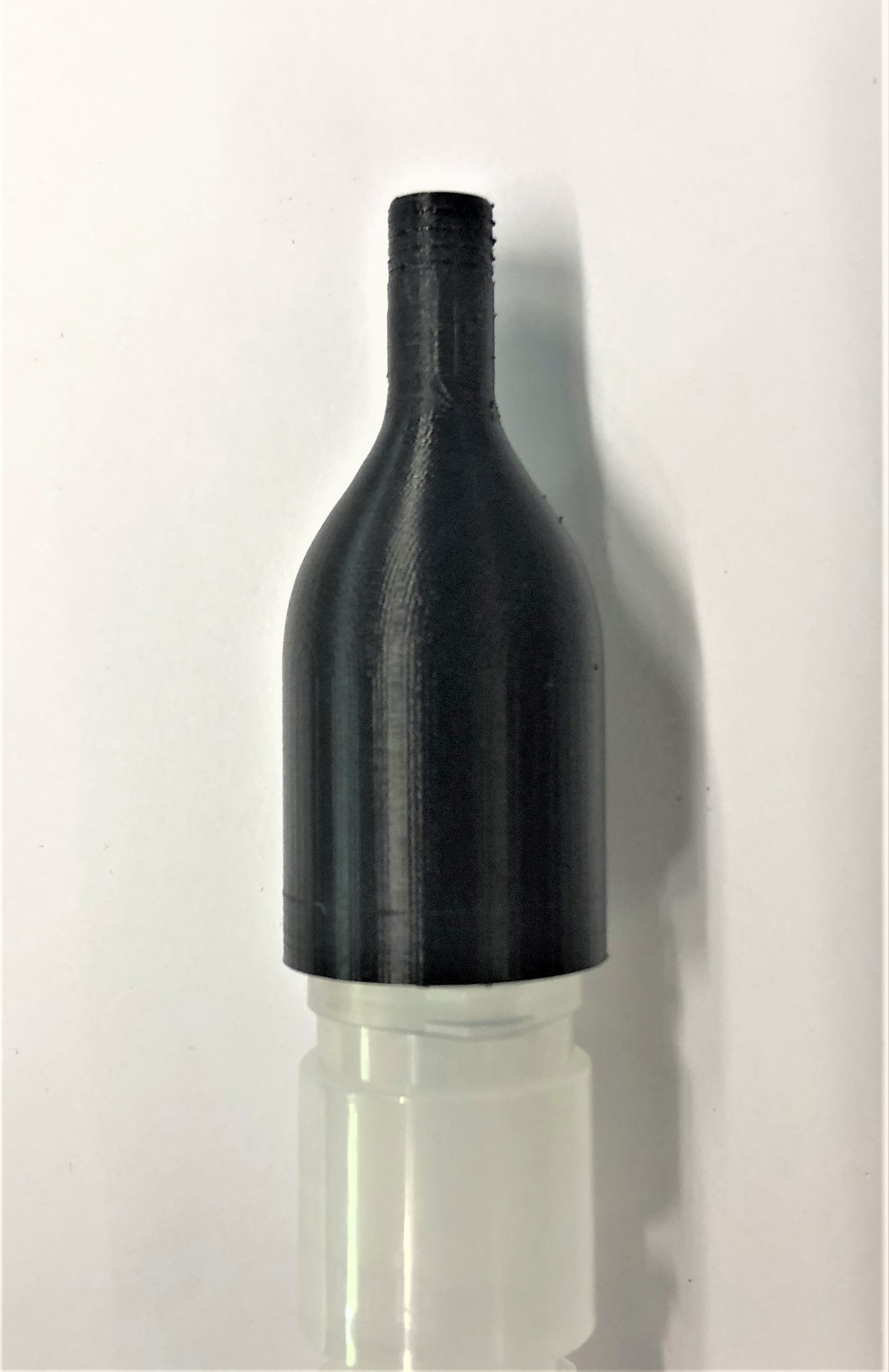 Erster Probedruck Für den ersten Probedruck wird das Material PETG verwendet. Durch die Bauteilgeometrie kann es vertikal gedruckt und durch den steilen Winkel auf Support verzichtet werden. Es entsteht eine glatte Außenfläche, jedoch eine raue Innenfläche durch zurückgebliebene Filamentreste. Da sich die Innenfläche der ISO 5356 anpassen muss, sollte die Oberfläche eine sehr glatte und genaue Fläche sein. ![]() Abb.: Probedruck Verbindungsstück 2 Zweiter Probedruck Für den zweiten Probedruck wurde das Material PA verwendet, das auch später zum Einsatz kommen soll. Auch hier kann das Bauteil, bedingt durch die Bauteilgeometrie, vertikal und durch den steilen Winkel ohne Support gedruckt werden. Durch eine Schichtdicke von 0,05 mm entsteht sowohl Außen als auch Innen eine sehr glatte und hochwertige Oberfläche. Lediglich auf einer Seite des Verbindungsstücks sind kleine Filamentreste zu erkennen, da beide Verbindungsstücke gleichzeitig gedruckt und somit bei dem Verfahrweg des Extruders Filament mitgenommen wurde und dabei erhärtet ist. Da jedoch nur die Innenoberfläche von Bedeutung ist, kann dies vernachlässigt werden. ![]() Abb.: Probedruck Verbindungsstück 2 Stopfen Um auch dieses Verbindungsstück auf Dichtigkeit zu prüfen, wird ein Stopfen konstruiert, der das Bauteil auf der einen Seite abdichten soll, während auf der anderen Seite Druckluft angeschlossen wird. Auch der Stopfen besitzt einen leicht konischen Verlauf, damit er sich dem Verbindungsstück 2 optimal anpassen kann.
