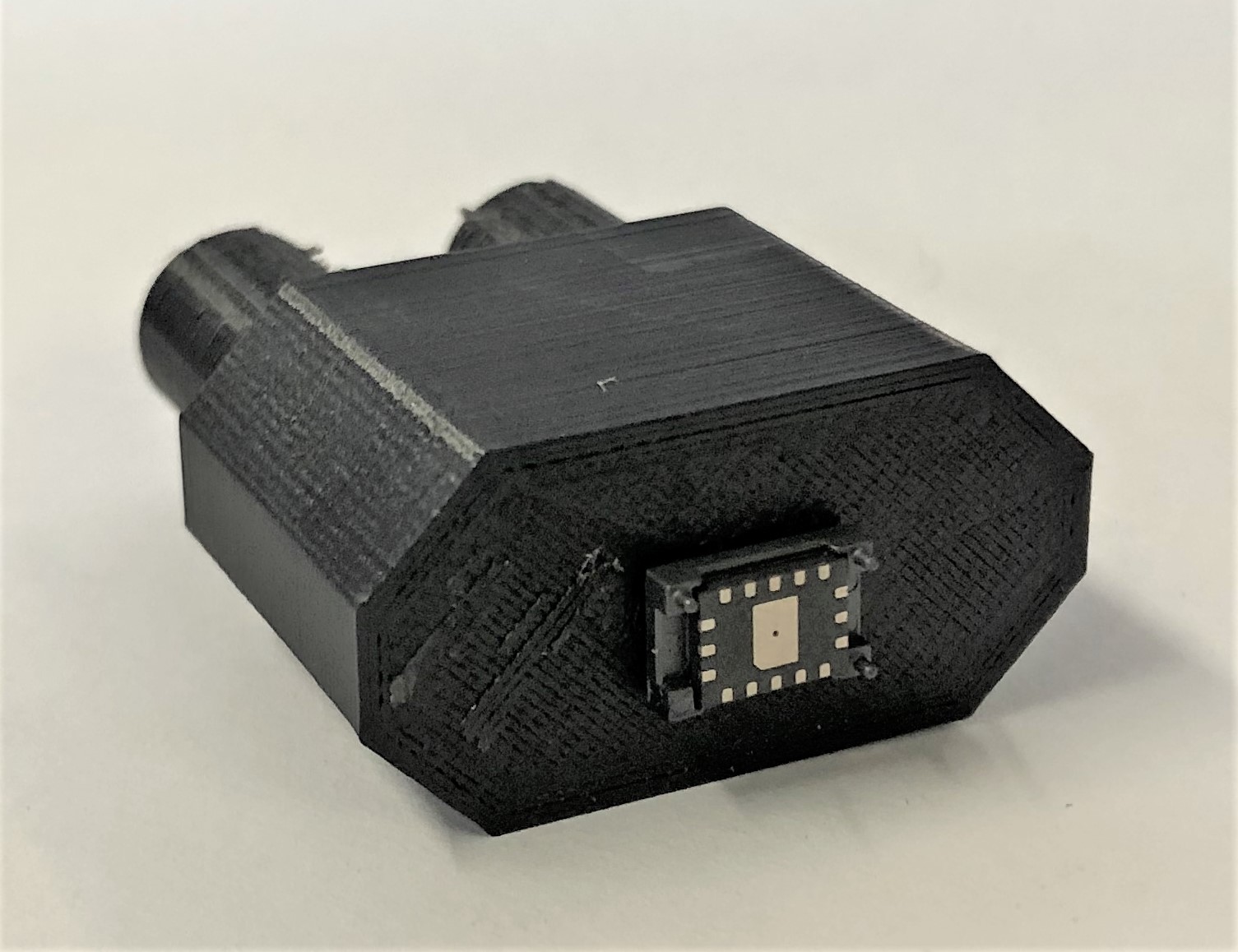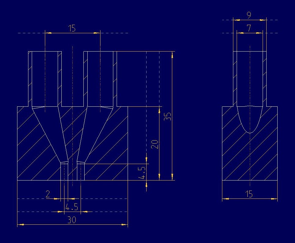 Verbindungsstück 4 Um einen Drucksensor zu testen, wird ein weiteres Verbindungsstück benötigt und zwar zwischen dem Drucksensor und zwei Schlauchanschlüssen. Der Drucksensor hat zwei Anschlüsse mit einem Durchmesser von jeweils 2 mm. Diese Anschlüsse sollen mit dem Schlauch aus Silikonelastomeren verbunden werden. Konstruktionsentwurf Für den Sensor werden im Bauteil zwei Löcher mit einem Durchmesser von 2 mm und einem Lochabstand von 4,5 mm vorgesehen. Die beiden Schlauchanschlüsse haben einen Außendurchmesser von 9 mm, einen Innendurchmesser von 7 mm und einen Lochabstand von 15 mm. Die jeweilige Verbindung von Sensoranschluss zu Schlauchanschluss hat einen konischen Verlauf innerhalb des Bauteils. Die Gesamtgröße des Bauteils beträgt 30 x 15 x 35 mm. Um Material einzusparen wurden die Kanten mit Fasen versehen.