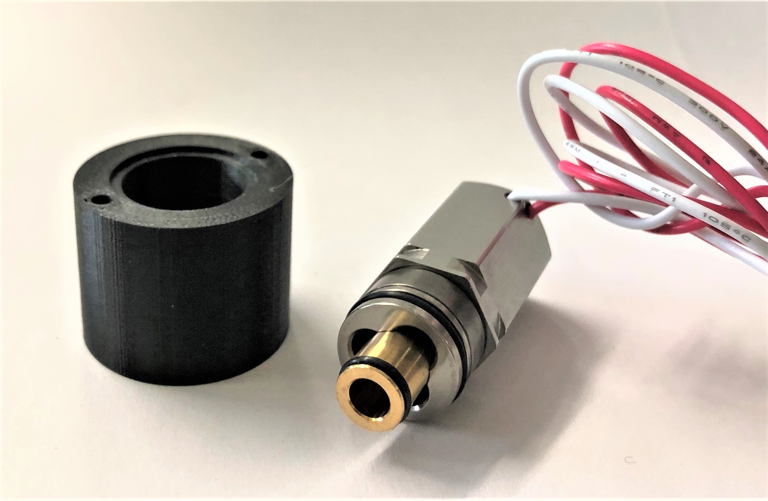 Der erste 3D-Druck zeigt, dass jedes Innenmaß um circa 0,1 mm kleiner gedruckt wird, als es konstruiert wurde. Daher besteht die Gefahr, das Ventil beim Reindrücken zu beschädigen. Die Konstruktion wird deshalb so angepasst, dass jedes Maß um 0,1 mm vergrößert wird und ein zweiter Druck soll zeigen, ob das Bauteil nun besser hineinpasst. Der Testadapter ist beim zweiten Druck viel präziser geworden, wodurch auch die Innenfläche glatter ist. Das Proportionalventil lässt sich gut mit dem Bauteil verbinden.