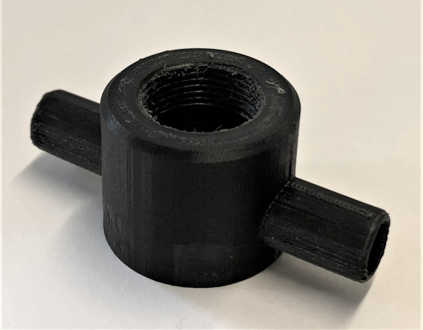 3D-Druck Verbindungsstück 3 wurde mit PA und einer Schichtdicke von 0,05 mm gedruckt, damit ein sauberes Gewinde beim Gewindeschneiden entsteht. Für die zwei Schlauchanschlüsse muss beim Drucken Support verwendet werden.