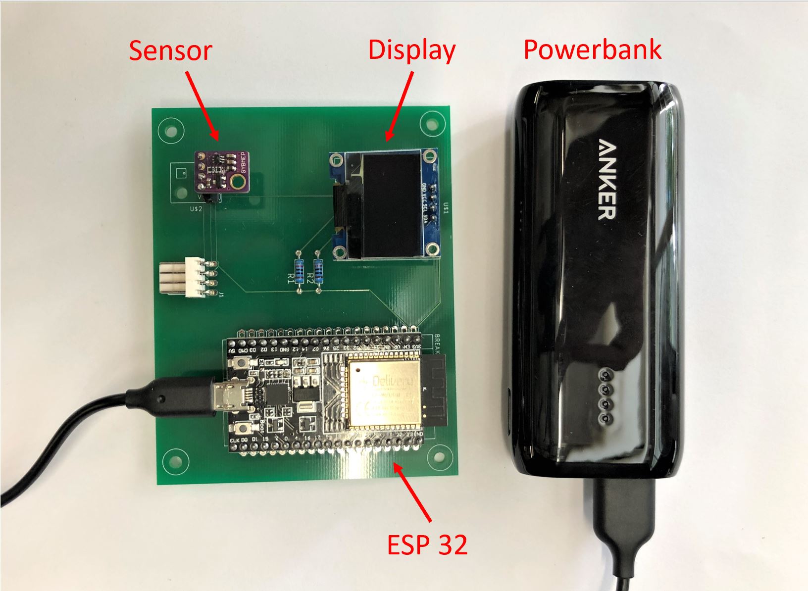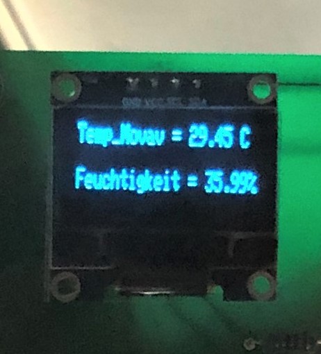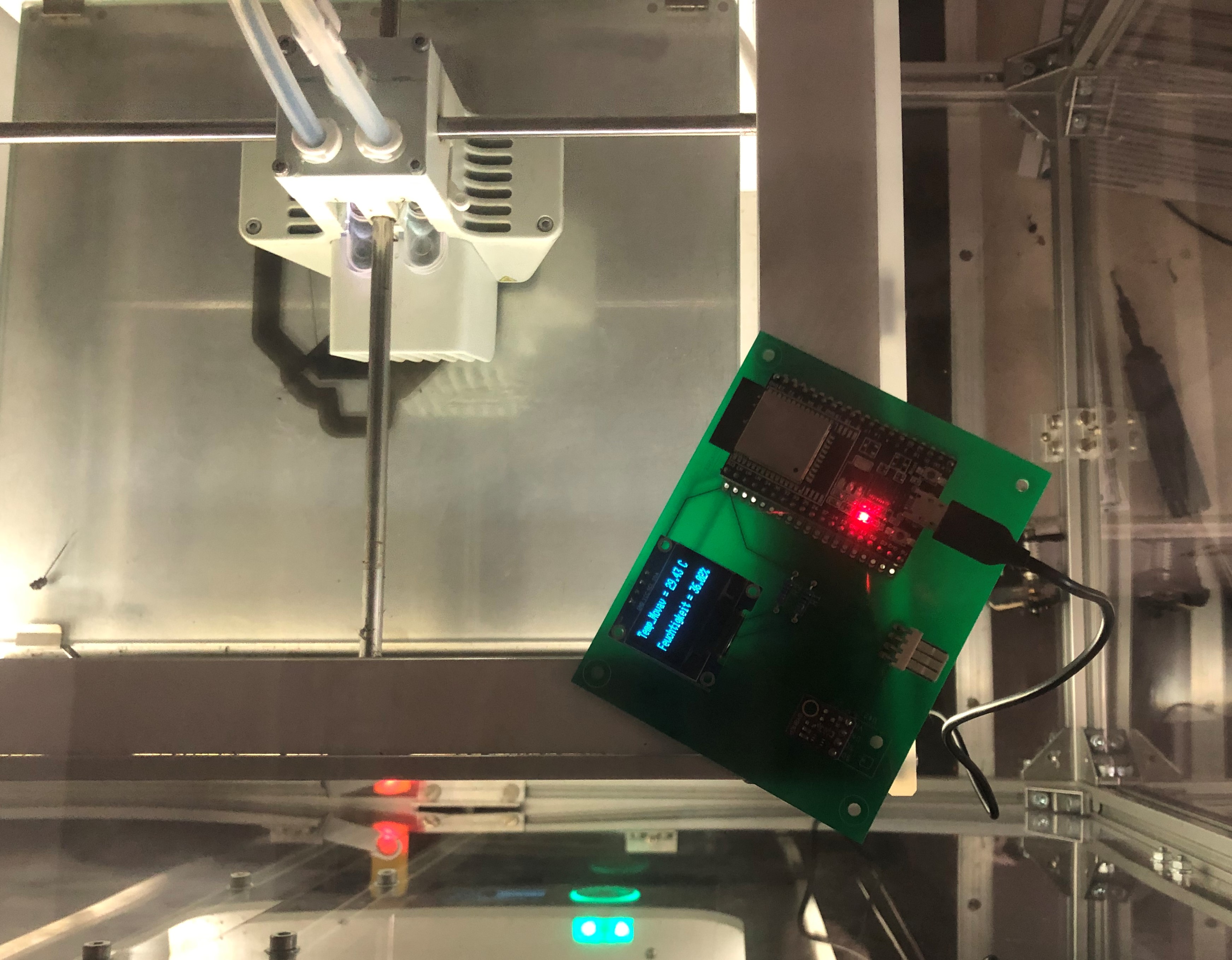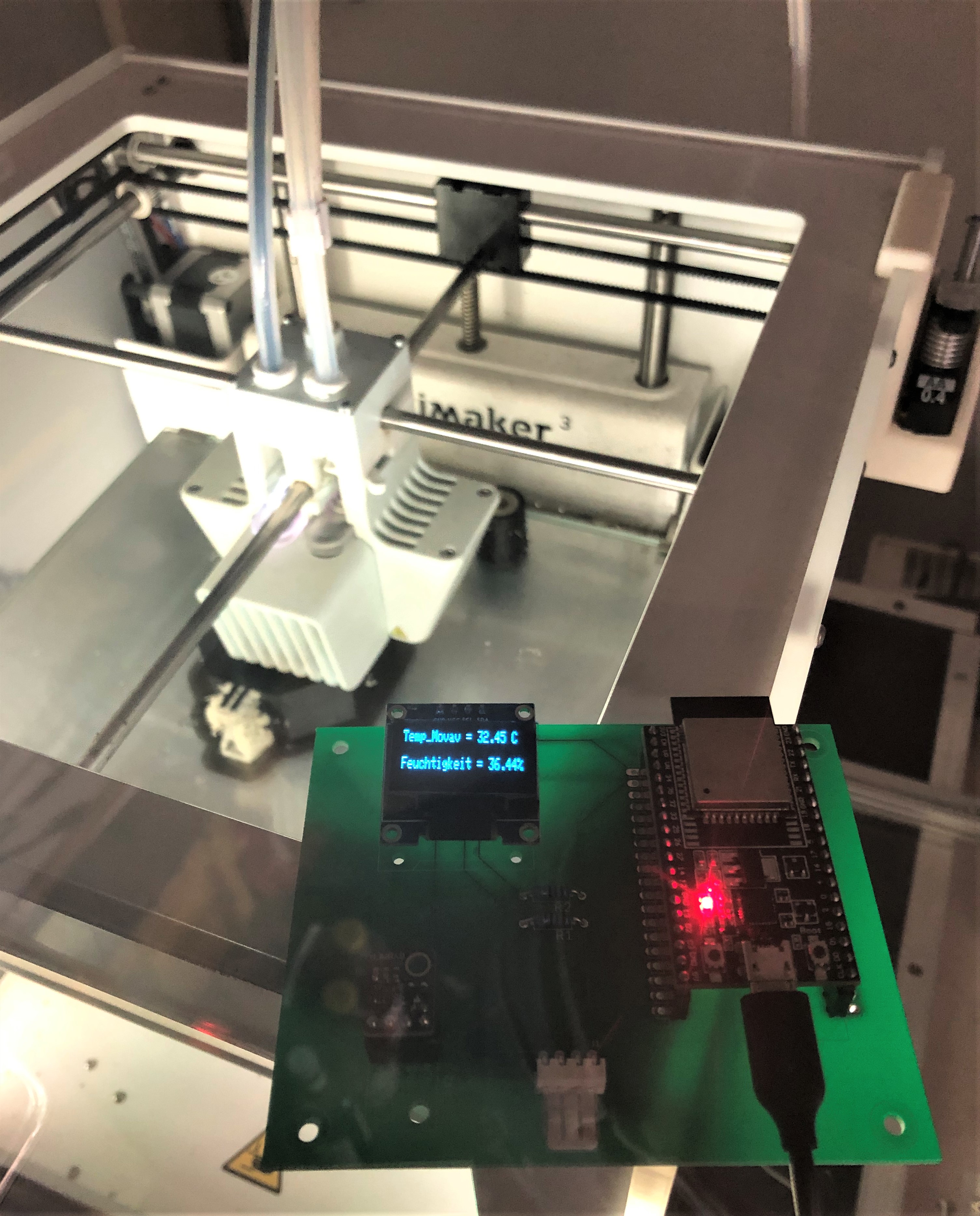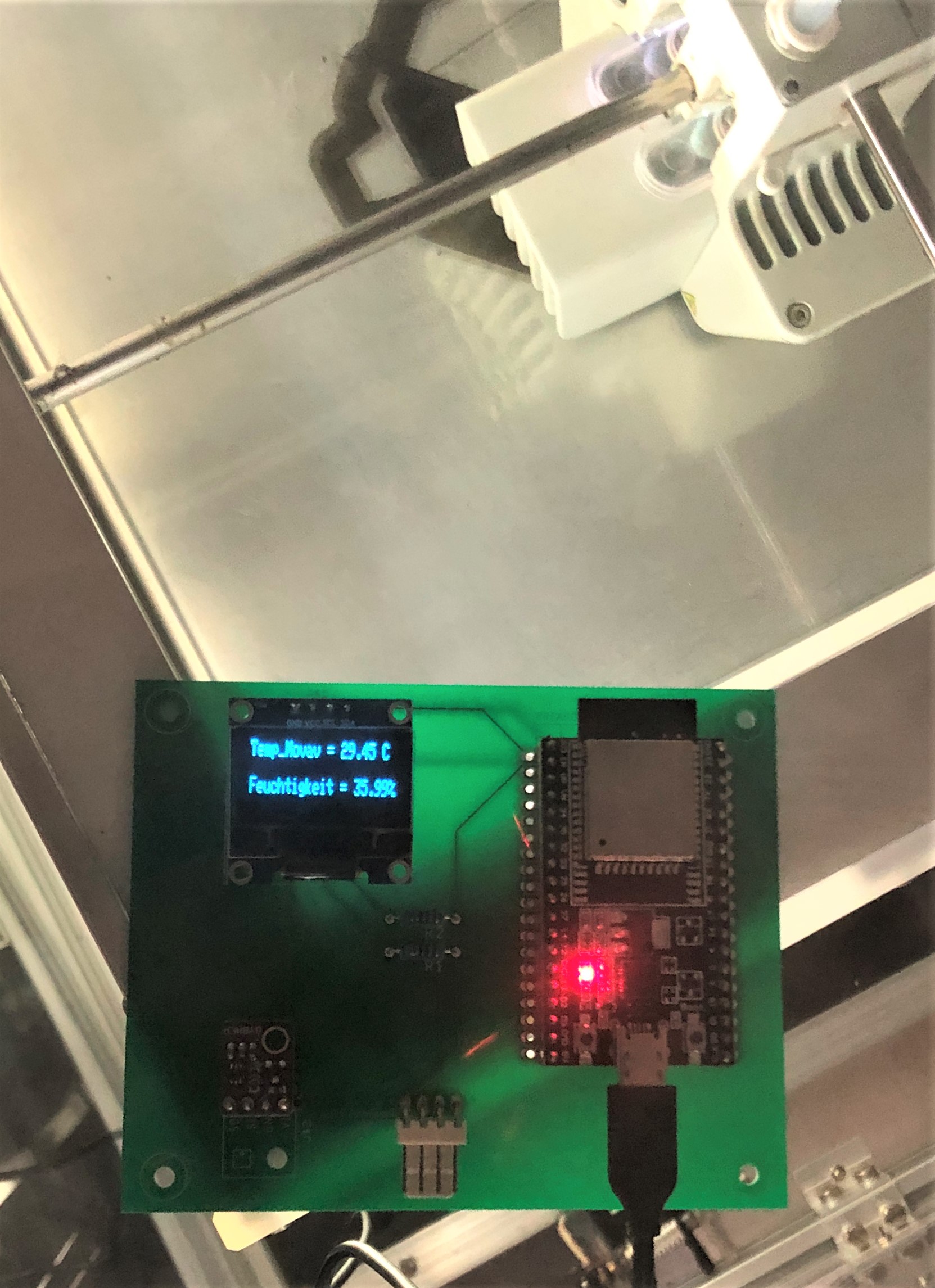 Änderung der Randbedingungen Der zweite Druck wurde an einem Dienstagmorgen gestartet. Während des 3D-Drucks wurde der Raum über die drei Tage hinweg gelüftet, wodurch keine stehende Hitze im Raum entstanden ist. Das PVA befindet sich hinter dem Drucker, jedoch nicht in einem Gehäuse. Luftfeuchtigkeits- und Temperatursensor Um zu überprüfen, ob die Theorie bezüglich der Luftfeuchtigkeit und der Temperatur stimmt, wird mithilfe eines Luftfeuchtigkeits- / Temperatursensors und eines Mikrocontrollers (ESP 32) die Feuchtigkeit in der Luft und die Temperatur gemessen. Die Daten werden dann direkt mittels eines kleinen Displays ausgegeben. Der Mikrocontroller wird mittels einer Powerbank mit Strom versorgt. Damit eine möglichst genaue Messung entsteht, wurde versucht den Sensor so nah wie möglich am Druckvorgang zu platzieren. Hierfür wurde der Aufbau oben auf den Drucker gelegt, ohne den Verfahrweg der Extruder zu stören.