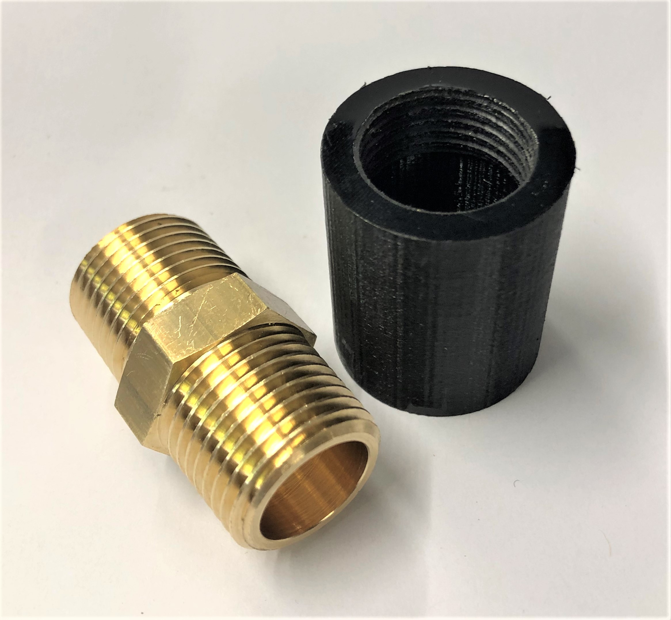 Gewindetest Bevor der Adapter mit PETG gedruckt wird, wird überprüft, ob der Doppelnippel mittels des reingeschnittenen Gewindes zuverlässig verbunden werden kann. Auf dem Bild links unten ist zum einen der Doppelnippel mit einem Außengewinde von 1/2" zu sehen und der 3D-gedruckte Adapter, mit dem dieser verbunden werden soll. Das Bild unten rechts zeigt, dass beide Bauteile perfekt mittels des Gewindes zusammengefügt werden können. Somit ist das Gewinde zuverlässig und das Bauteil kann im nächsten Schritt mit PA gedruckt werden.