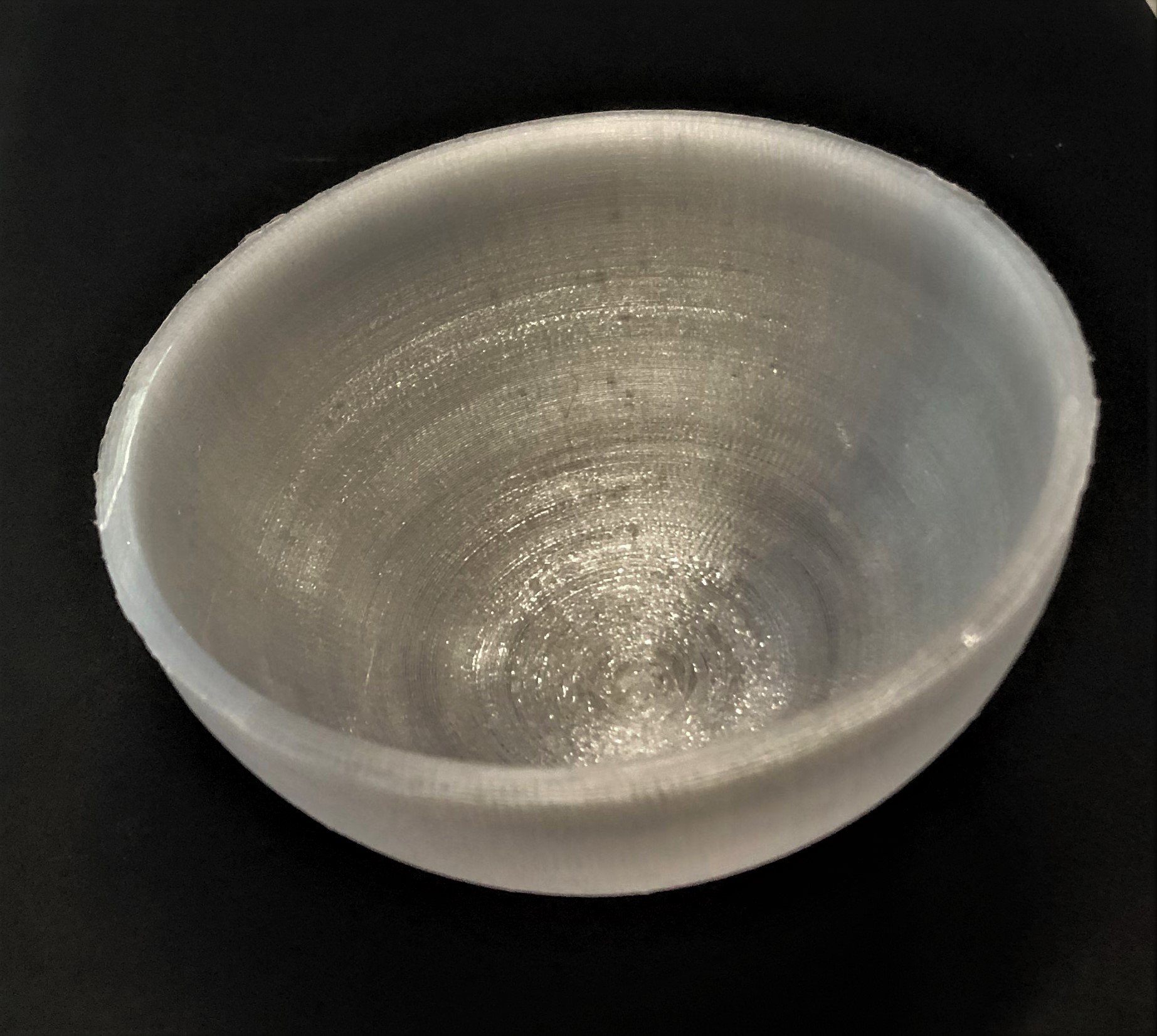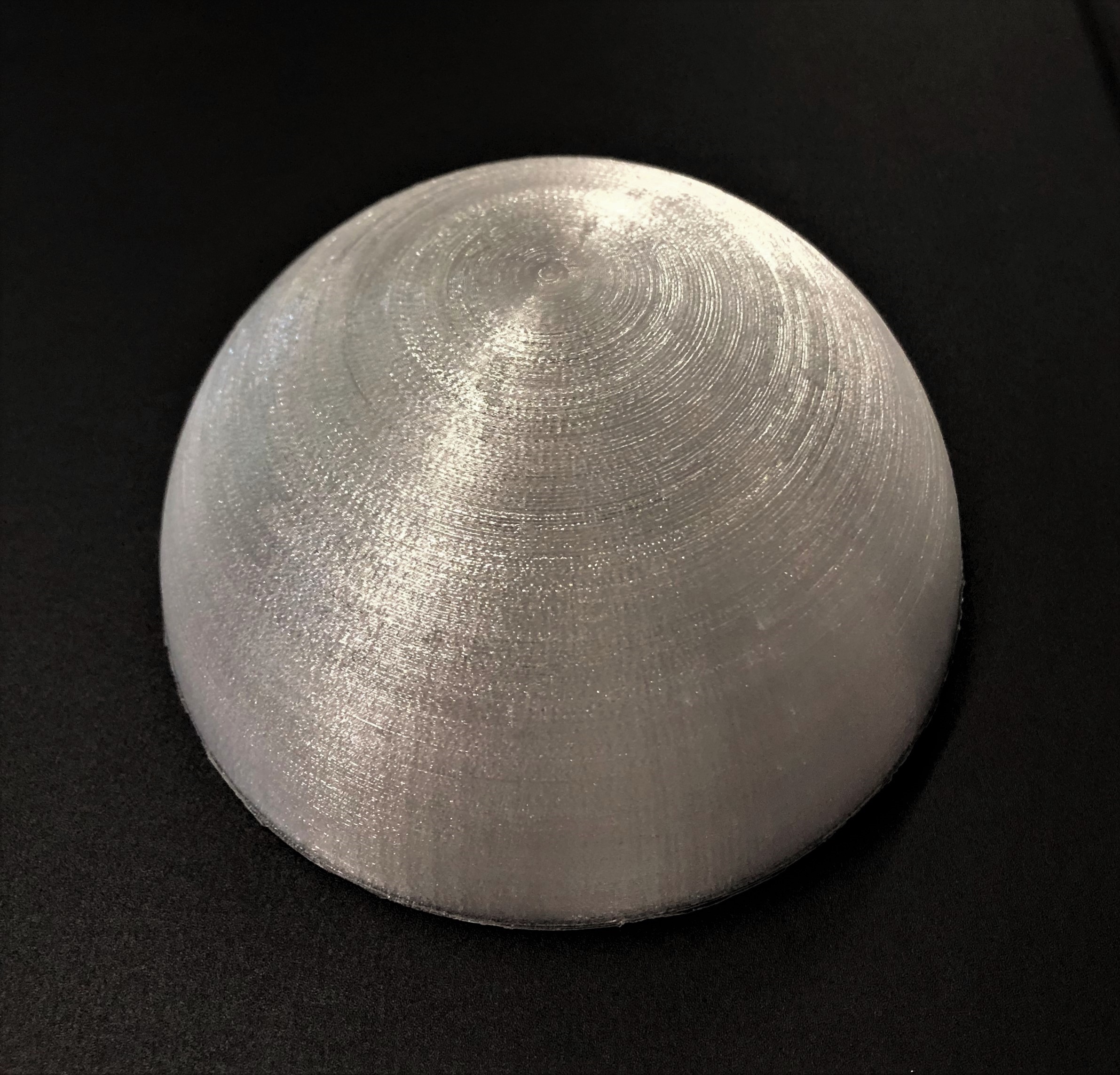 3D-Druck Halbkugel Das Druckergebnis der Halbkugel aus PC ist besser als erwartet. Es entsteht eine schöne, runde Form, wobei sich der Support gut hat lösen lassen, ohne das Bauteil zu beschädigen. Durch das Verringern der Rückzugsgeschwindigkeit des Extruders sind auch keine Filamentreste an der Halbkugel zurückgeblieben.