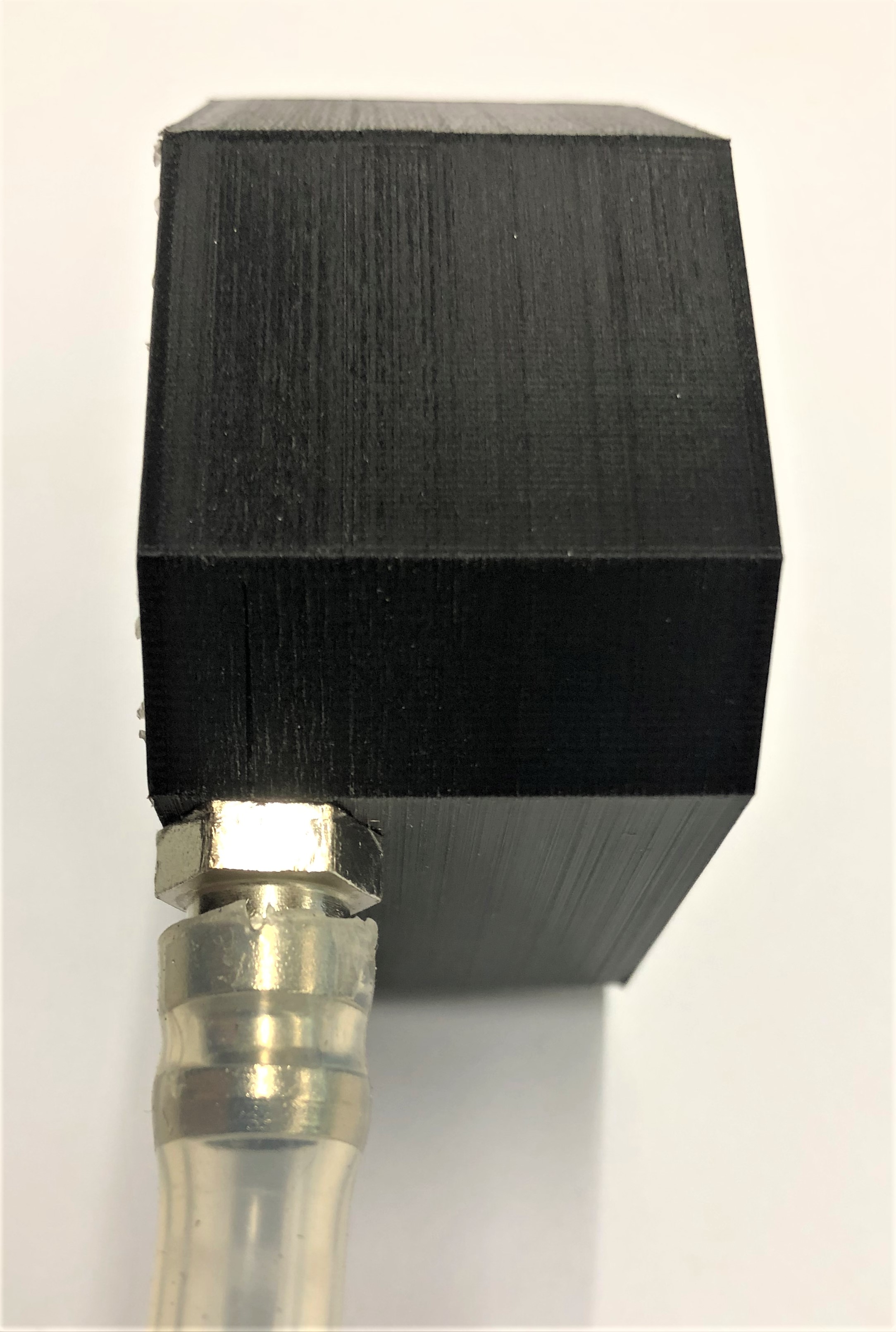 Dichtigkeitstest 1 Für den Dichtigkeitstest zwischen Schlauch und Verbindungsstück 2 wurden folgende Komponenten verwendet: - das gedruckte Bauteil - der Schlauch aus Silikonelastomeren mit einem Innendurchmesser von 6,5 mm und einem Außendurchmesser von 9,5 mm - der gedruckte Stopfen aus PA - 2 bar Druckluft - ein Gefäß mit Wasser. Für diesen Versuch wird der Schlauchanschluss des Verbindungsstücks mit dem Schlauch und einem Druckluftanschluss von mindestens 2 Bar verbunden. Die gegenüberliegende Seite des Bauteils wird mit dem Stopfen verschlossen. Somit soll überprüft werden, ob das Bauteil an sich dicht ist. Der Versuch zeigt, dass an beiden Verbindungsstellen, sowohl am Schlauchanschluss, als auch an der Seite des Stopfens, Luft austritt. Daher ist nicht ganz zu erkennen, ob das Bauteil wirklich dicht ist. Der Stopfen kann nicht wieder von Hand entfernt werden und muss zum Entfernen aufgebohrt und damit zerstört werden. Ein weiterer Dichtigkeitstest mit einem anderen Stopfen soll zeigen, ob das Verbindungsstück dicht ist. Dichtigkeitstest 2 Für den Dichtigkeitstest zwischen Schlauch und Verbindungsstück 2 wurden folgende Komponenten verwendet: - das gedruckte Bauteil - der Schlauch aus Silikonelastomeren mit einem Innendurchmesser von 6,5 mm und einem Außendurchmesser von 9,5 mm - ein Stopfen aus Gummi - 2 bar Druckluft - ein Gefäß mit Wasser. Auch für diesen Versuch wird der Schlauchanschluss des Verbindungsstücks mit dem Schlauch und einem Druckluftanschluss von mindestens 2 Bar verbunden. Die gegenüberliegende Seite des Bauteils wird mit dem Stopfen aus Gummi verschlossen. Somit soll überprüft werden, ob das Bauteil an sich dicht ist.