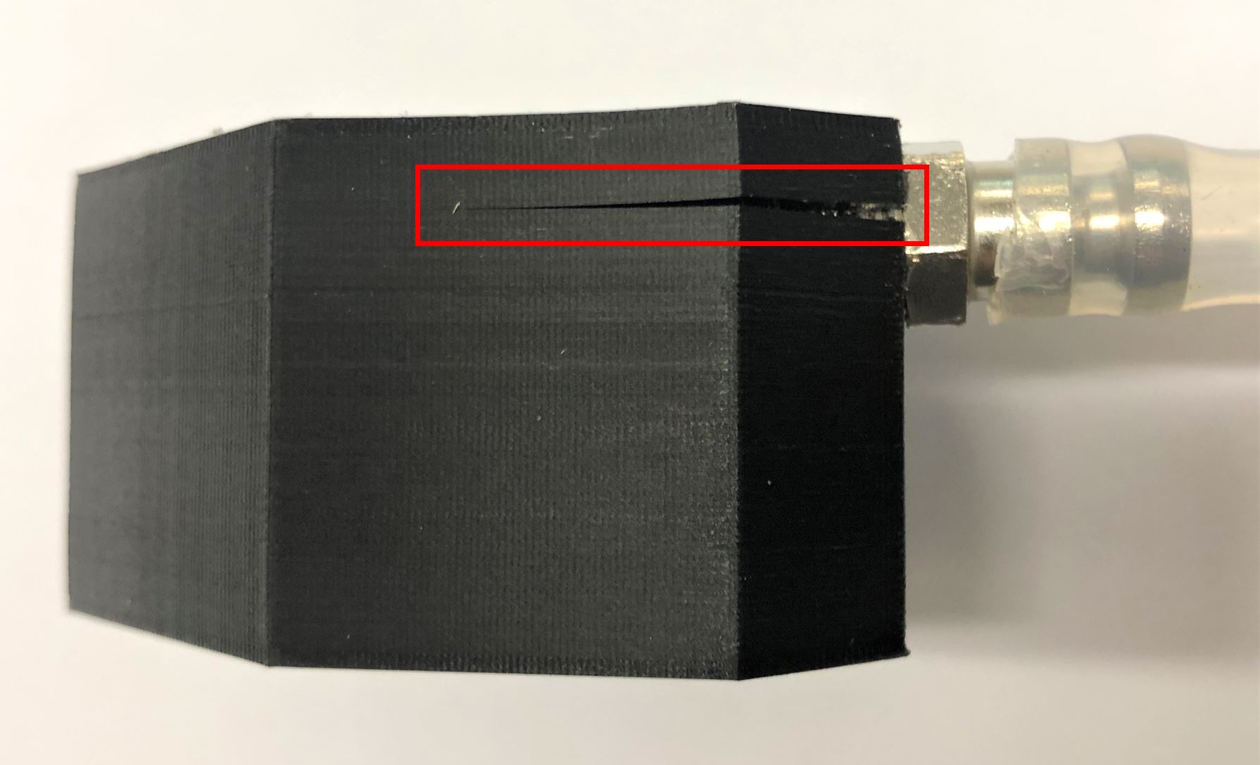 Das Kernloch mit dem Durchmesser 8,5 mm passt perfekt, jedoch entstehen beim Schneiden des Gewindes Risse zwischen den gedruckten Schichten im Bauteil (Abb. Alternatives Mischgehäuse Riss im Bauteil). Dadurch ist das Mischgehäuse beim Verwenden entweder undicht und wird durch den Druck von 2 Bar zerstört. Um das Risiko solcher Risse zu minimieren ist es wichtig, das Bauteil richtig in einem Schraubstock einzuspannen, wie im Bild unten links zu sehen ist, wobei auch hier minimale Risse zu erkennen sind.