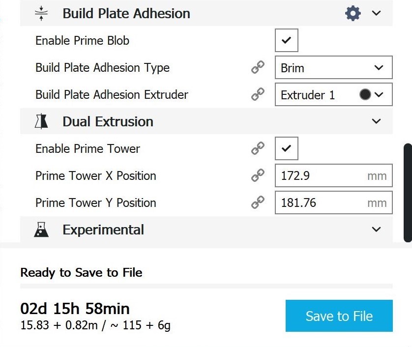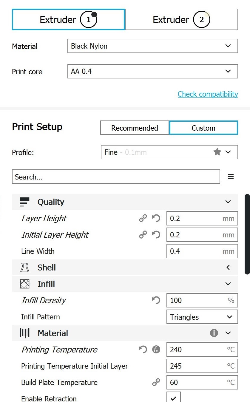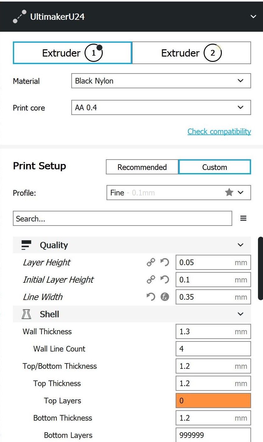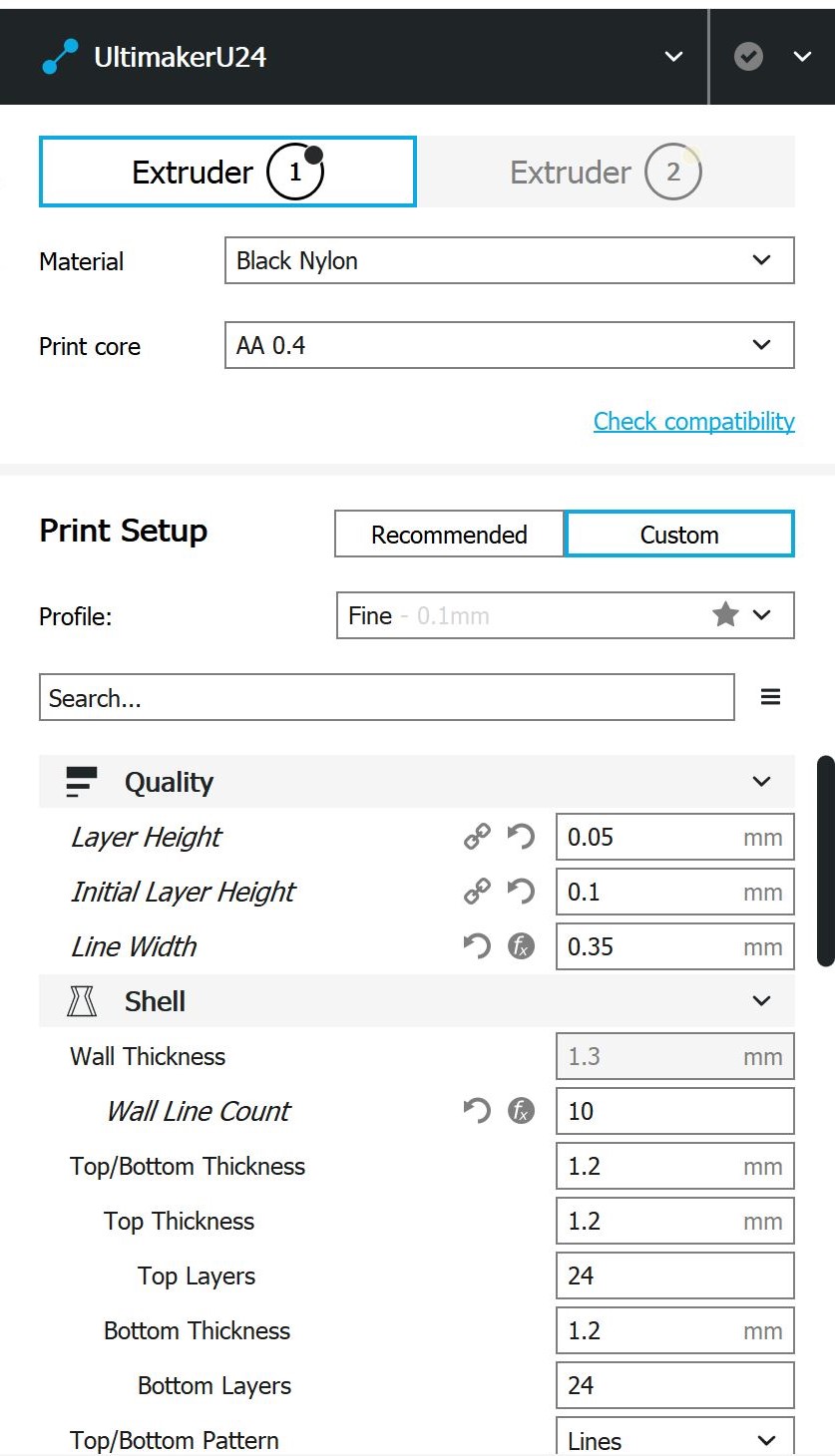 Cura-Einstellungen Mischgehäuse Da es sich hierbei um ein viel größeres und massiveres Bauteil handelt im Gegensatz zu dem Testbauteil, müssen die Einstellungen in Cura angepasst werden. Extruder 1: PA