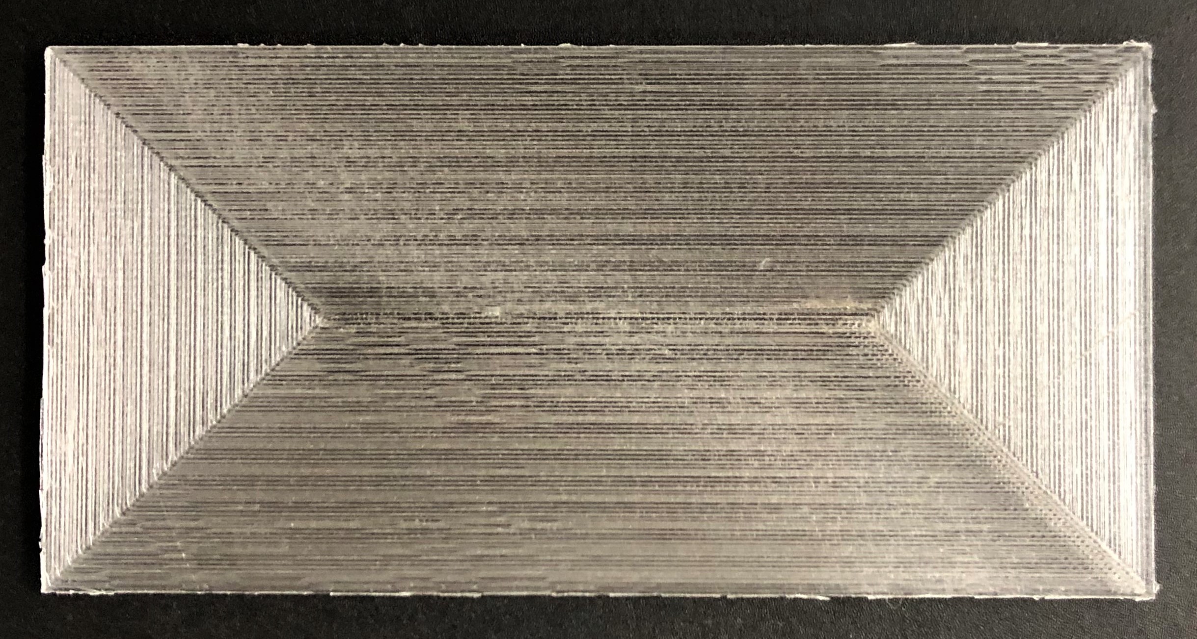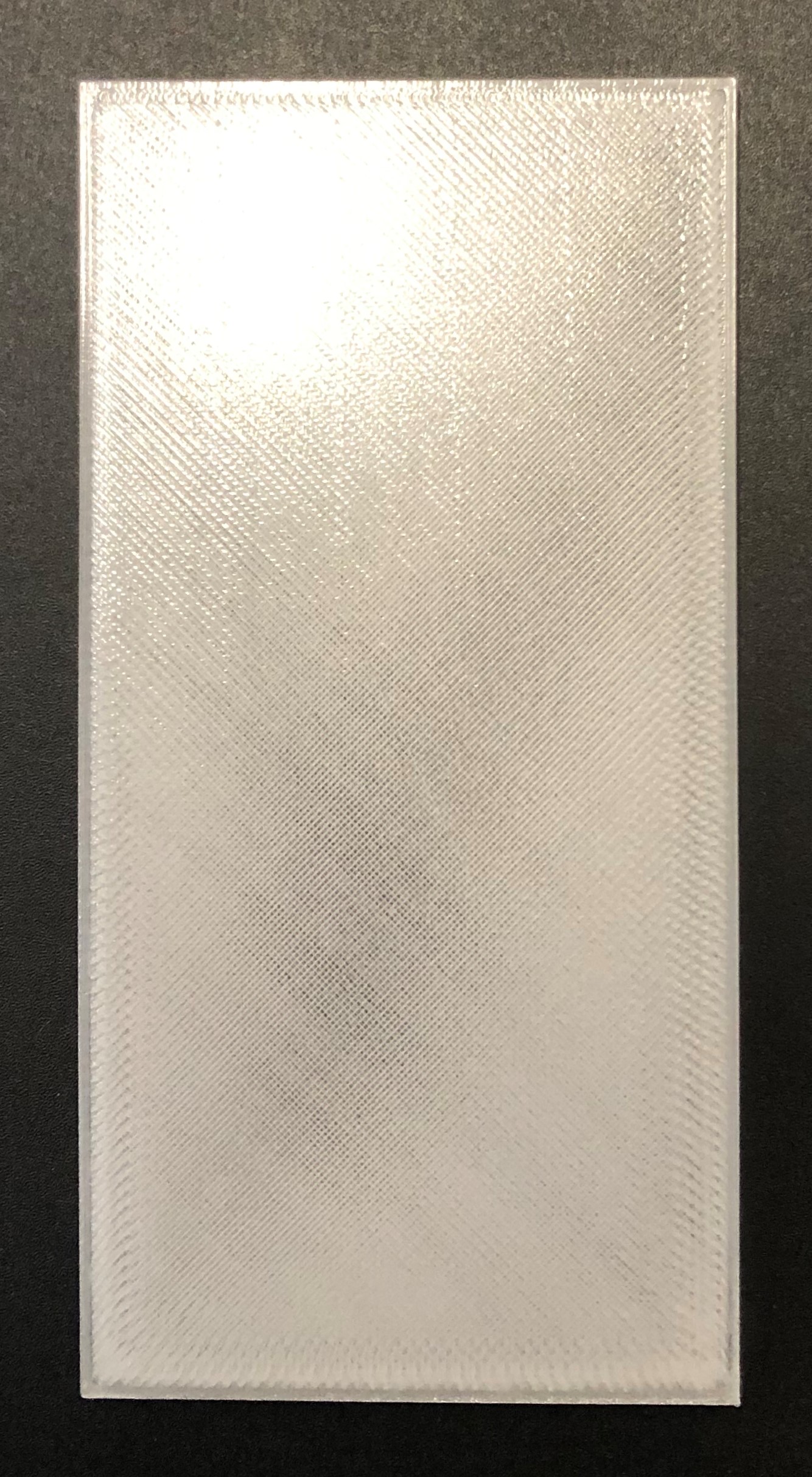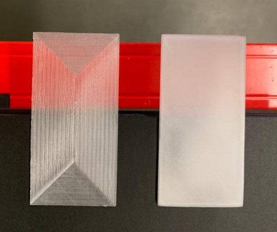 Ein weiterer Druckversuch mit veränderten Druckinstellungen soll zeigen, ob ein transparenter 3D-Druck möglich ist. Hierzu werden alle Cura-Einstellungen außer die Anzahl der Wände (Wall Line Count) beibehalten. Die Anzahl der Wände wird so hoch gesetzt, dass das Bauteil praktisch nur noch aus Wänden besteht. Dadurch werden die Schichten immer übereinander gedruckt und es entsteht kein Gittermuster. Schon vor der Nachbearbeitung der zweiten Platte ist ein deutlicher Unterschied zwischen den zwei Platten zu erkennen. Leider ist es auch hier unmöglich eine vollkommene Transparenz zu erreichen.