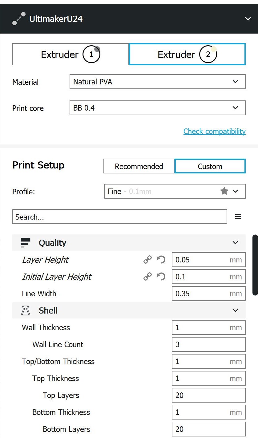 Die stl-Datei des Bauteils kann hier heruntergeladen werden. Cura-Einstellungen Folgendes Kapitel zeigt die Einstellungen in Cura, die verwendet wurden, um den Würfel zu drucken. Hierbei ist das Drucken mit zwei Extrudern erforderlich: Das Filament PA (Black Nylon) wird mit einem Extruder mit AA 0.4 Druckkern von Ultimaker und das Filament PVA (Natural PVA) mit einem Extruder mit BB 0.4 Druckkern von Ultimaker gedruckt. Dies wurde von Ultimaker selbst vorgegeben. Extruder 1: PA