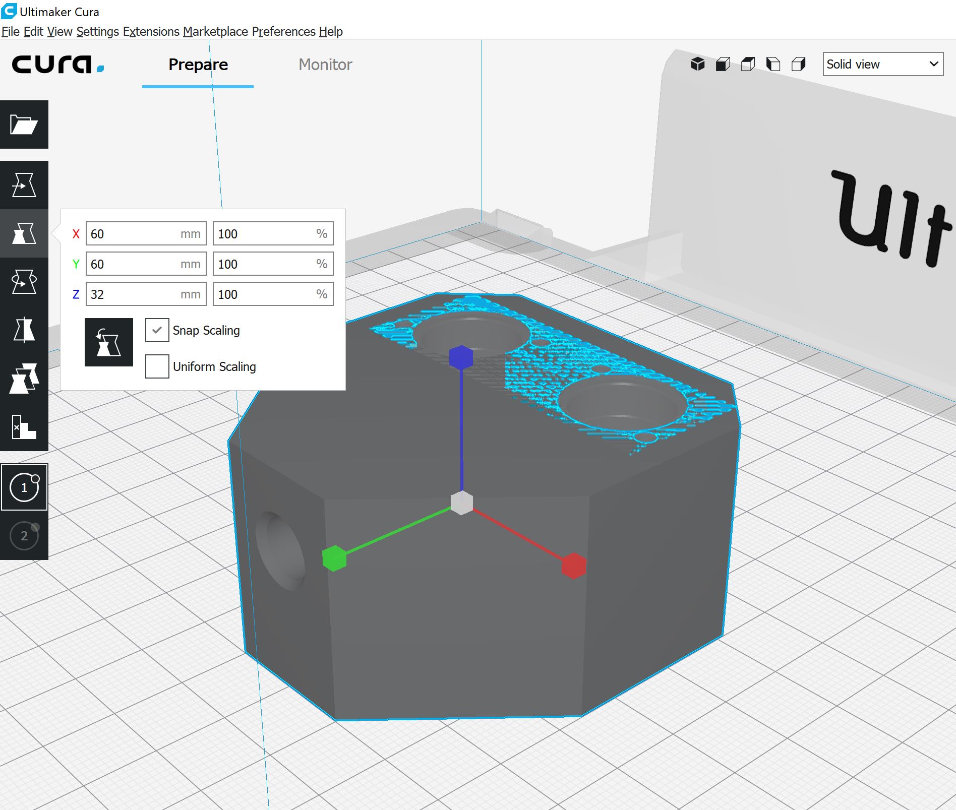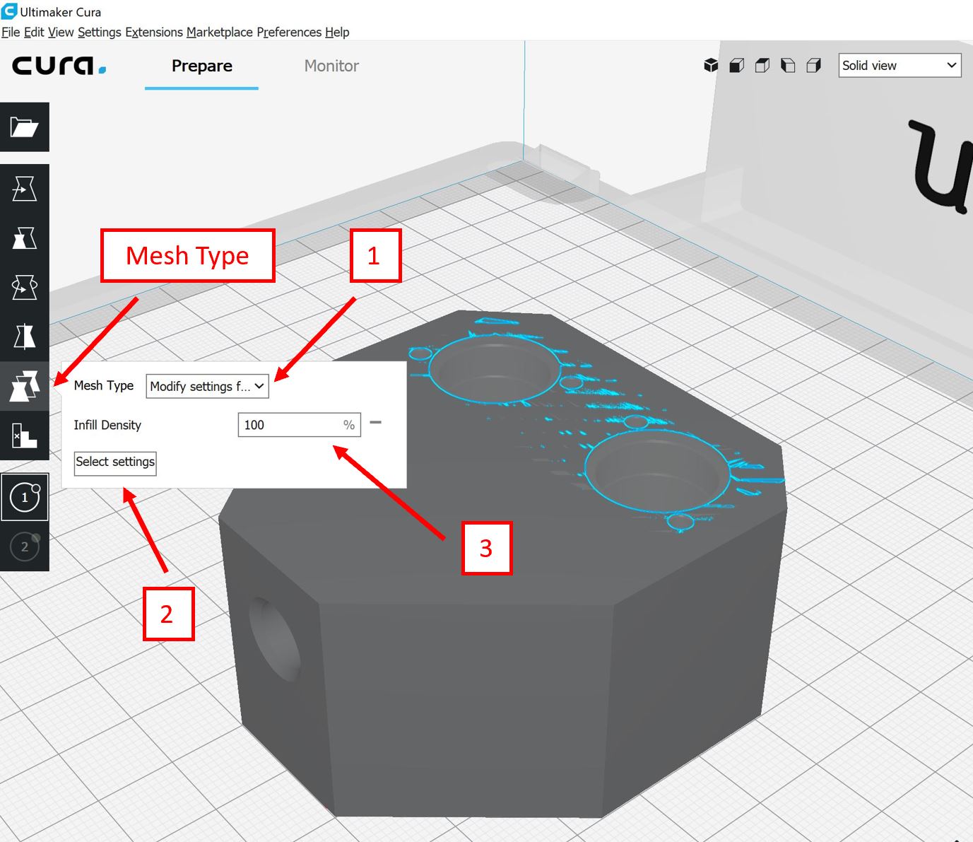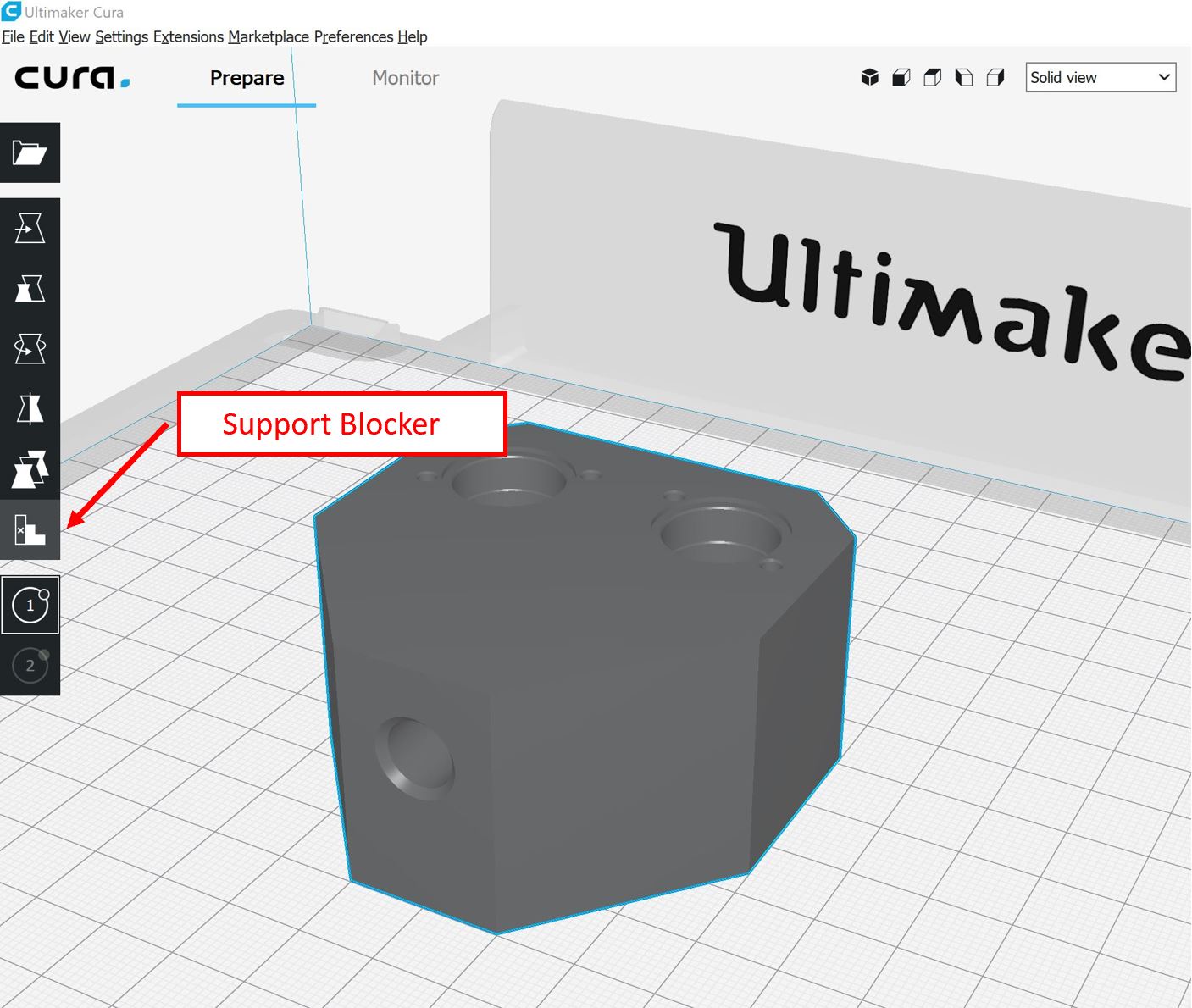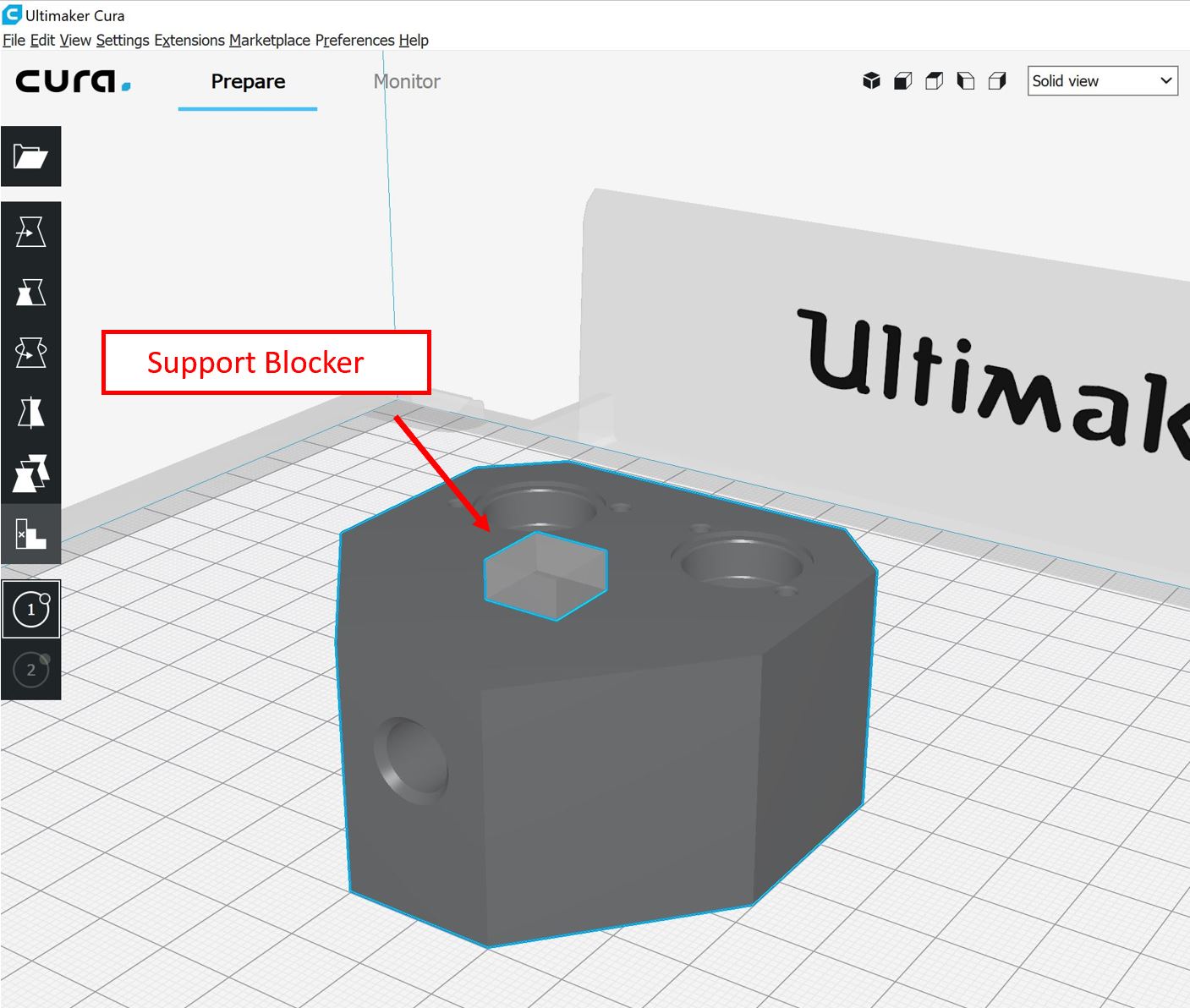 Änderung der Cura-Einstellungen alternatives Mischgehäuse Um das Problem der Verschlechterung der Aufnahmen für die Ventile zu umgehen und um zu überprüfen, ob die oben genannte Annahme richtig ist, wird nur der vordere Teil bei dem Outlet mit einer Fülldichte von 50 % gedruckt, während der hintere Teil mit den Ventilaufnahmen und den Inlets massiv eine Fülldichte von 100 % erhalten soll. Ein dazugehöriges Tutorial kann hier angeschaut werden. Die Cura-Funktion Support Blocker soll dabei helfen dies umzusetzen. Hierfür wird das Modell in Cura geöffnet und die Einstellungen, die bereits bei dem Druck davor verwendet wurden, beibehalten. Nun klickt man im ersten Schritt das Modell an und daraufhin den Button Support Blocker, der auf der linken Icon-Leiste zu finden ist. Bei erneuten Klick auf das Modell erscheint ein Block.