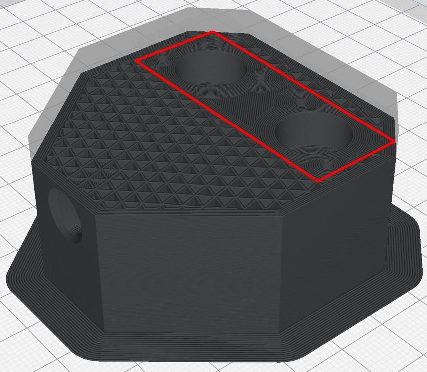 Dieser Block kann nun skaliert, auf den gewünschten Bereich angepasst und an die richtige Position gesetzt werden. Im unteren Bild ist der Block nun in blau im eigentlichen Bauteil zu erkennen. Abb.: Support Blocker - Schritt 3 Im vierten Schritt klickt man nun auf den Block, falls dieser noch nicht aktiviert ist, und daraufhin auf den Button Mesh Type, welcher auch auf der Icon-Leiste links zu finden ist. Hier wählt man die Funktion Modify settings for onfill of other models (1) aus. Durch den Button Select settings (2) können nun alle Druckeinstellungen bezüglich dieses Blocks geändert werden. In diesem Fall wurde nur die Fülldichte angepasst (3). Abb.: Support Blocker - Schritt 4 Schaut man sich dann die verschiedenen Layer an, ist der Unterschied der Fülldichte klar zu erkennen. Zu sehen ist dies im rot eingerahmten Bereich in folgendem Bild. ![]() Abb.: Support Blocker - Layer View Zweiter 3D-Druck alternatives Mischgehäuse Der zweite 3D-Druck des alternativen Mischgehäuses ist sehr präzise und zeigt sowohl von Innen als auch von Außen eine hohe Qualität. Aus unersichtlichen Gründen ist der Druck jedoch nach ca. 80 % abgebrochen und wurde nicht vollständig gedruckt. Das Positive daran ist, dass an diesem Druck zu erkennen ist, dass die Innenkanäle auch ohne Support sehr gut gedruckt wurden. Auch der Support Blocker ist gut zu erkennen. Beim Gewindeschneiden sind wiederholt minimale Risse zu erkennen, weshalb die Konstruktion angepasst wird.