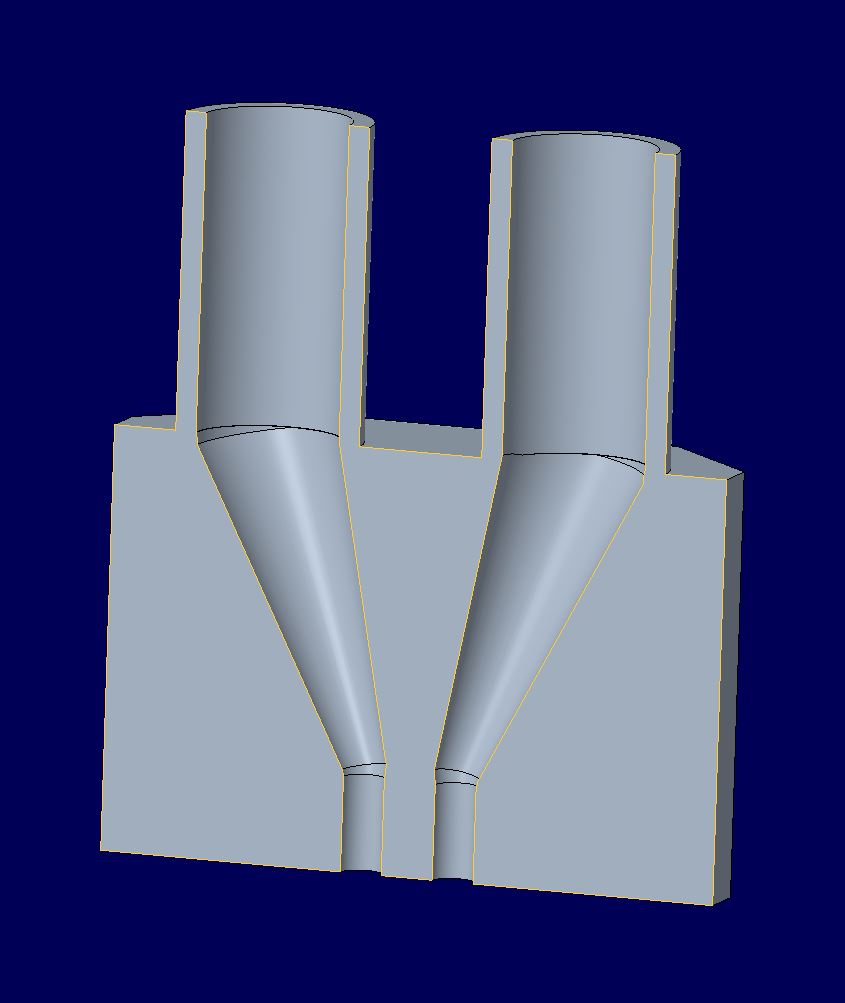 Daher stellte sich diese Lösung zu drucken als eher ungeeignet heraus. Es ergeben sich zwei Möglichkeiten das Bauteil auf andere Weise zu drucken, die im Folgenden beschrieben werden. Zweiter Probedruck Um auf den Support im Inneren des Bauteils verzichten zu können, wird das Mischgehäuse in zwei Teilen gedruckt. Hierfür wird die Ebene durch das Outlet als Schnittreferenz verwendet. Es entstehen die Teile, die in den unteren Bildern zu sehen sind.
