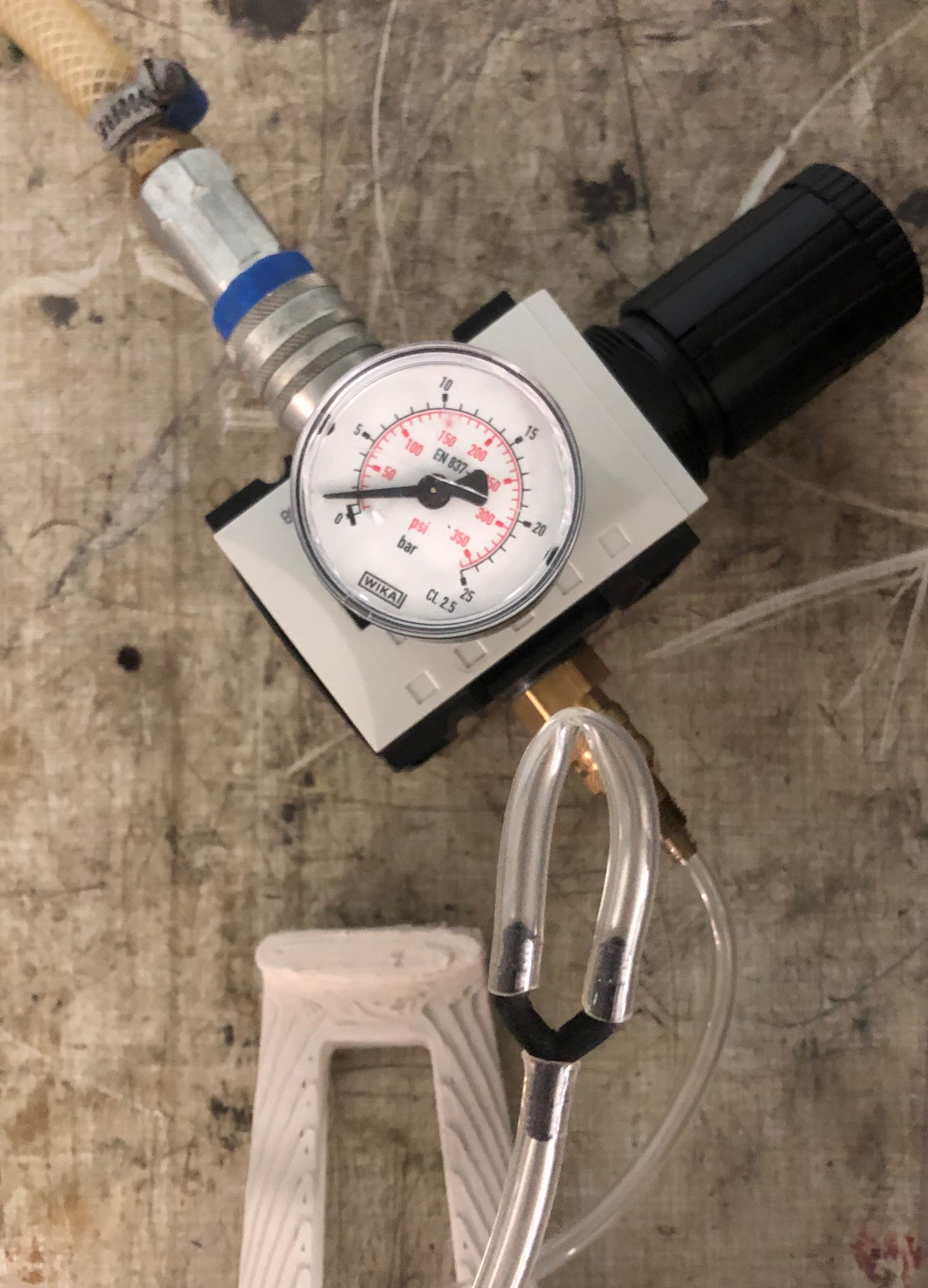 Dieser Versuch verdeutlicht auch hier wieder die undichten Stellen, wenn man den Versuchsaufbau unter Wasser hält und die 2 bar Druckluft angeschlossen sind, wie das Bild in der Mitte zeigt. Holt man das Y-Stück aus dem Wasser, so sind kleine Bläschen im Bild rechts zu sehen, die aus den Druckschichten heraustreten. Dies zeigt eine Undichtheit im Bauteil selbst und macht es unmöglich, die Dichtheit der Verbindung zu überprüfen. Ursache für dies könnten falsche Druckeinstellungen sein, die in einem zweiten Probedruck untersucht werden. Ein Versuch, dieses Problem auf eine andere Art zu lösen, wär die Verwendung einer Oberflächenveredelung. Hierzu eignet sich zum Beispiel lackieren. Lackieren Um die kleinen Löcher im Y-Stück zu schließen, soll es nun lackiert werden. Dadurch kann das Bauteil nicht nur dicht werden, sondern auch resistenter gegenüber Schmutz.