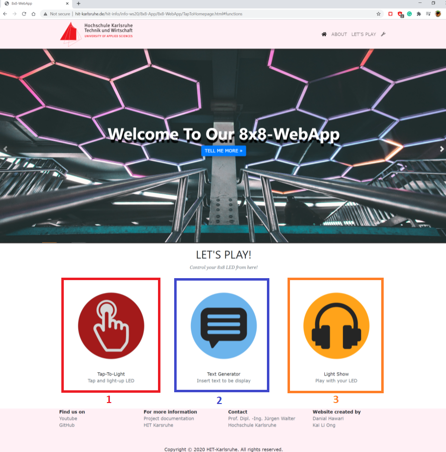 The WebApp has been divided into 4 pages which are the homepage and 3 functions: Tap-to-Light, Text Generator, and Light Show and 2 sections