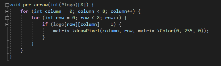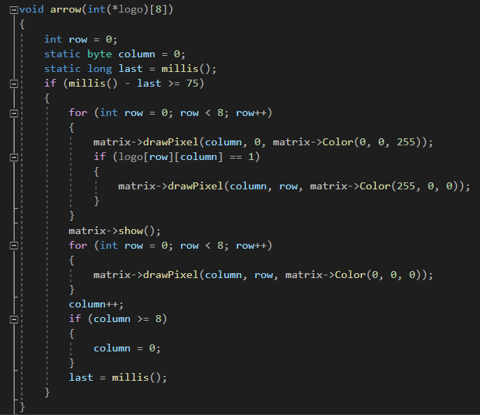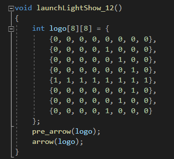 Um einen Eindruck von den vorprogrammierten Sequenzen zu bekommen, wird hier beispielhaft die Funktion Nr. 12 erläutert. Die Funktion launchLightShow_12() wird aufgerufen, sobald die entsprechende Informationen über das Datenpaket receivedMsg gesendet werden (u.a. "cmd": LightShow", "sel": 12). Hierbei wird eine 8x8-Matrix definiert, in welcher die später leuchtenden LEDs mit einer "1" festgelegt sind. In diesem Fall haben die Pixel die Form eines Pfeils. Außerdem werden die beiden Funktionen pre_arrow() und arrow() aufgerufen, die im Code jedoch schon über der Funktion launchLightShow_12() stehen. Hier werden sie der besseren Nachvollziehbarkeit halber anschließend aufgeführt. Der Funktion pre_arrow() wird die Matrix logo übergeben. Innerhalb dieser Funktion werden alle Pixel der Matrix bei Strat der Sequenz launchLightShow_12() mit der Farbe Grün belegt. In der danach aufgerufenen Funktion arrow() ist die eigentlich erkennbare Abfolge hinterlegt. Um die einzelnen Schritte der Abfolge für das menschliche Auge sichtbar zu machen, wird eine zeitliche Begrenzung benötigt, in der die Schritte nacheinander ablaufen sollen. Dies ist mit einer anfänglichen if-Schleife realisiert, die die aktuelle Systemzeit millis() nutzt. Somit wird nur alle 75 ms ein Schritt durchgeführt und kann mit dem menschlichen Auge nachverfolgt werden. Anschließend wird zum einen in der ersten Zeile ein blauer Punkt in Form eines Pixels schrittweise von links nach rechts bewegt. In der entsprechenden Spalte, in der sich dieser blaue Punkt gerade befindet, werden alle Grün leuchtenden Pixel zeitweise auf Rot gesetzt. Nach jedem Schritt werden alle Pixel auf schwarz geschaltet. Dieses kann man später jedoch kaum erkennen, da mit der Funktion pre_arrrow() sehr schnell alle Pixel wieder auf Grün gesetzt werden. Die Funktion launchLightShow_12() läuft so lange in Dauerschleife, bis eine neue Information von der Web-App gesendet wird. |