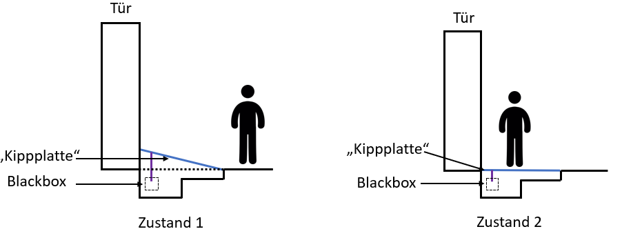 Kippplatte bzw. Rampe. Durch Auftreten der Person bewegt sich die